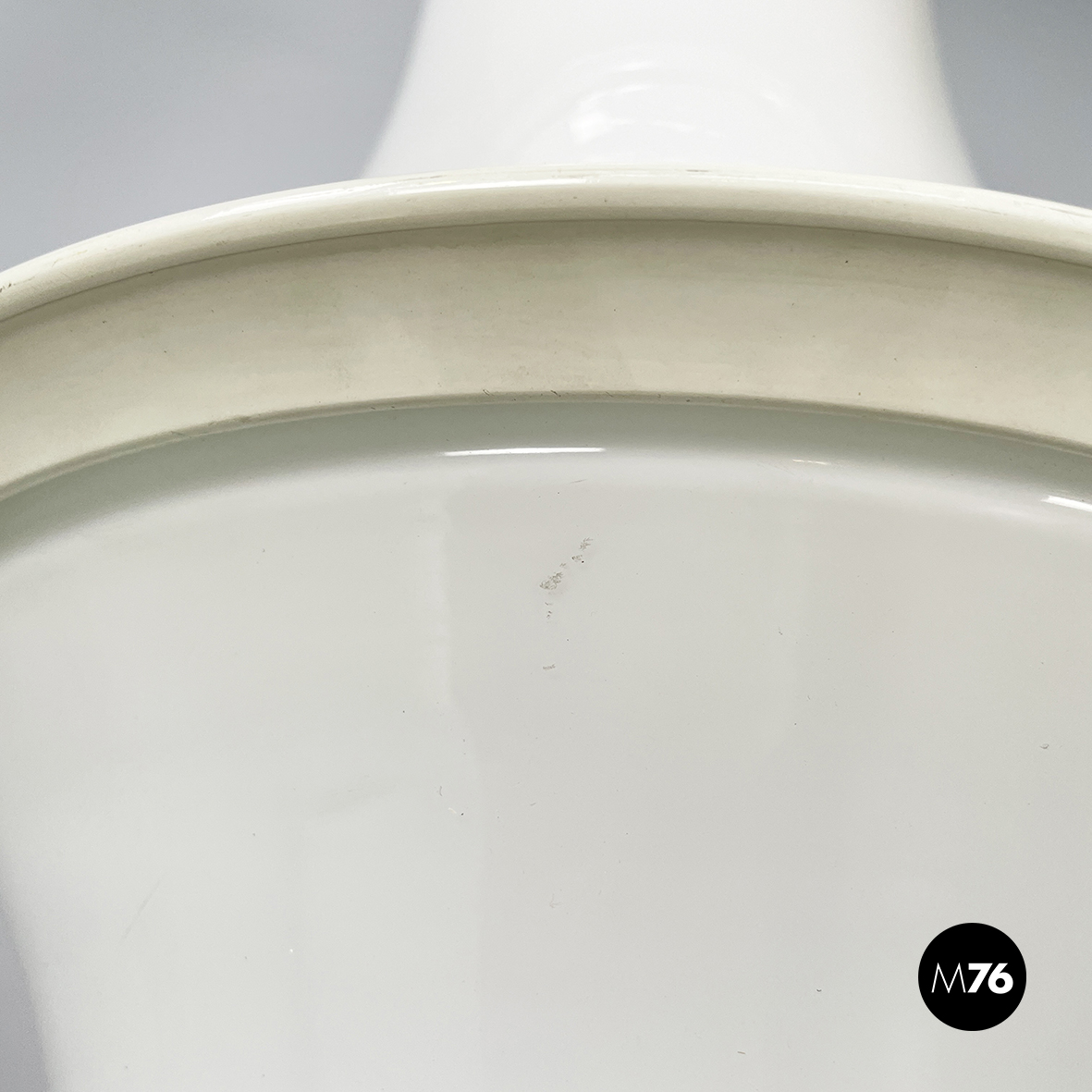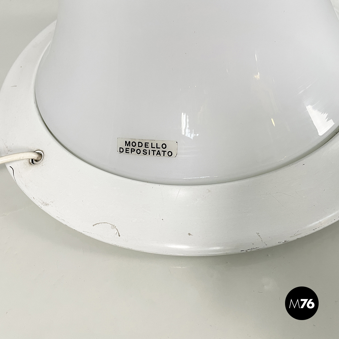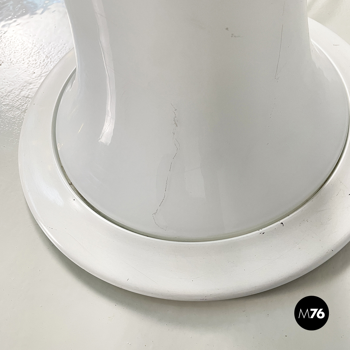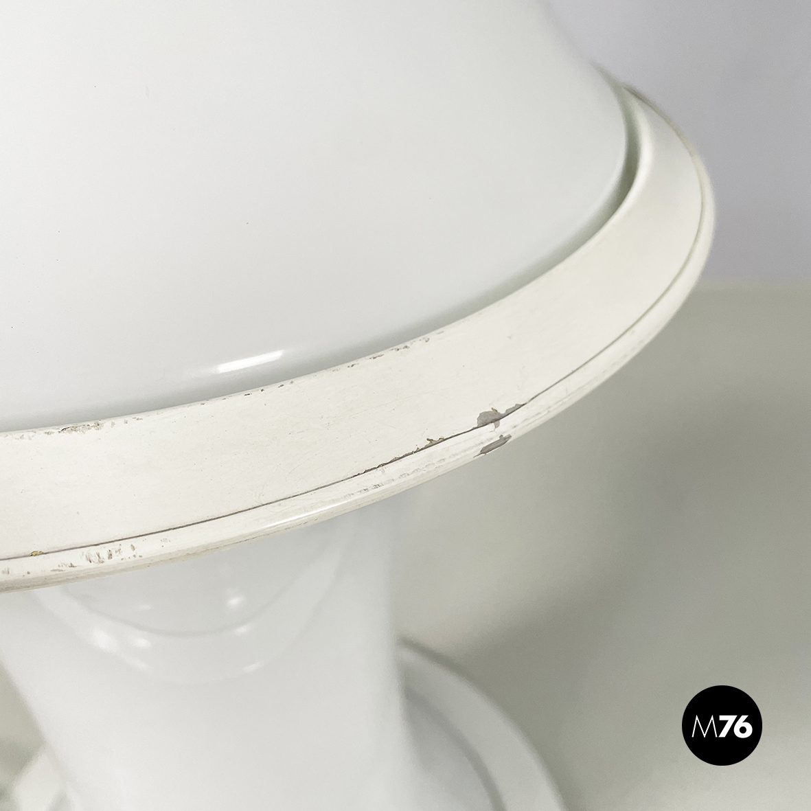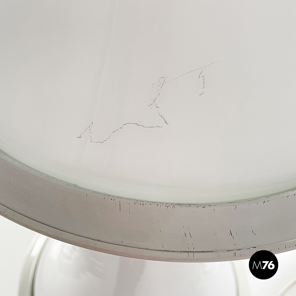 Lampada da terra modello Bamboo a base tonda. Il diffusore è composto da una serie di quattro parti in vetro opalino, leggermente più larghi agli estremi e più sottili al centro. I vetri sono divisi da parti a sezione tonda in metallo verniciato bianco.