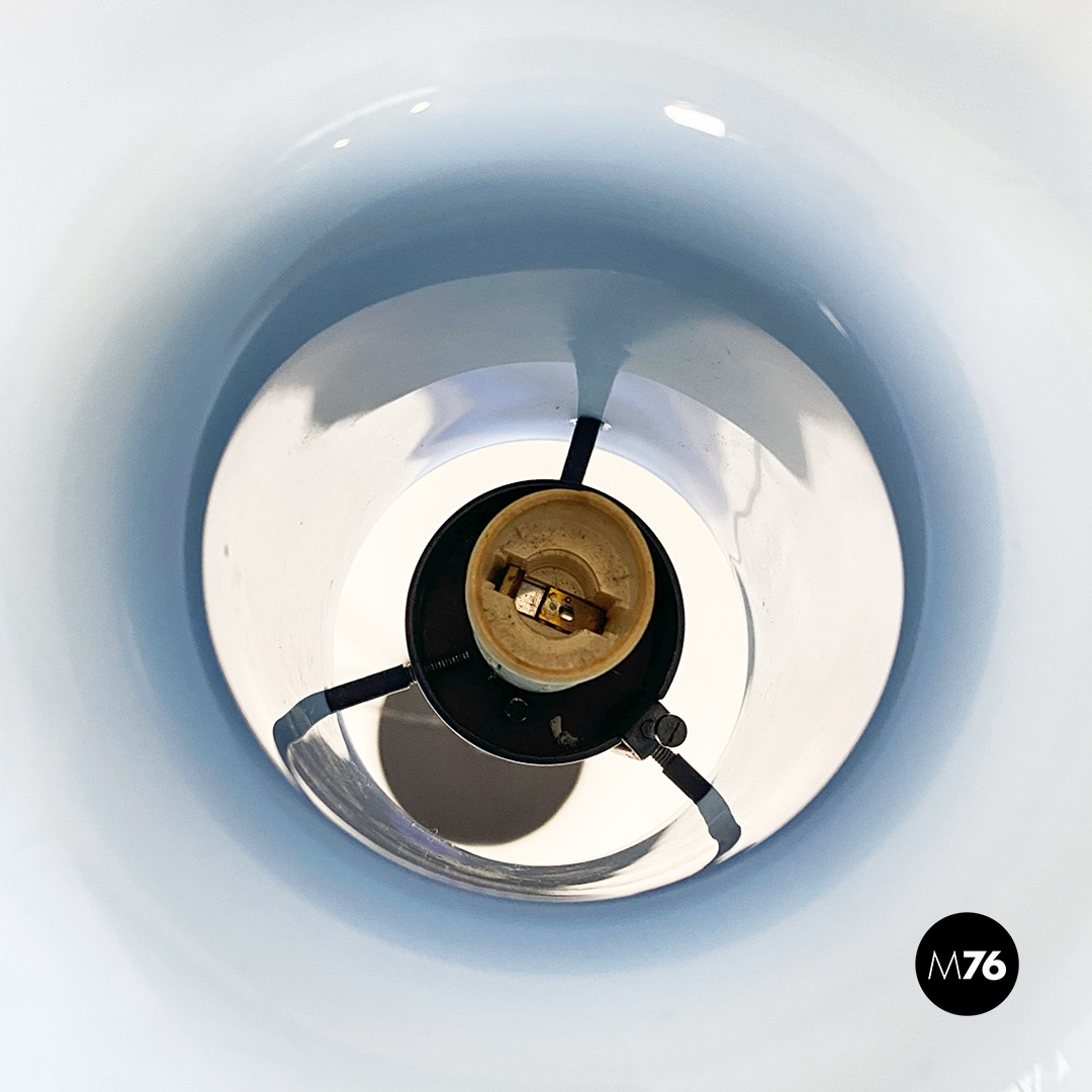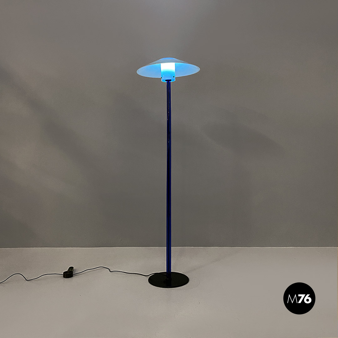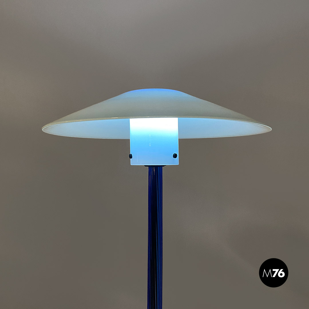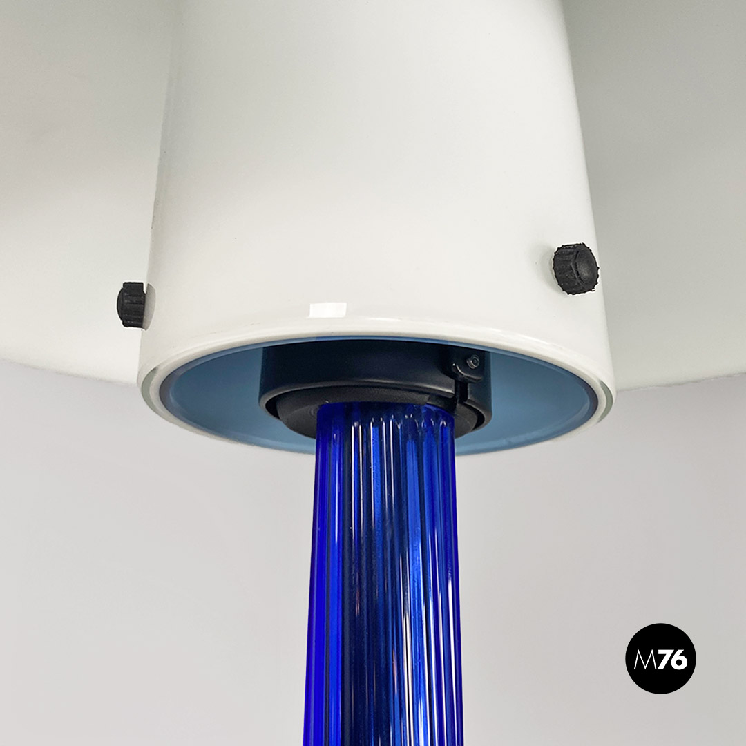 Lampada da terra modello Chiara con base tonda in metallo, stelo in vetro di Murano blu scanalato e paralume in vetro di Murano opaline bianco internamente e azzurro all’esterno.