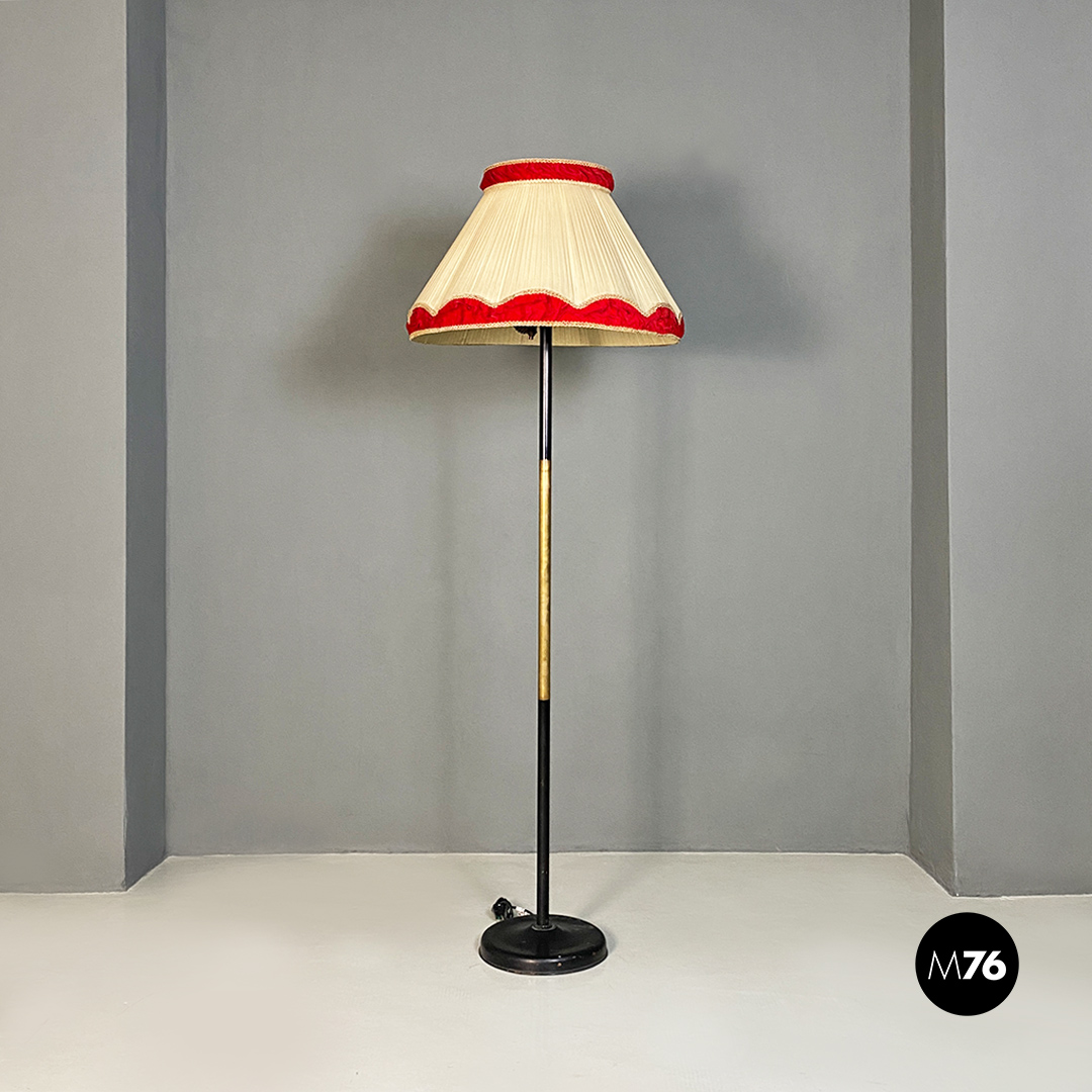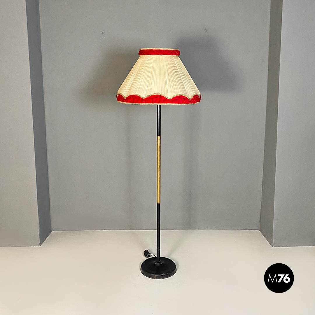 Lampada da terra con base tonda in metallo nero, stelo in metallo ed ottone e paralume in tessuto plissettato a tronco di cono sui toni del beige con parte superiore ed inferiore del diffusore in velluto rosso.