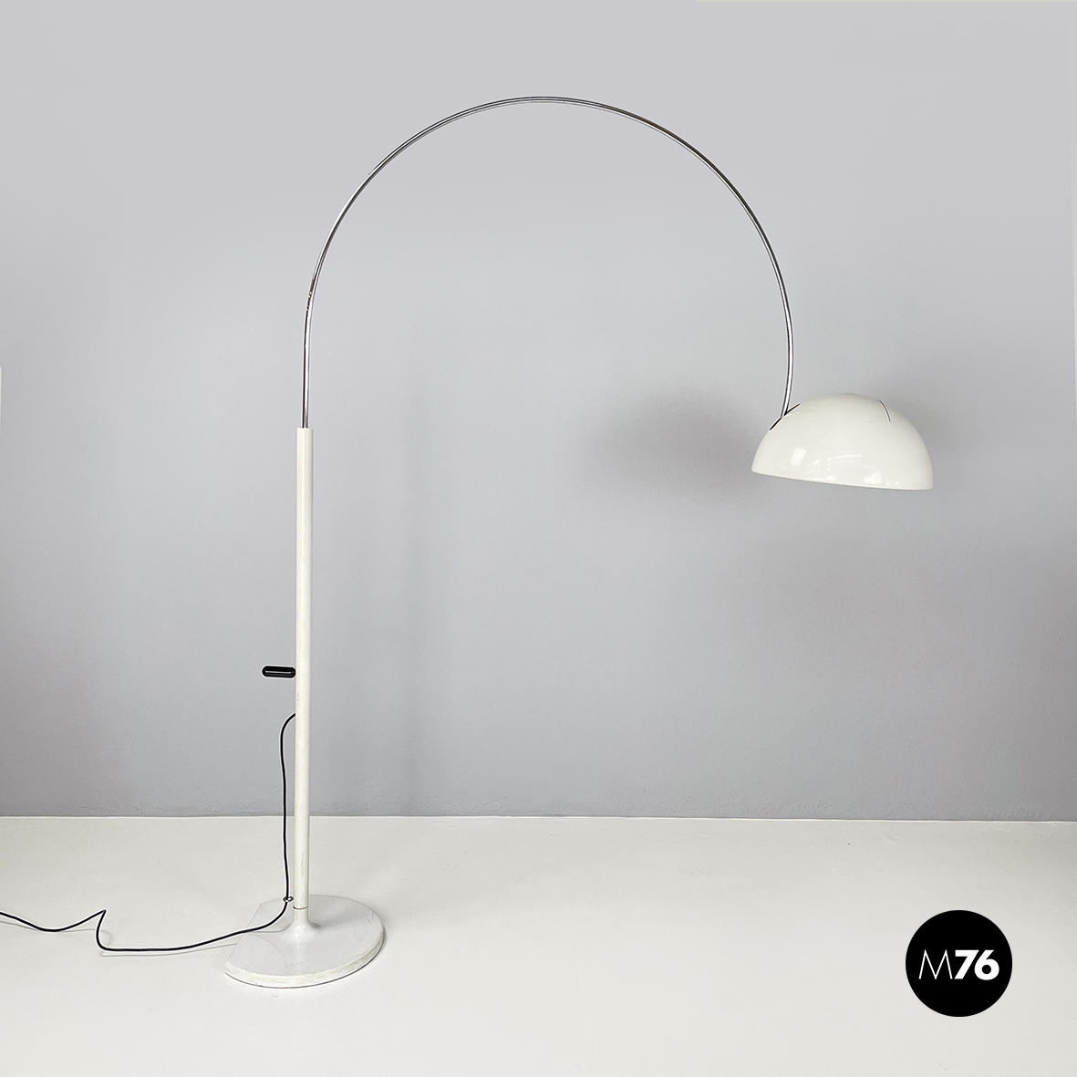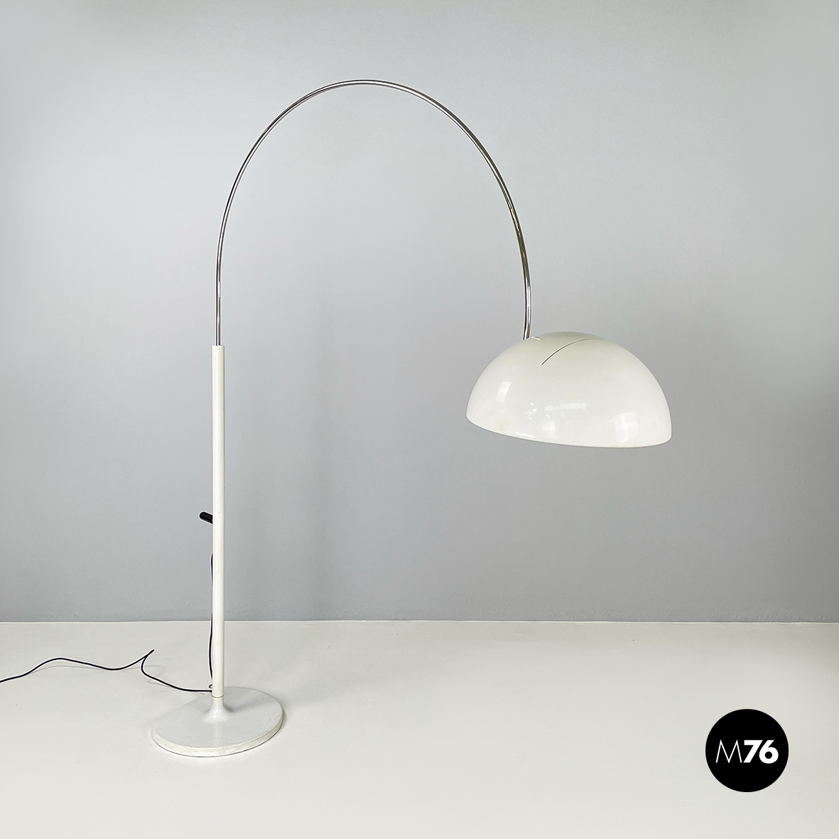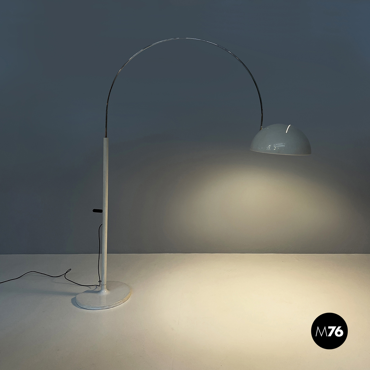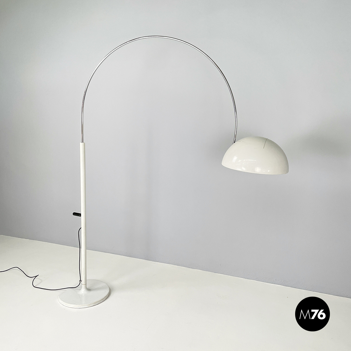 Lampada da terra orientabile modello Coupé 3320/R con paralume a cupola in metallo laccato bianco. All’interno del paralume è presente l’interruttore di accensione. La struttura ad arco orientabile è in tondino di acciaio cromato e metallo laccato bianco. Nella parte metallica è presente una sporgenza in metallo laccato nero. La base è tondeggiante in metallo laccato bianco.