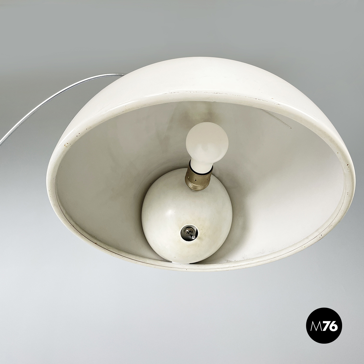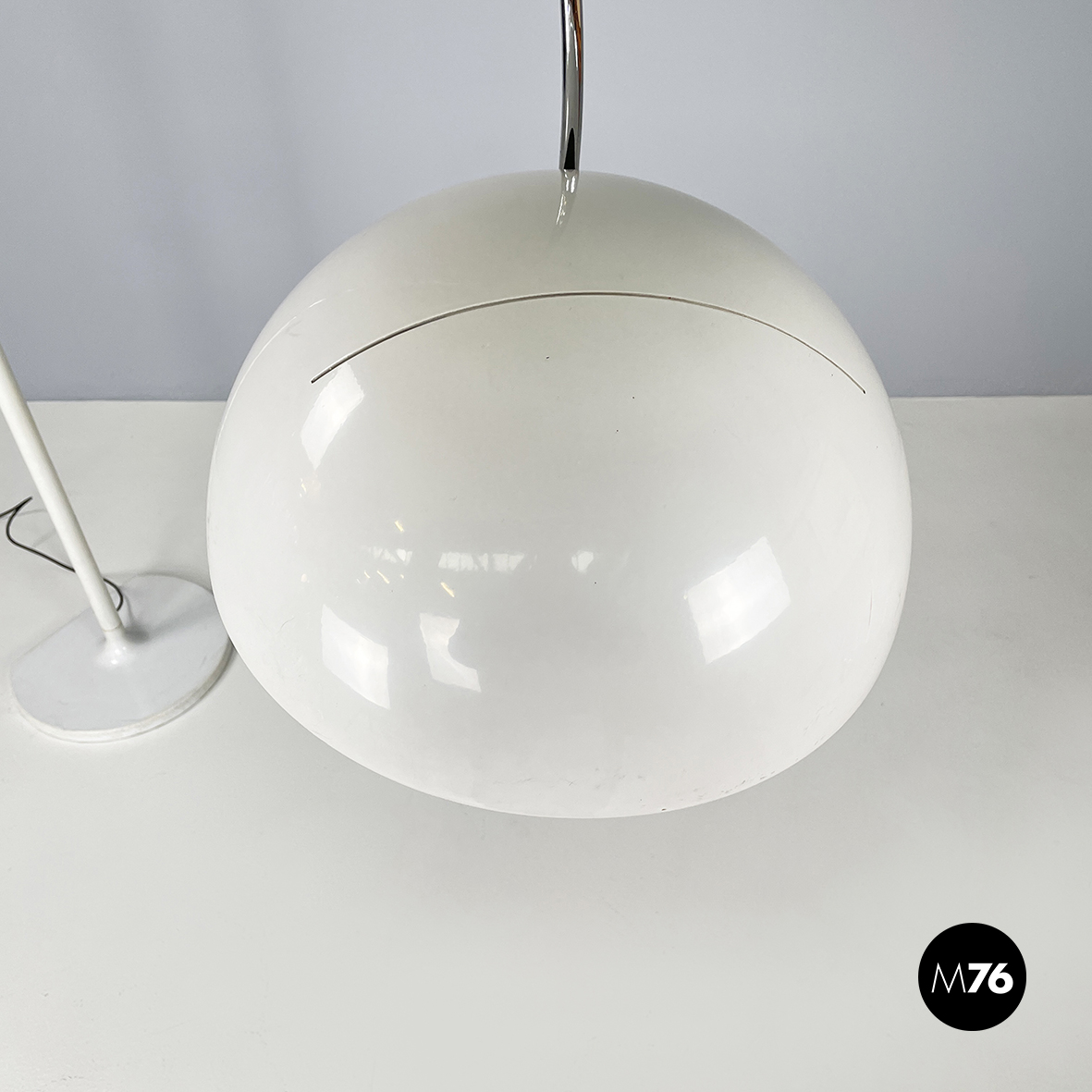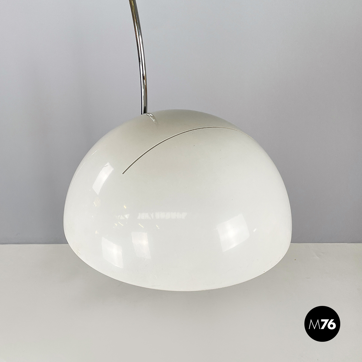Lampada da terra orientabile modello Coupé 3320/R con paralume a cupola in metallo laccato bianco. All’interno del paralume è presente l’interruttore di accensione. La struttura ad arco orientabile è in tondino di acciaio cromato e metallo laccato bianco. Nella parte metallica è presente una sporgenza in metallo laccato nero. La base è tondeggiante in metallo laccato bianco.