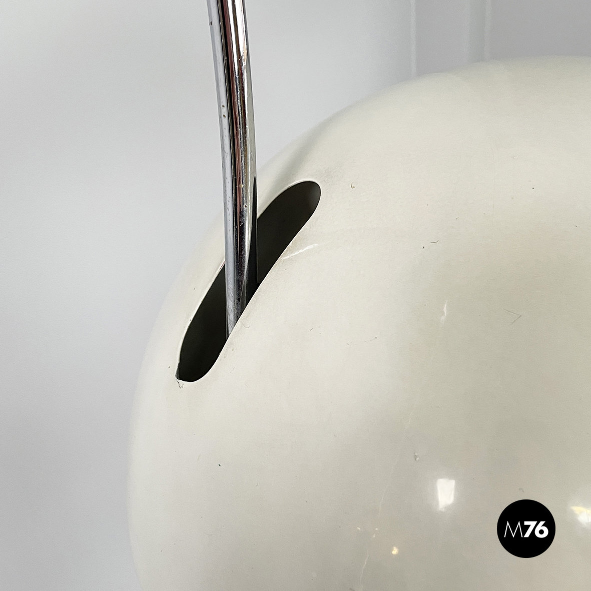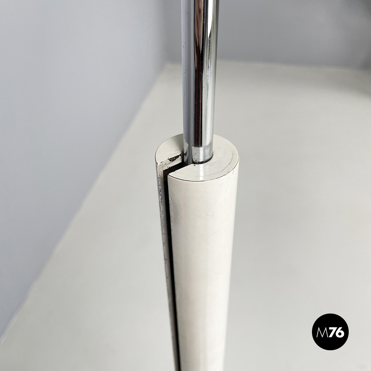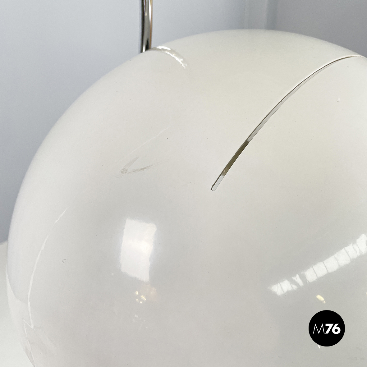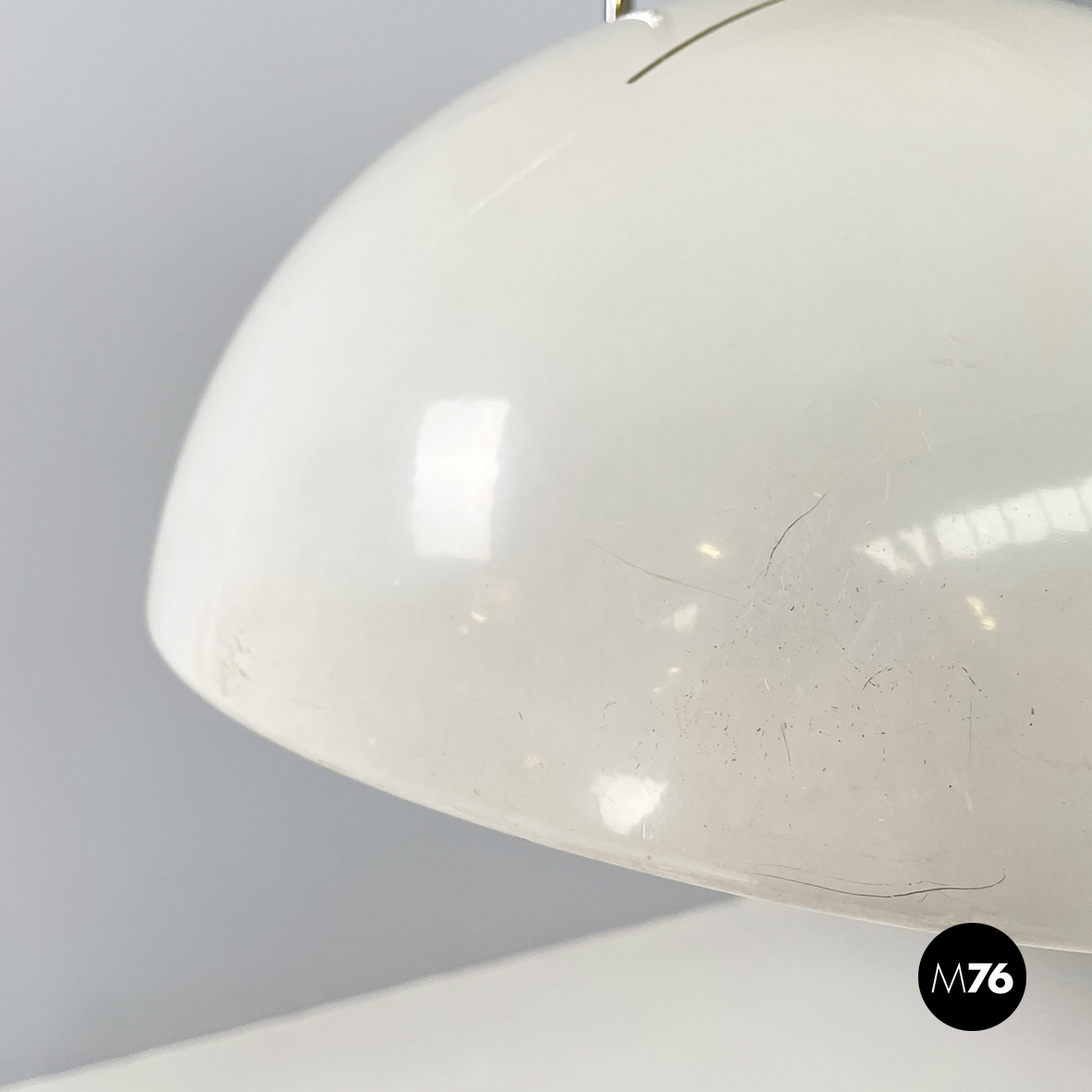 Lampada da terra orientabile modello Coupé 3320/R con paralume a cupola in metallo laccato bianco. All’interno del paralume è presente l’interruttore di accensione. La struttura ad arco orientabile è in tondino di acciaio cromato e metallo laccato bianco. Nella parte metallica è presente una sporgenza in metallo laccato nero. La base è tondeggiante in metallo laccato bianco.