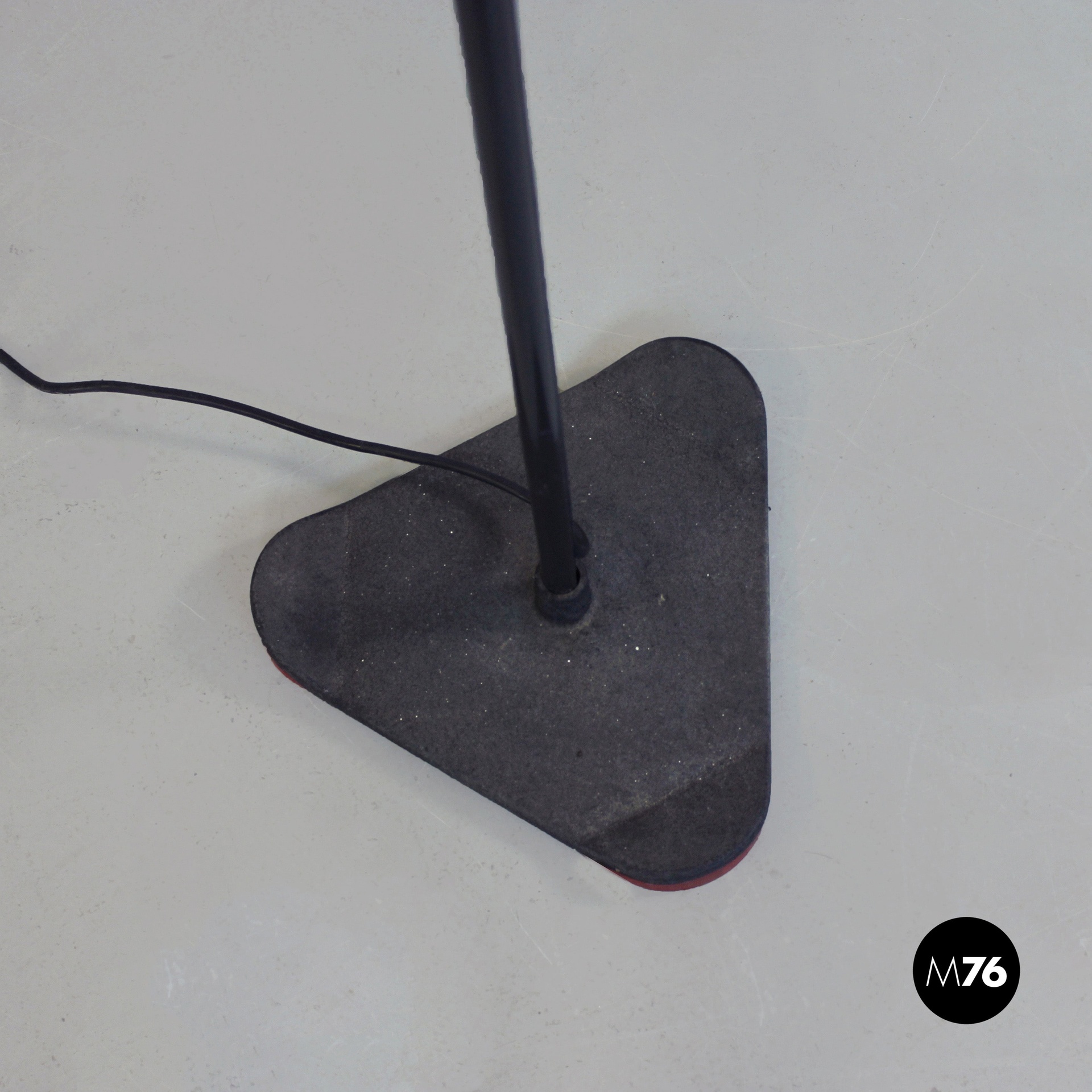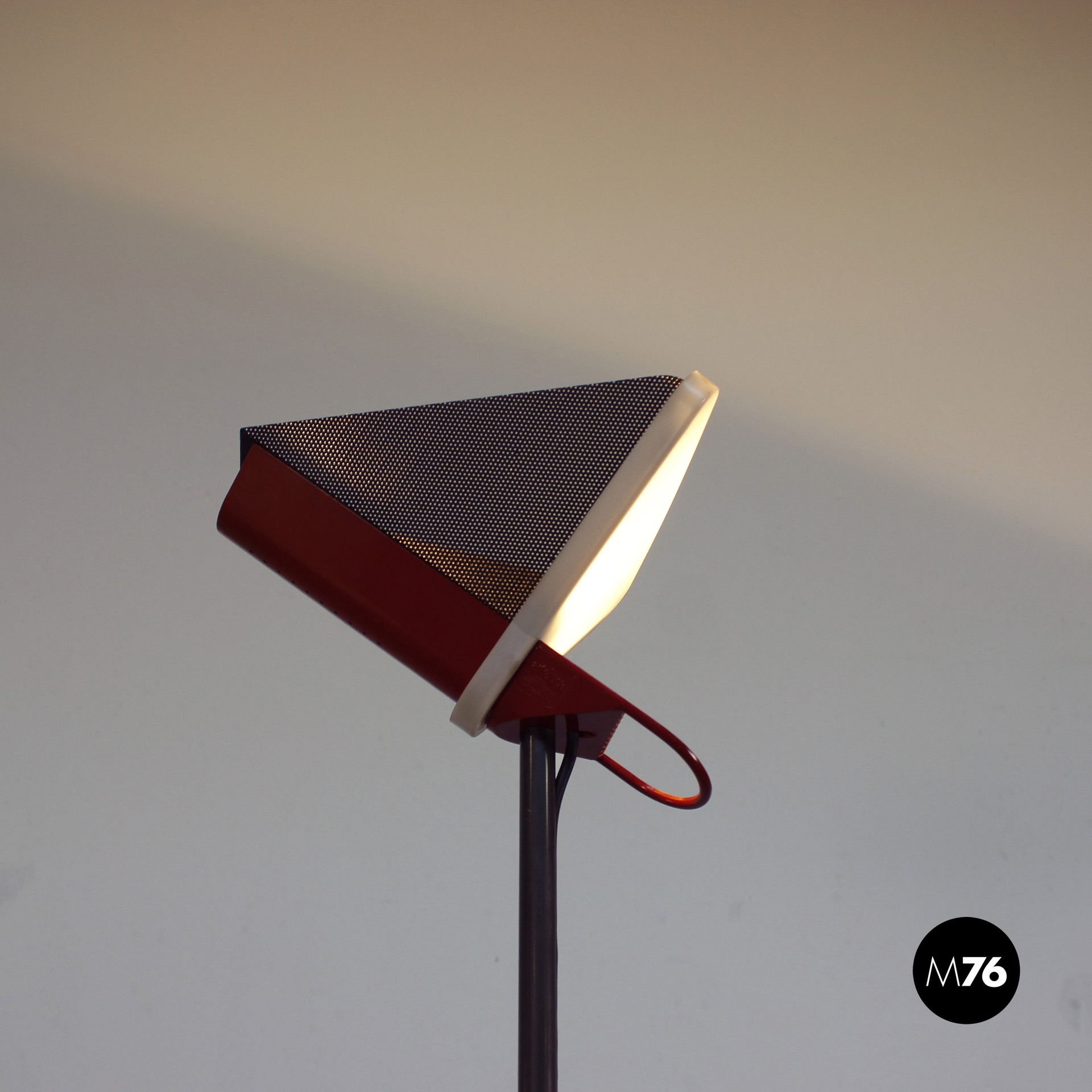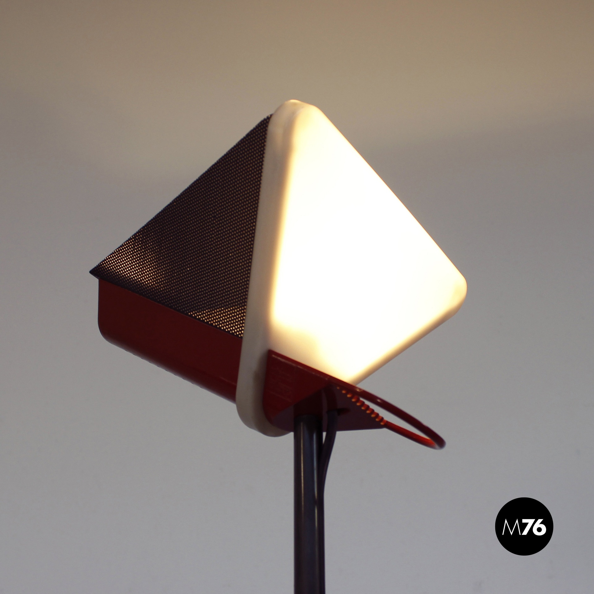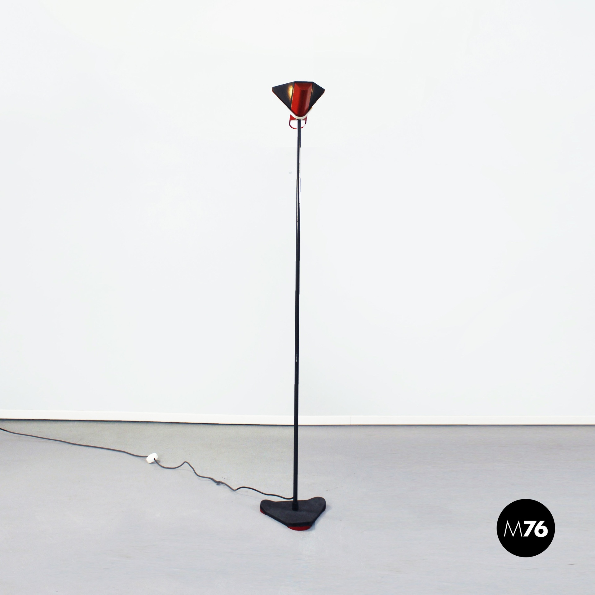 Lampada da terra con struttura e base triangolare in metallo nero e paralume piramidale in metallo nero e rosso.