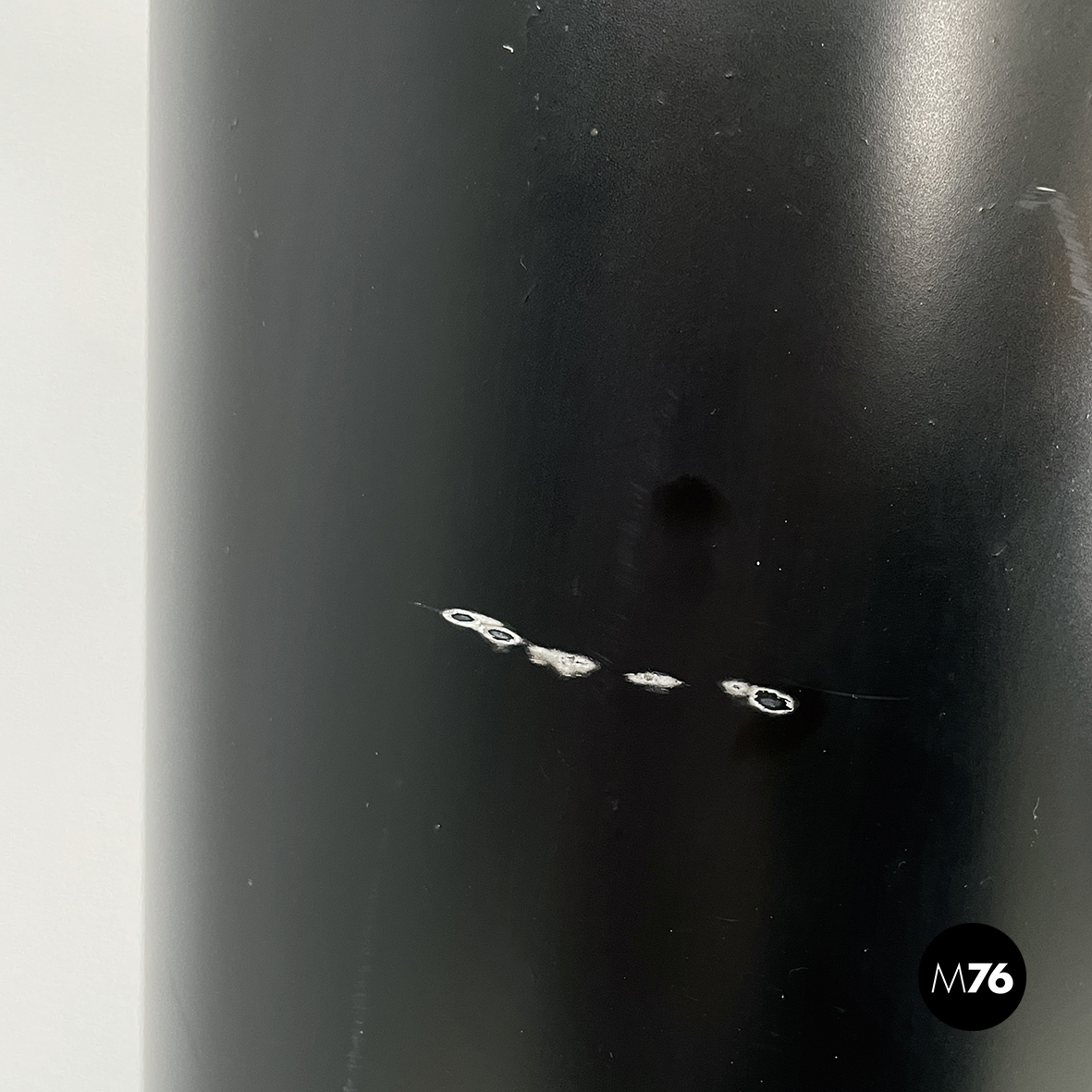 Lampada da terra con diffusore tondo in vetro opalino e profilo nero. La struttura è a sezione tonda in plastica verniciata nera con profili in metallo verniciato bianco. Base tonda in metallo verniciato bianco.