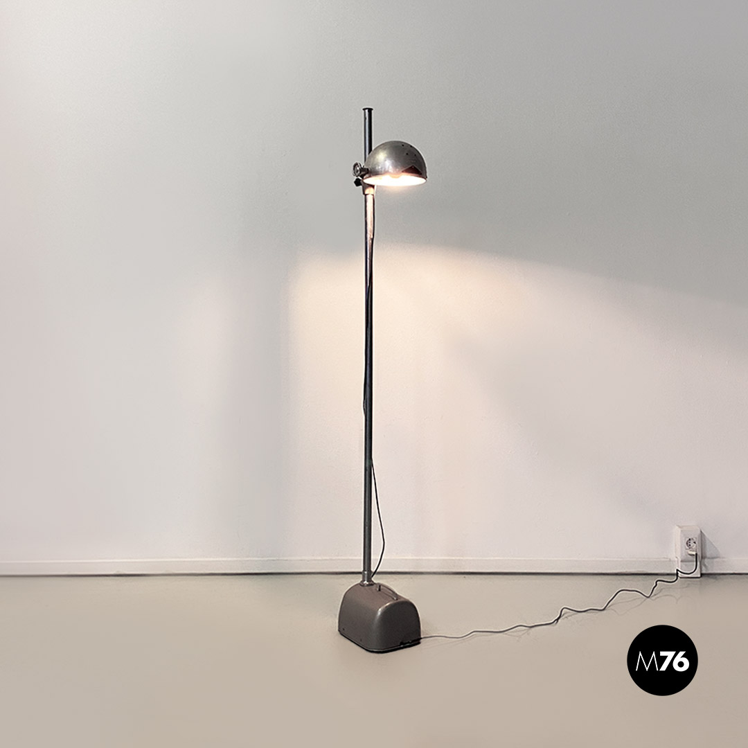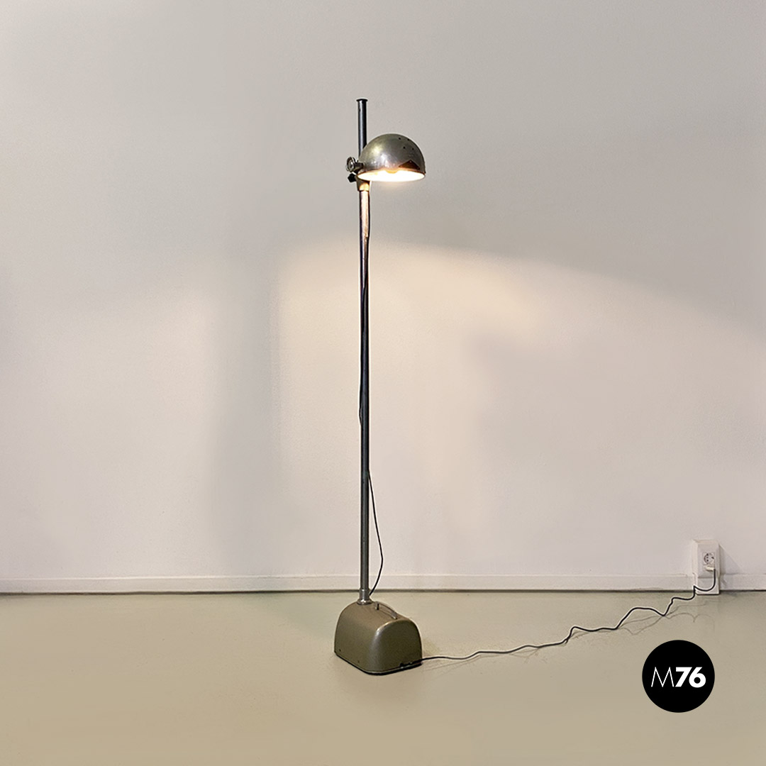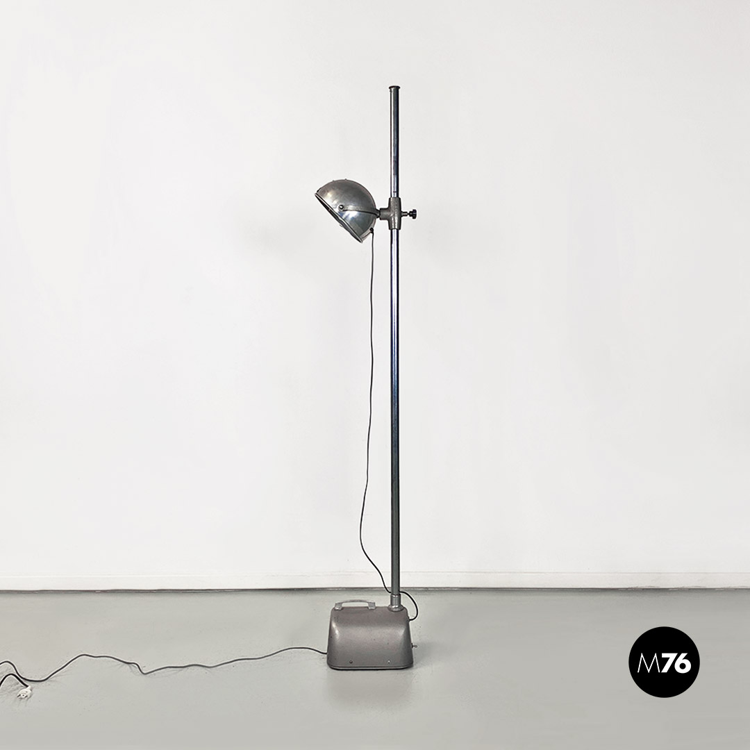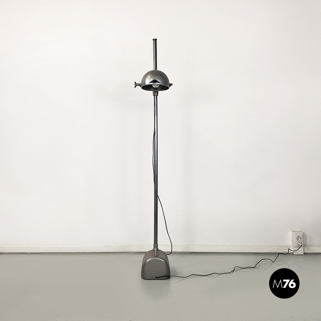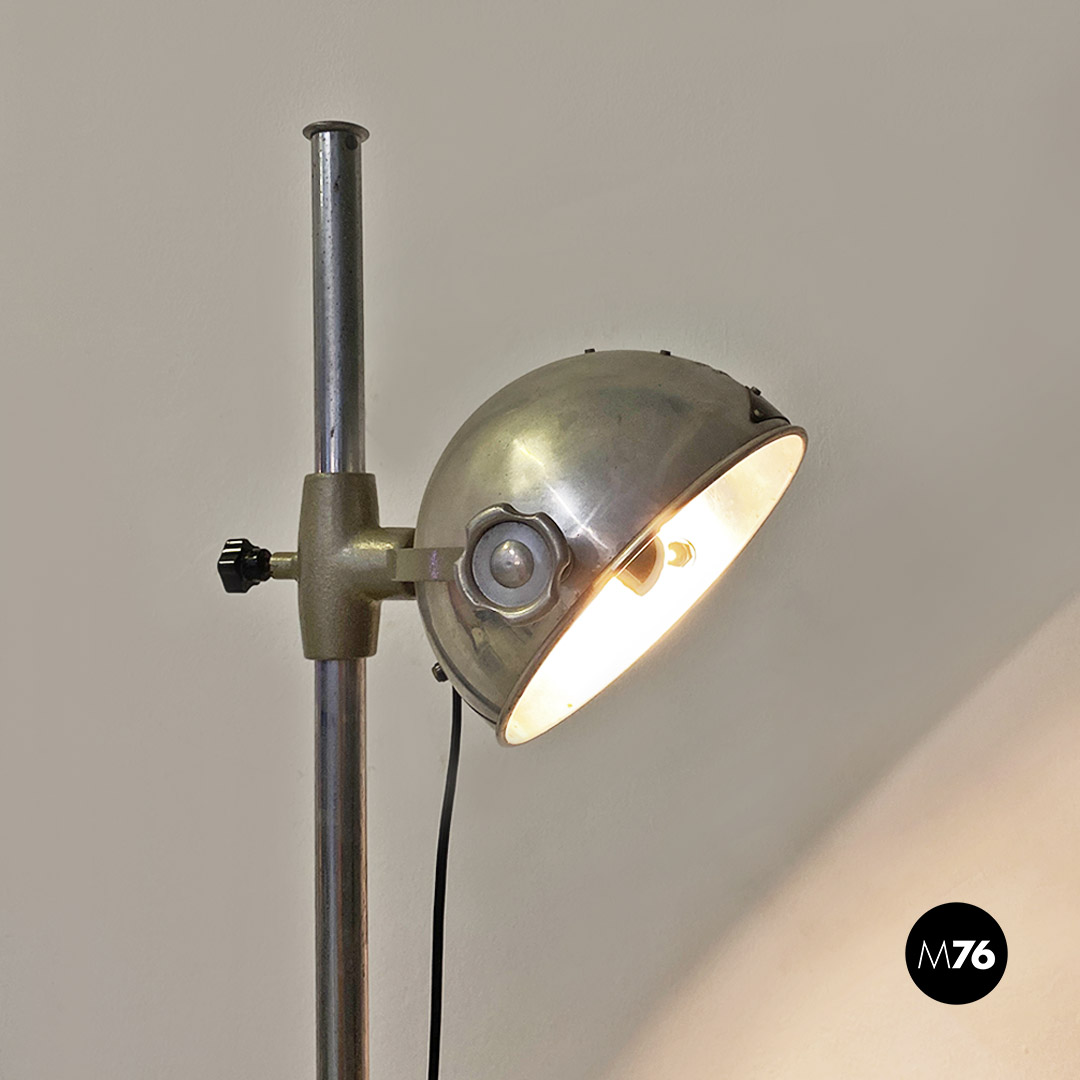 Lampada da terra industriale, di provenienza tedesca, con base in metallo con maniglia in acciaio e interruttore sul retro, stelo sempre in acciaio a sezione tonda su cui scorre e si fissa il paralume tramite una manopola. Paralume semisferico e orientabile in tutte le direzioni.