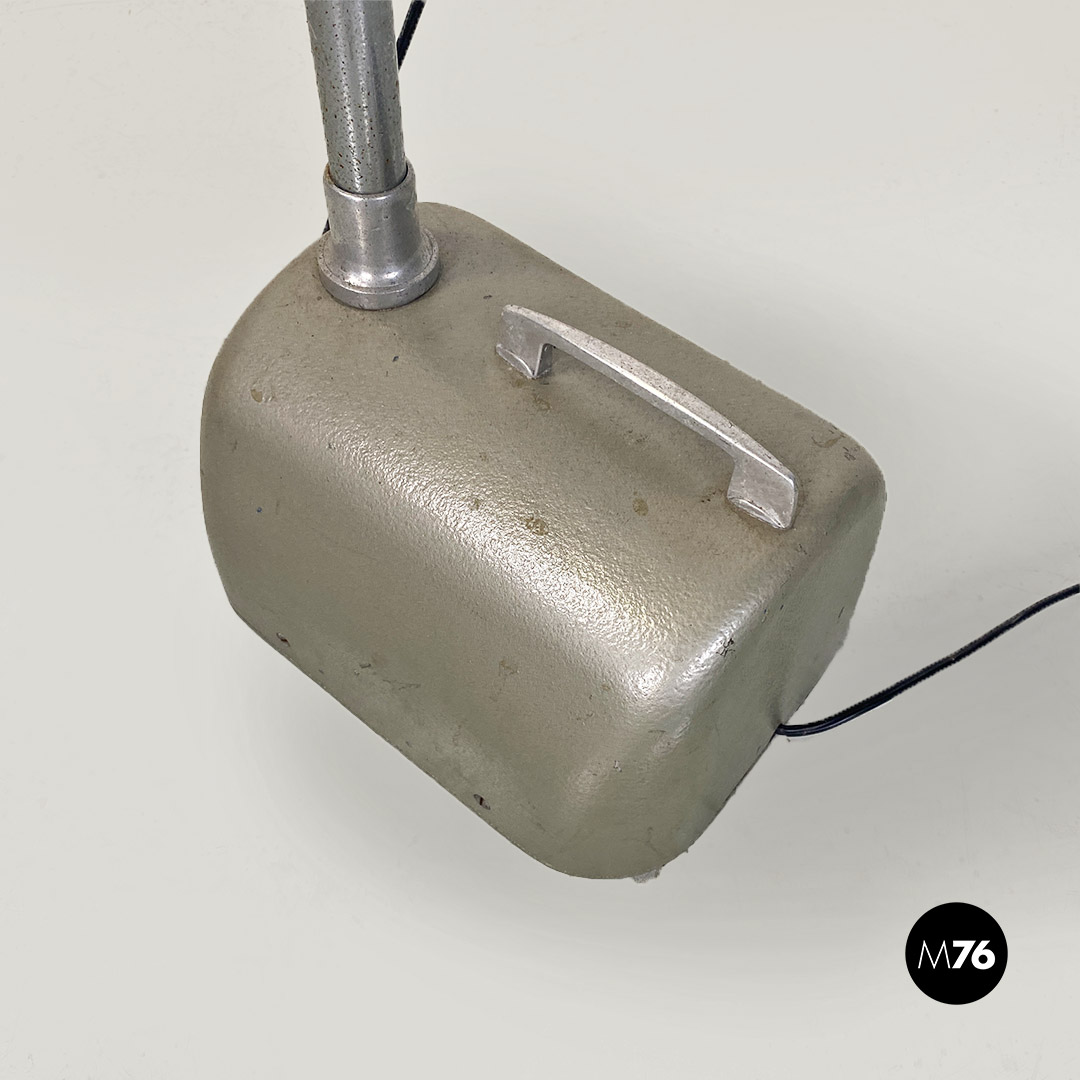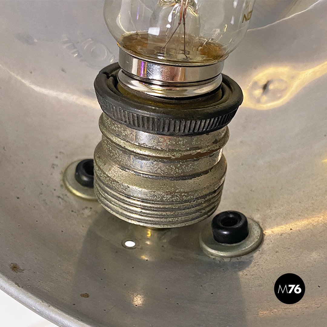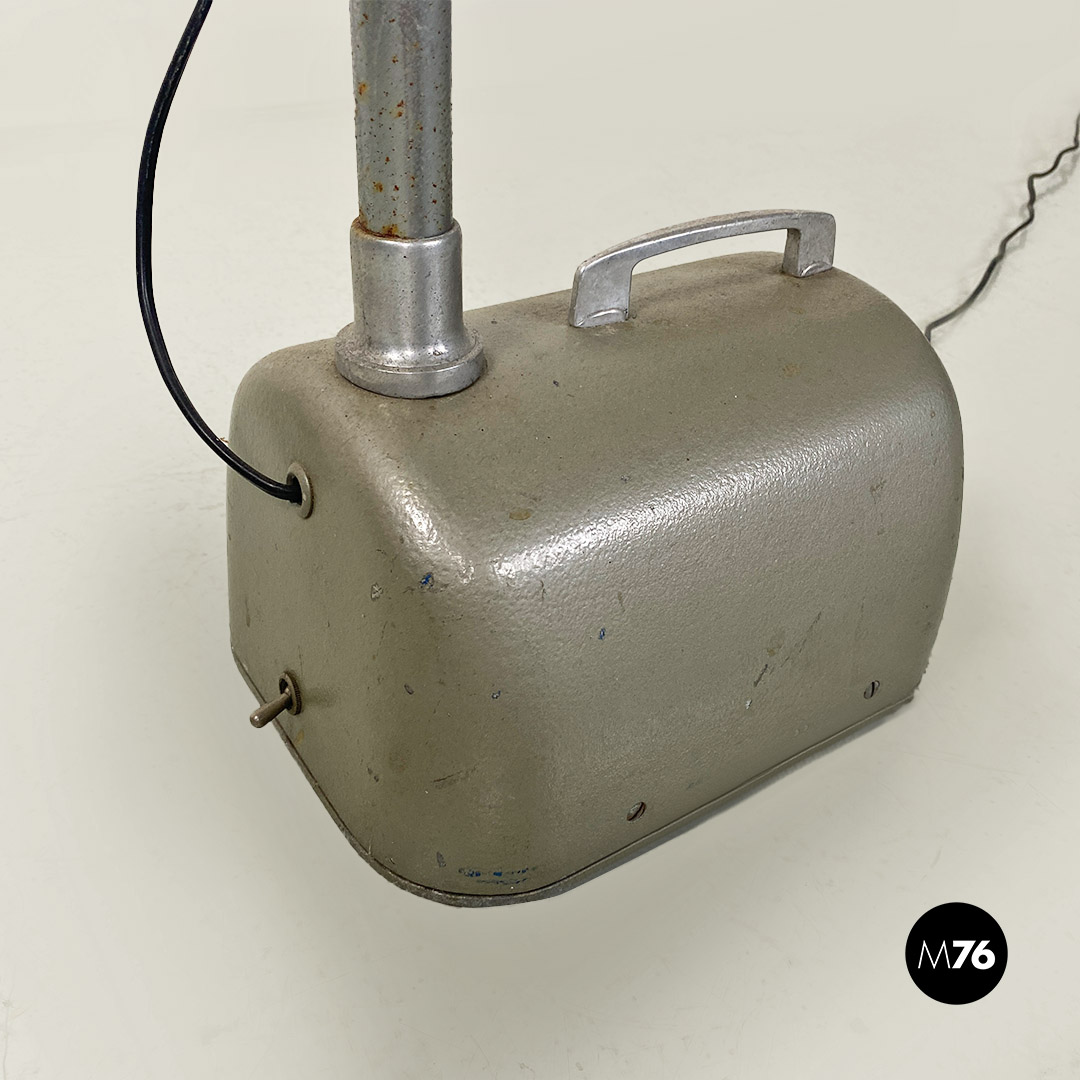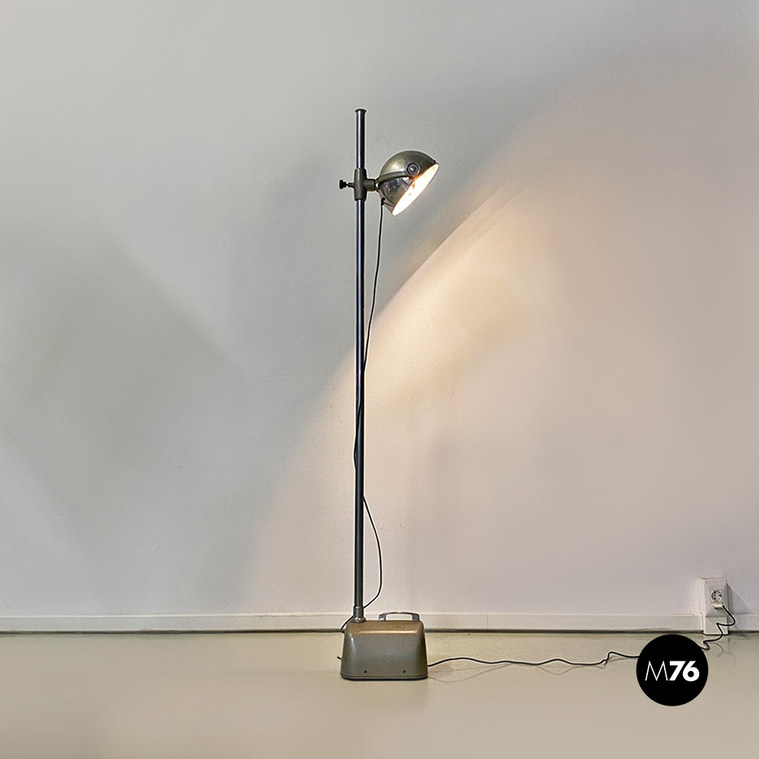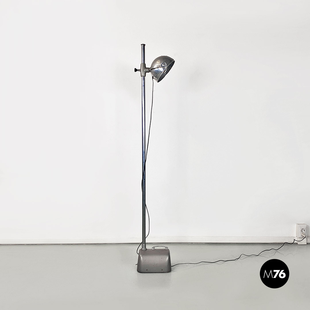 Lampada da terra industriale, di provenienza tedesca, con base in metallo con maniglia in acciaio e interruttore sul retro, stelo sempre in acciaio a sezione tonda su cui scorre e si fissa il paralume tramite una manopola. Paralume semisferico e orientabile in tutte le direzioni.