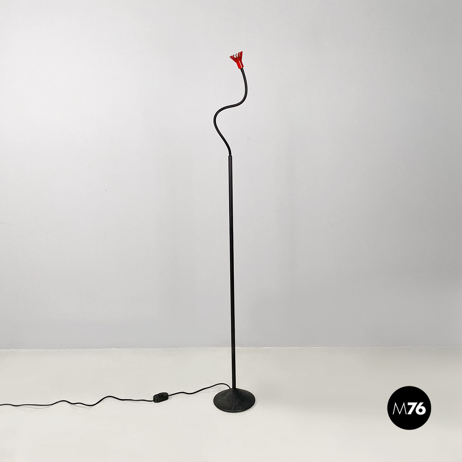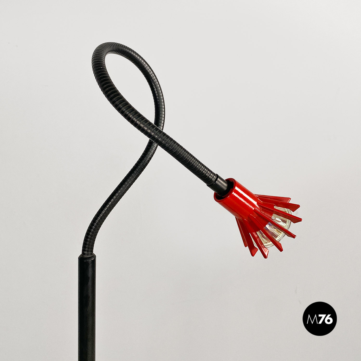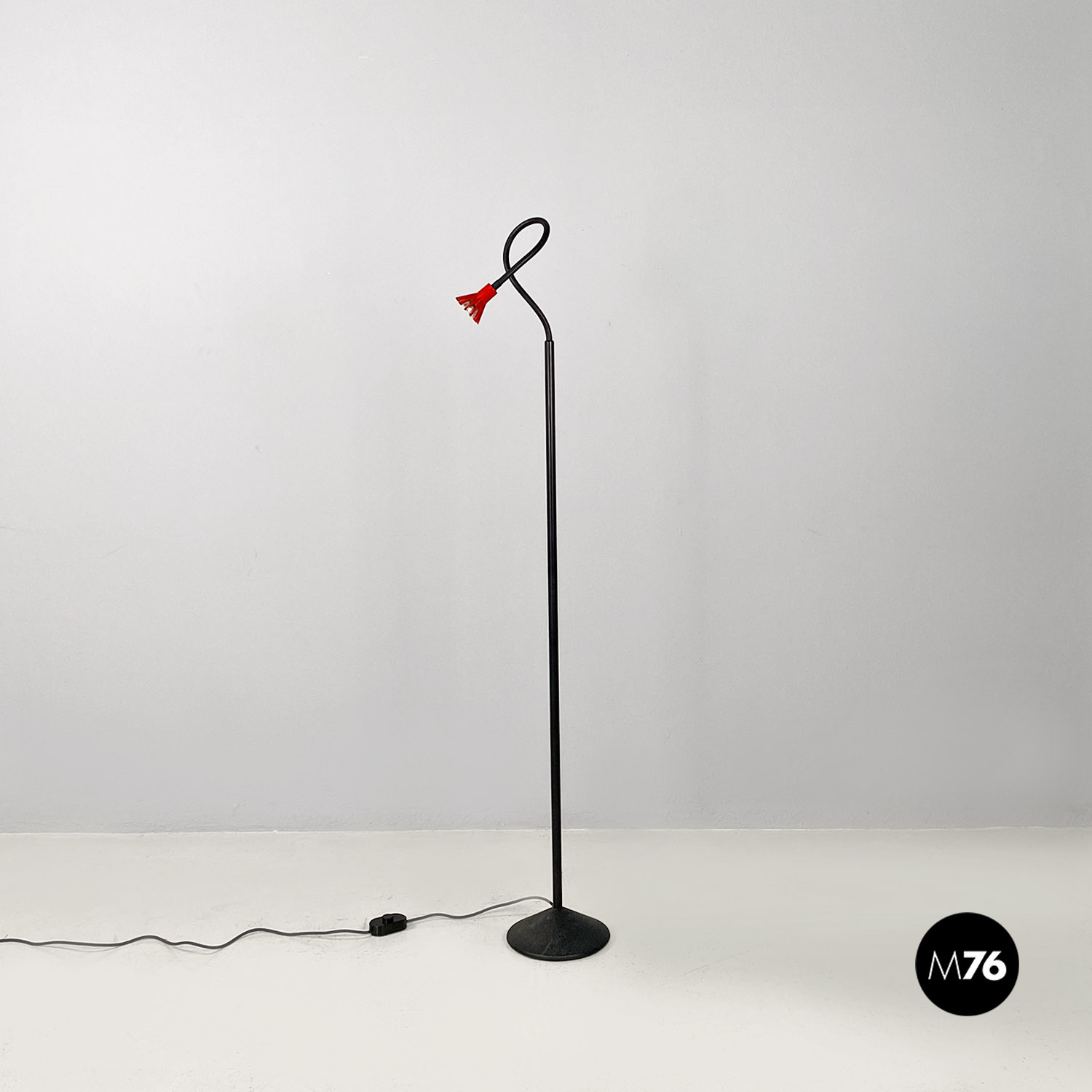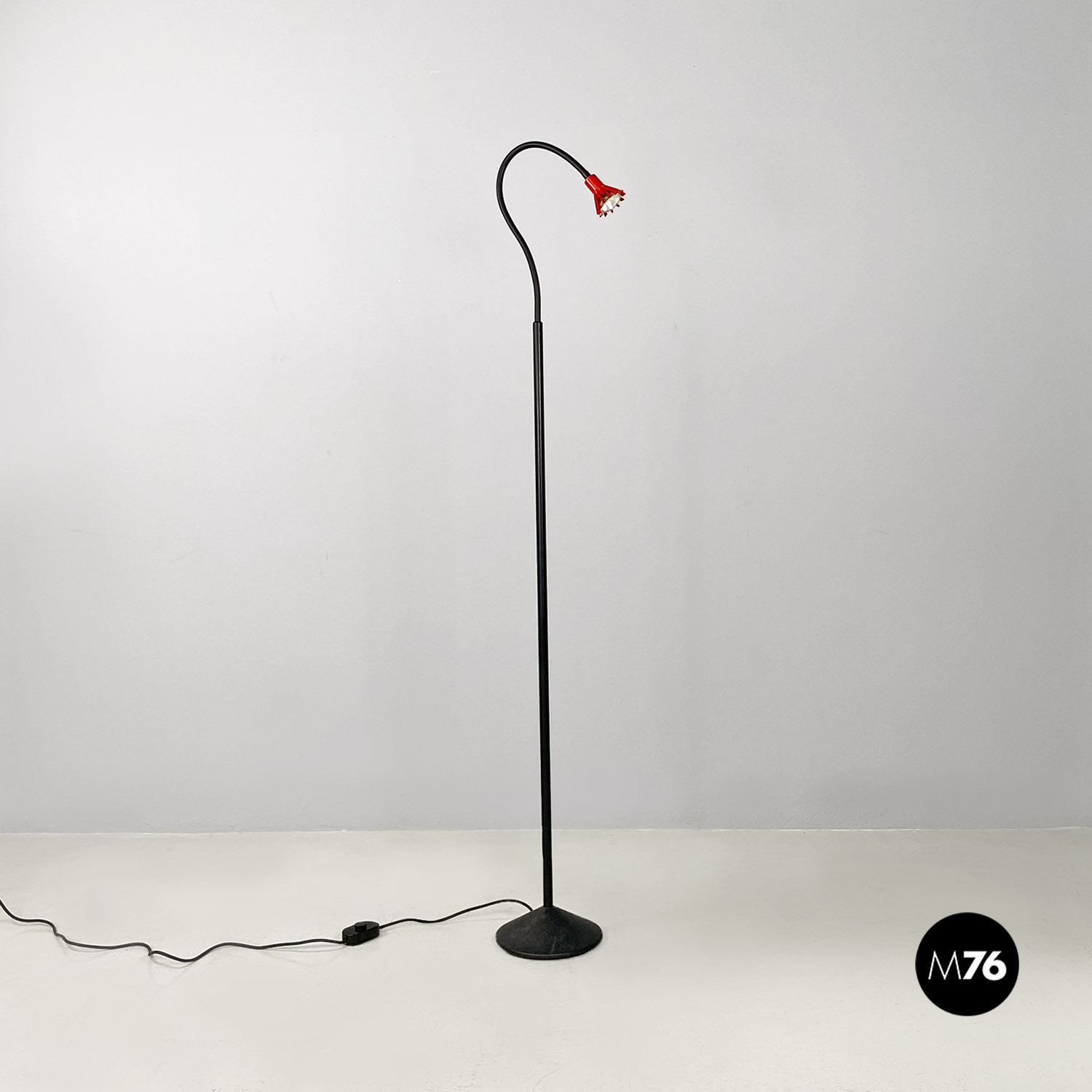 Lampada da terra con struttura e base in metallo nero, snodabile nella parte superiore e paralume rosso con lampadina dicroica.