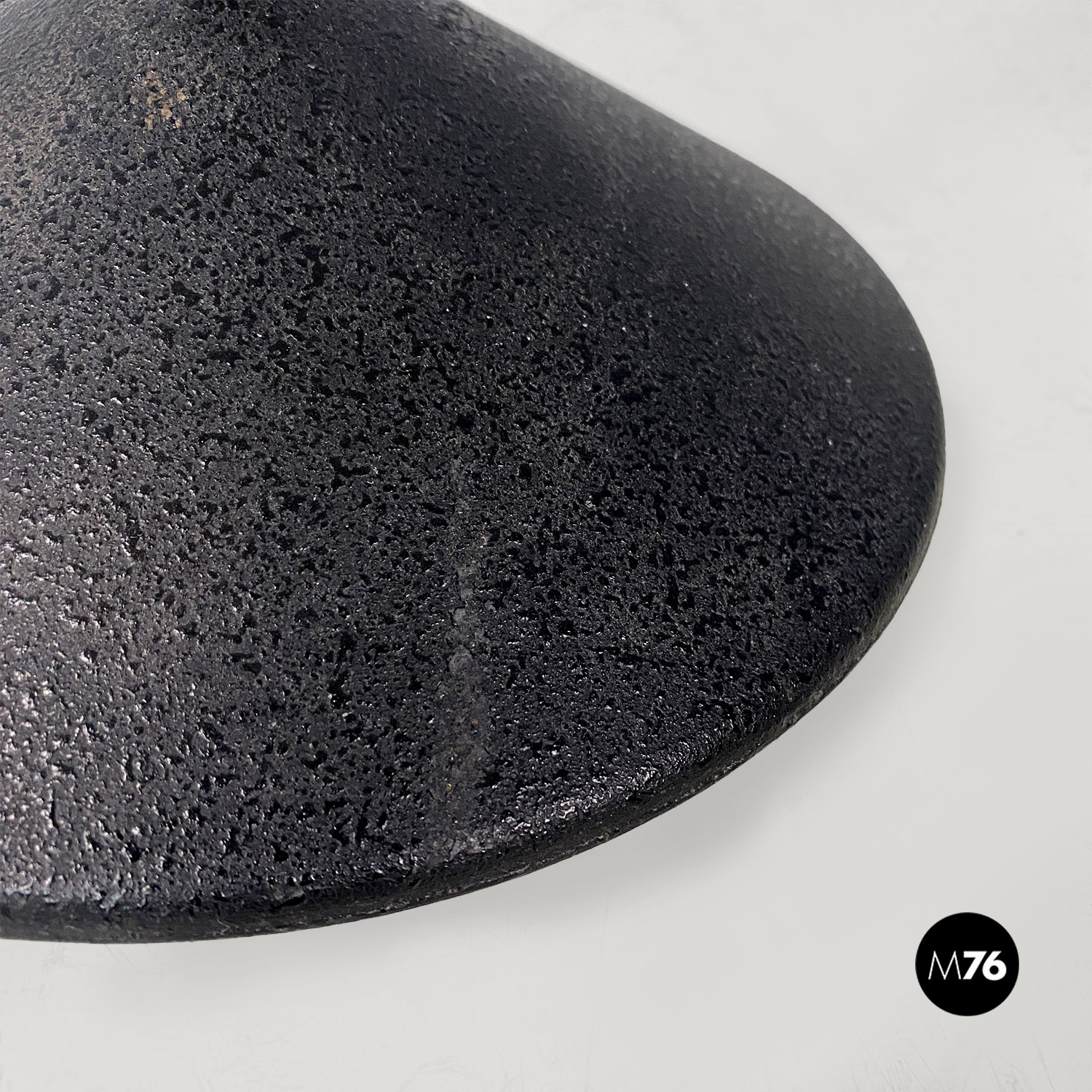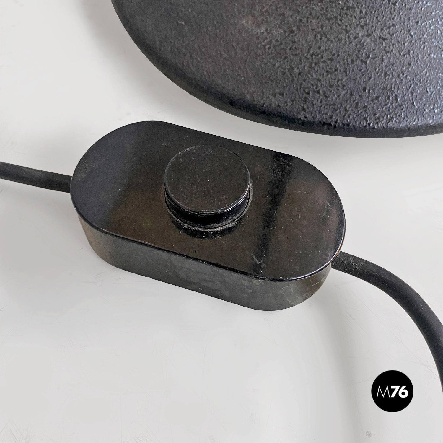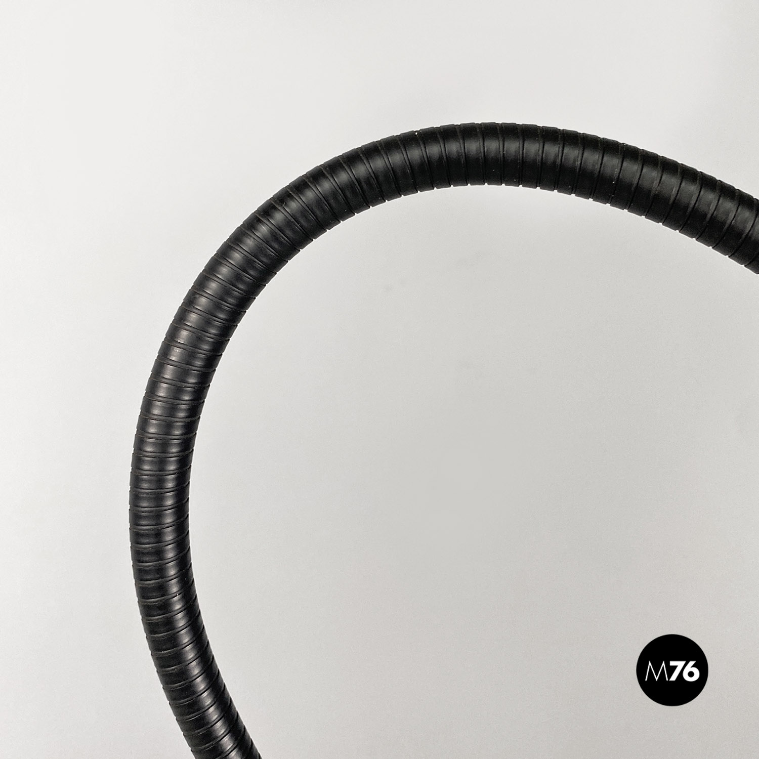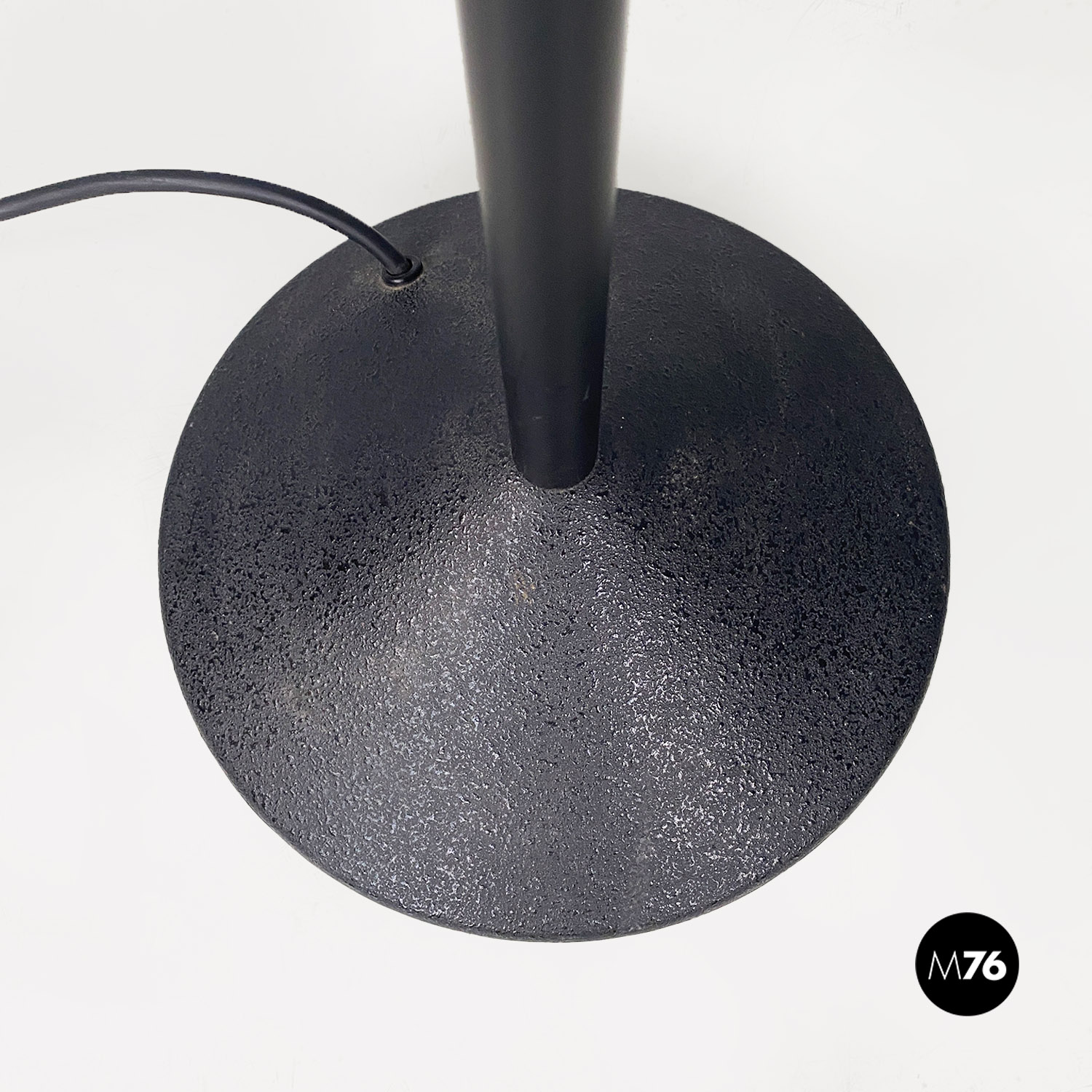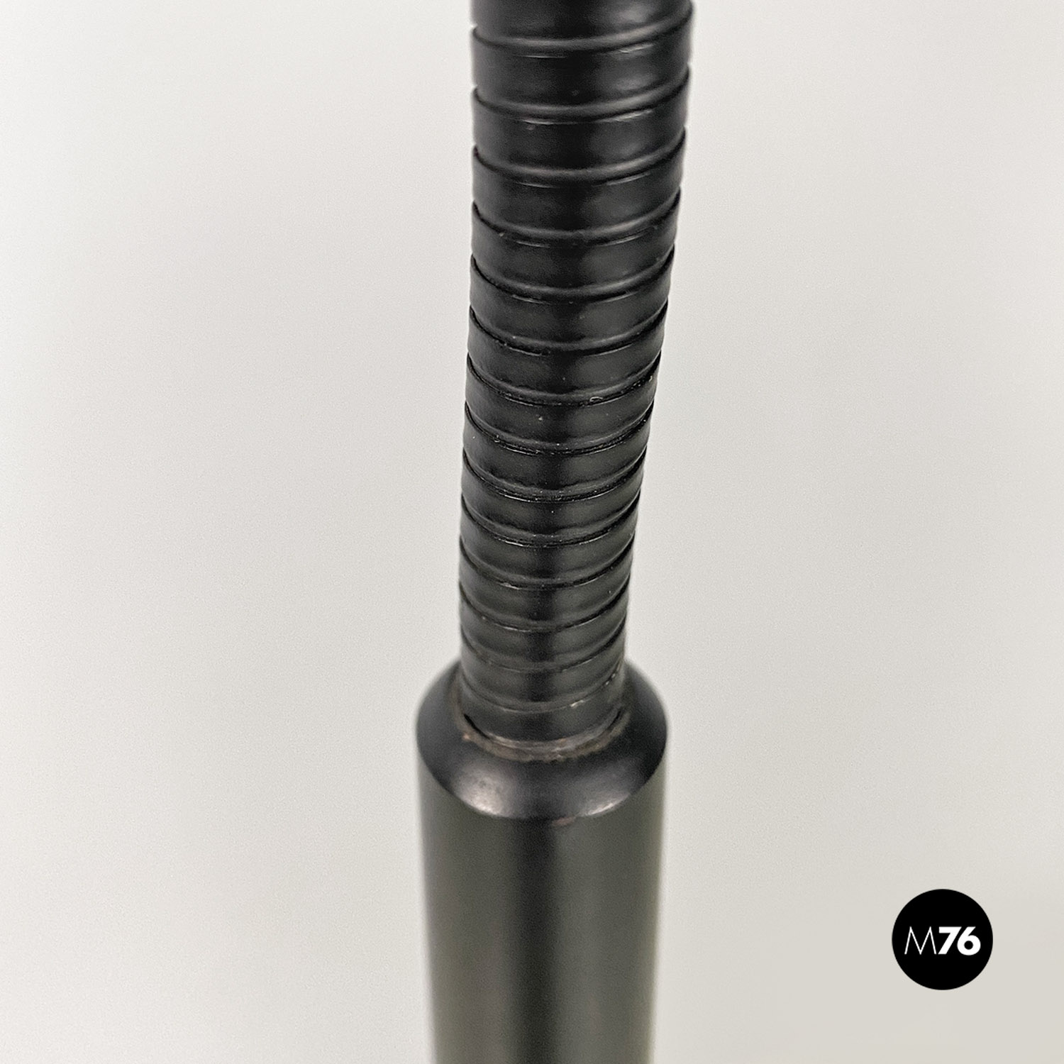 Lampada da terra con struttura e base in metallo nero, snodabile nella parte superiore e paralume rosso con lampadina dicroica.