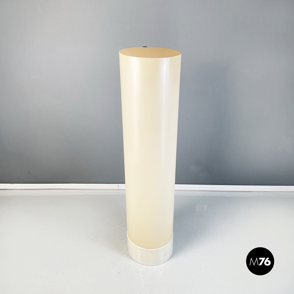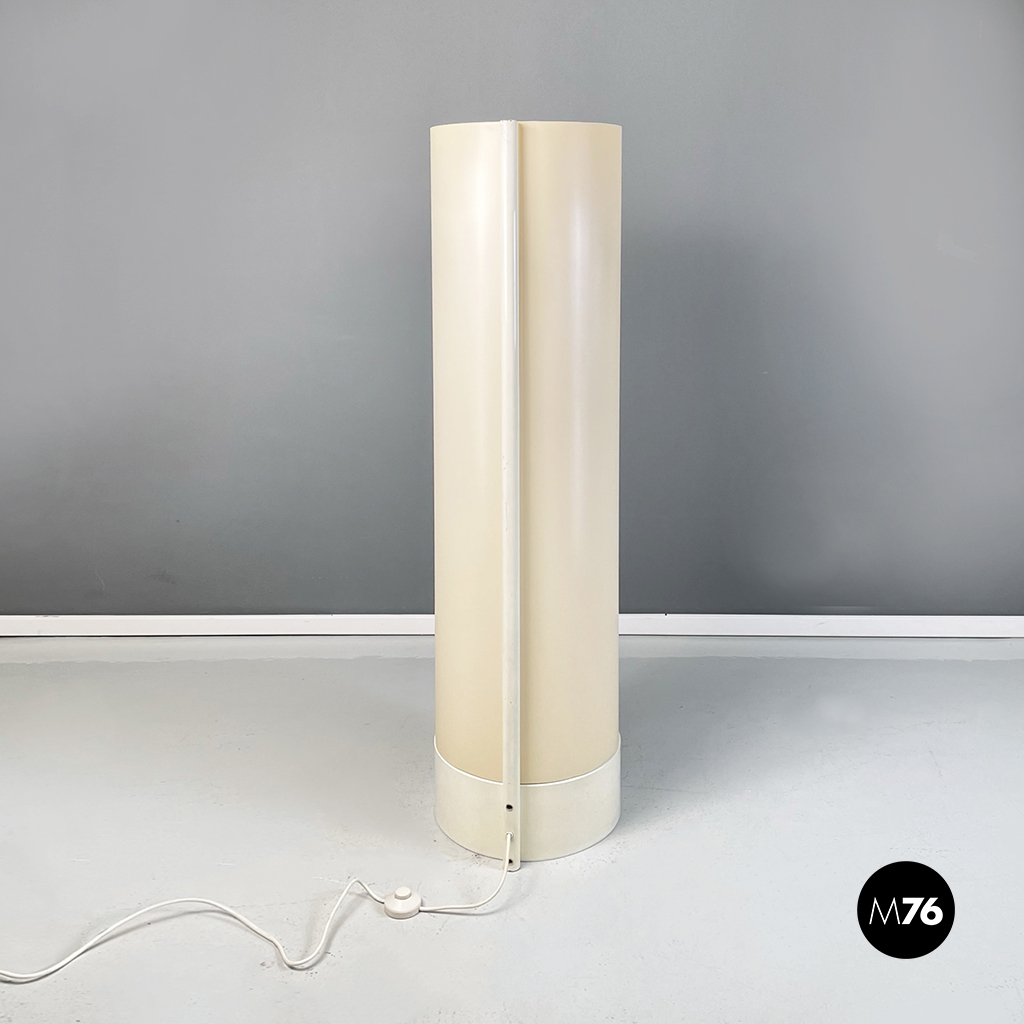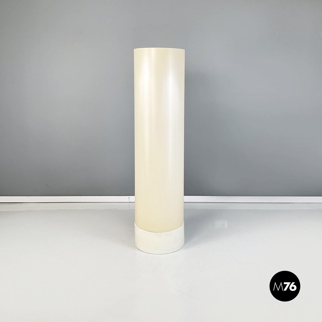 Lampada da terra modello Flu a base tonda in metallo verniciato bianco. Il paralume cilindrico in PVC color bianco crema è sostenuto da due tubolari, uno interno e uno esterno.