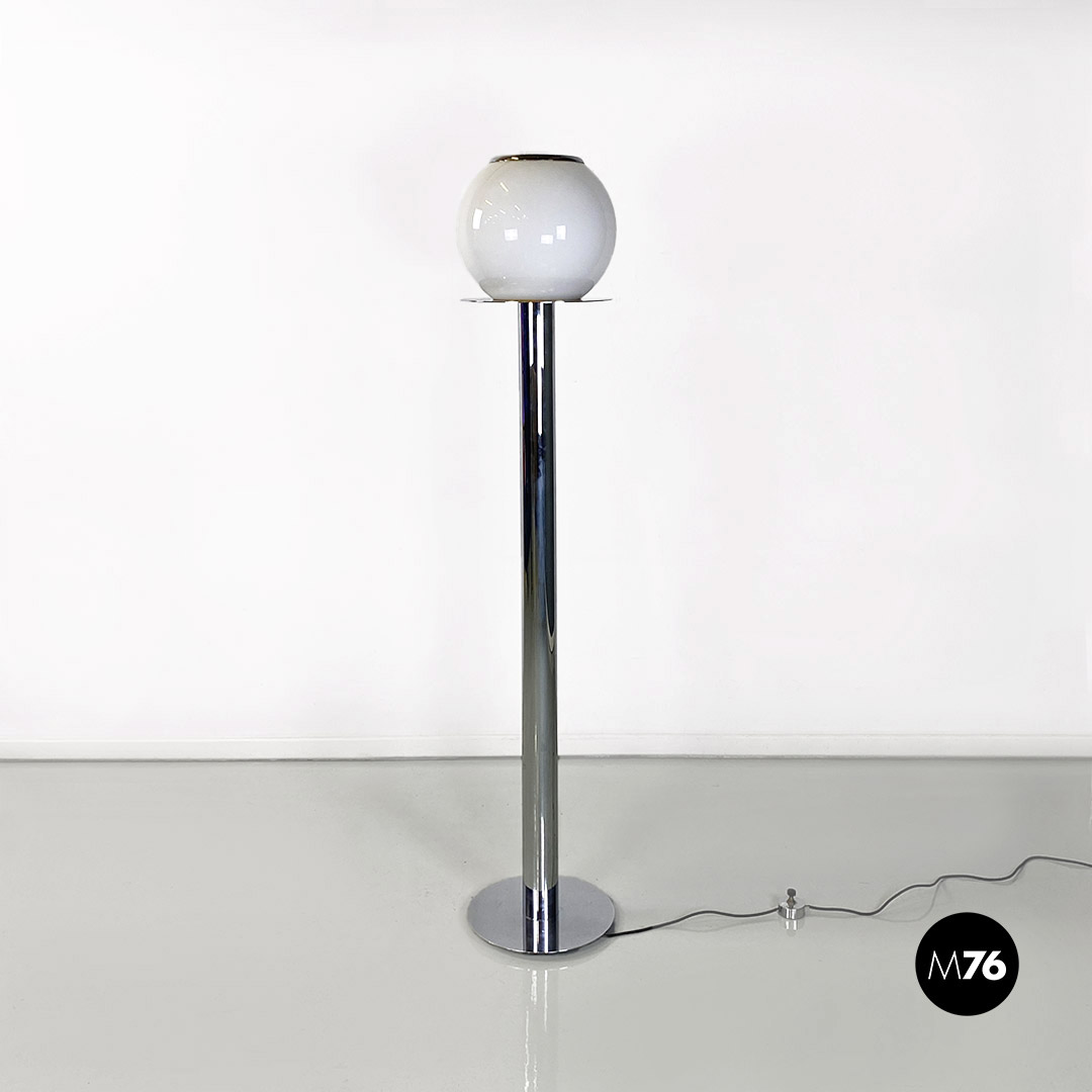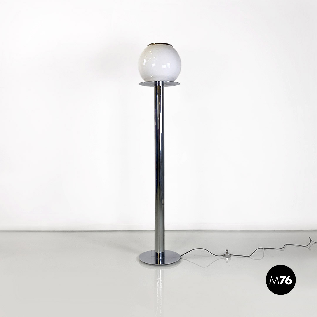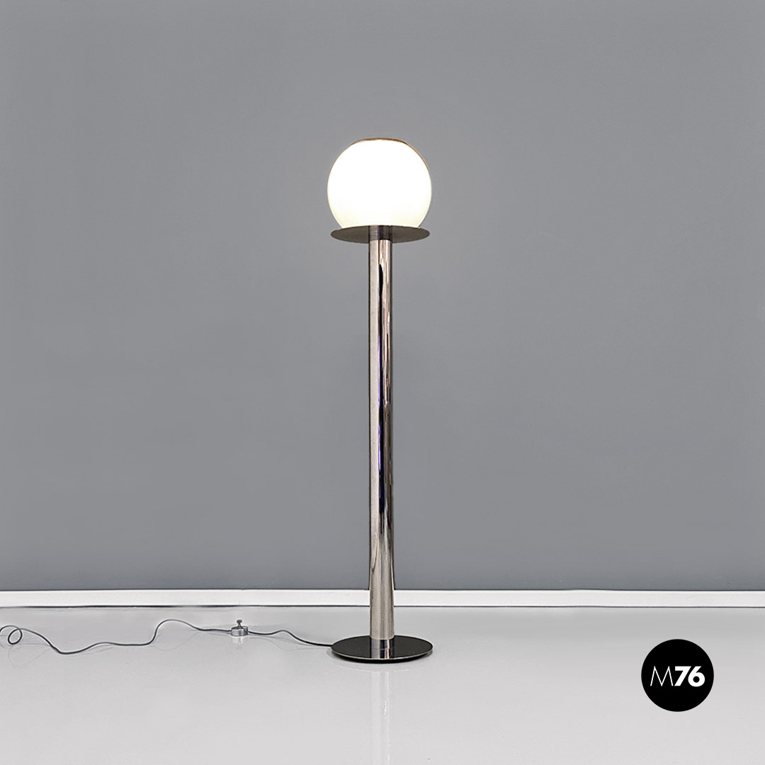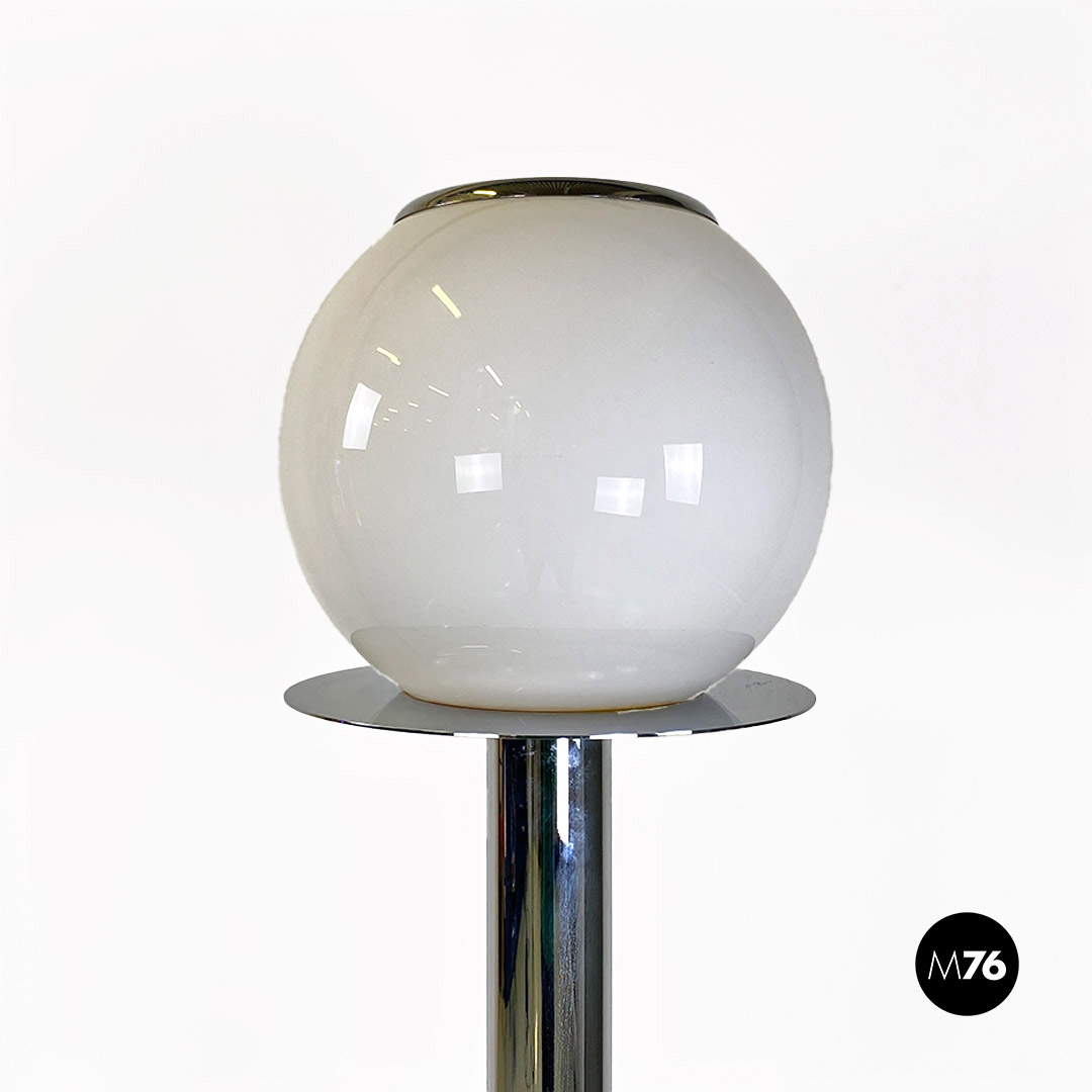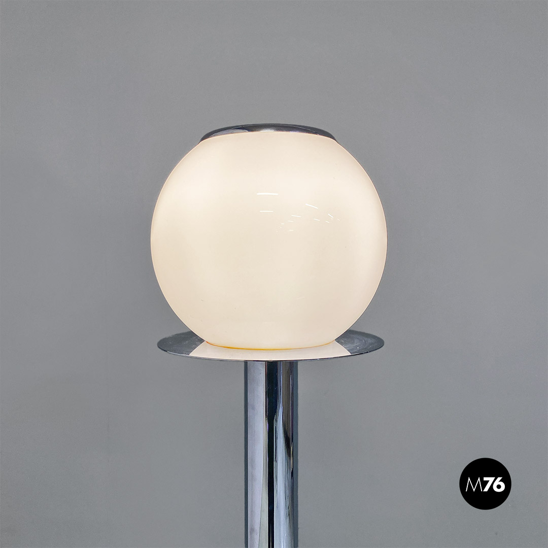 Lampada da terra con struttura in acciaio cromato, con base piatta di forma tonda, speculare nella parte alta su cui è fissato un diffusore sferico in vetro opaline, con apertura per l’inserimento della lampadina. Il bordo della sfera è rifinito con un anello in acciaio.