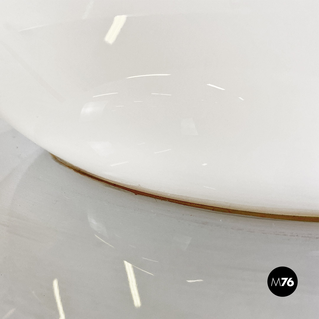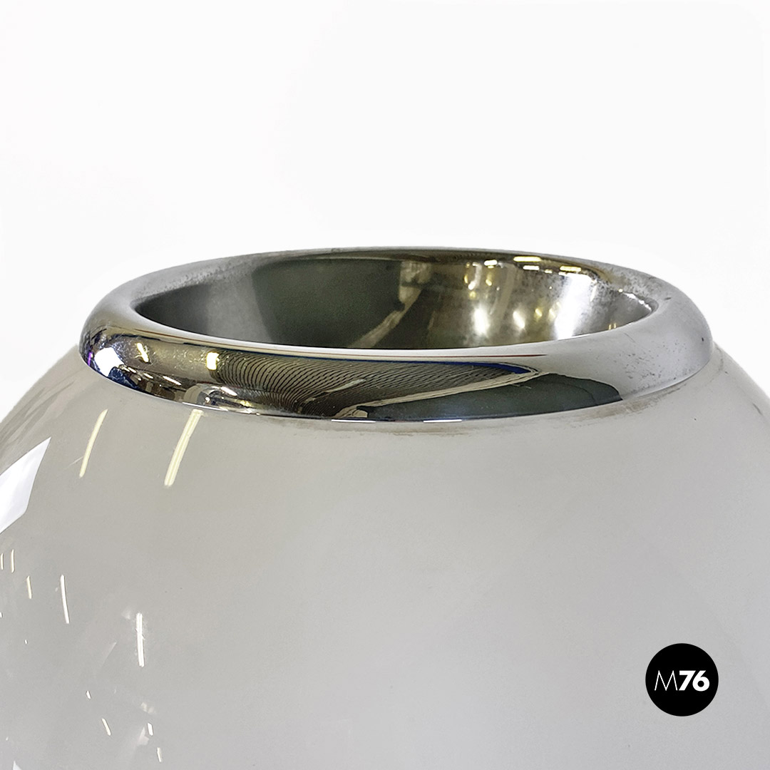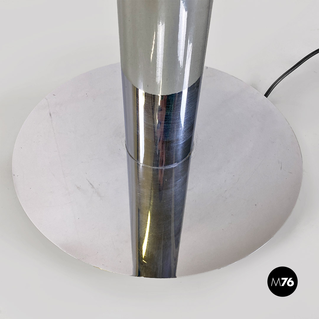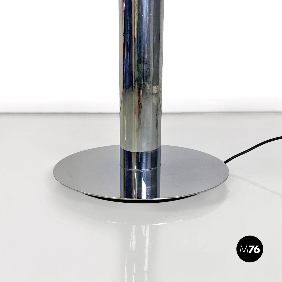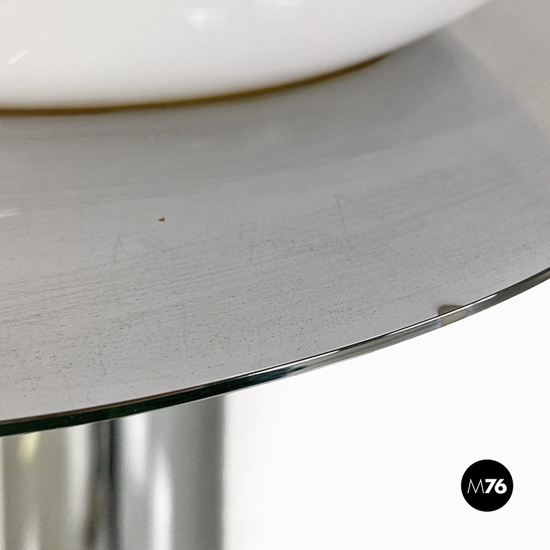 Lampada da terra con struttura in acciaio cromato, con base piatta di forma tonda, speculare nella parte alta su cui è fissato un diffusore sferico in vetro opaline, con apertura per l’inserimento della lampadina. Il bordo della sfera è rifinito con un anello in acciaio.