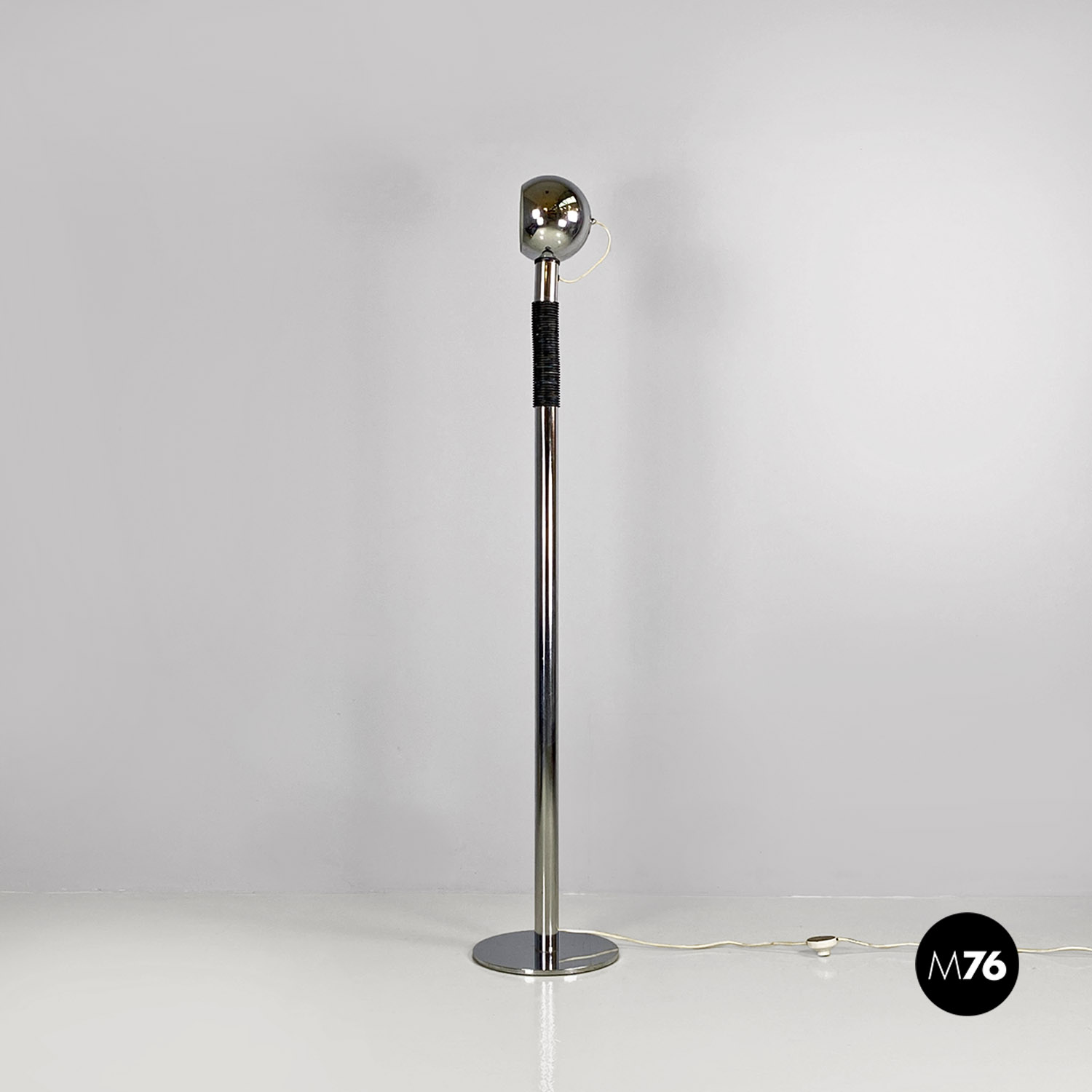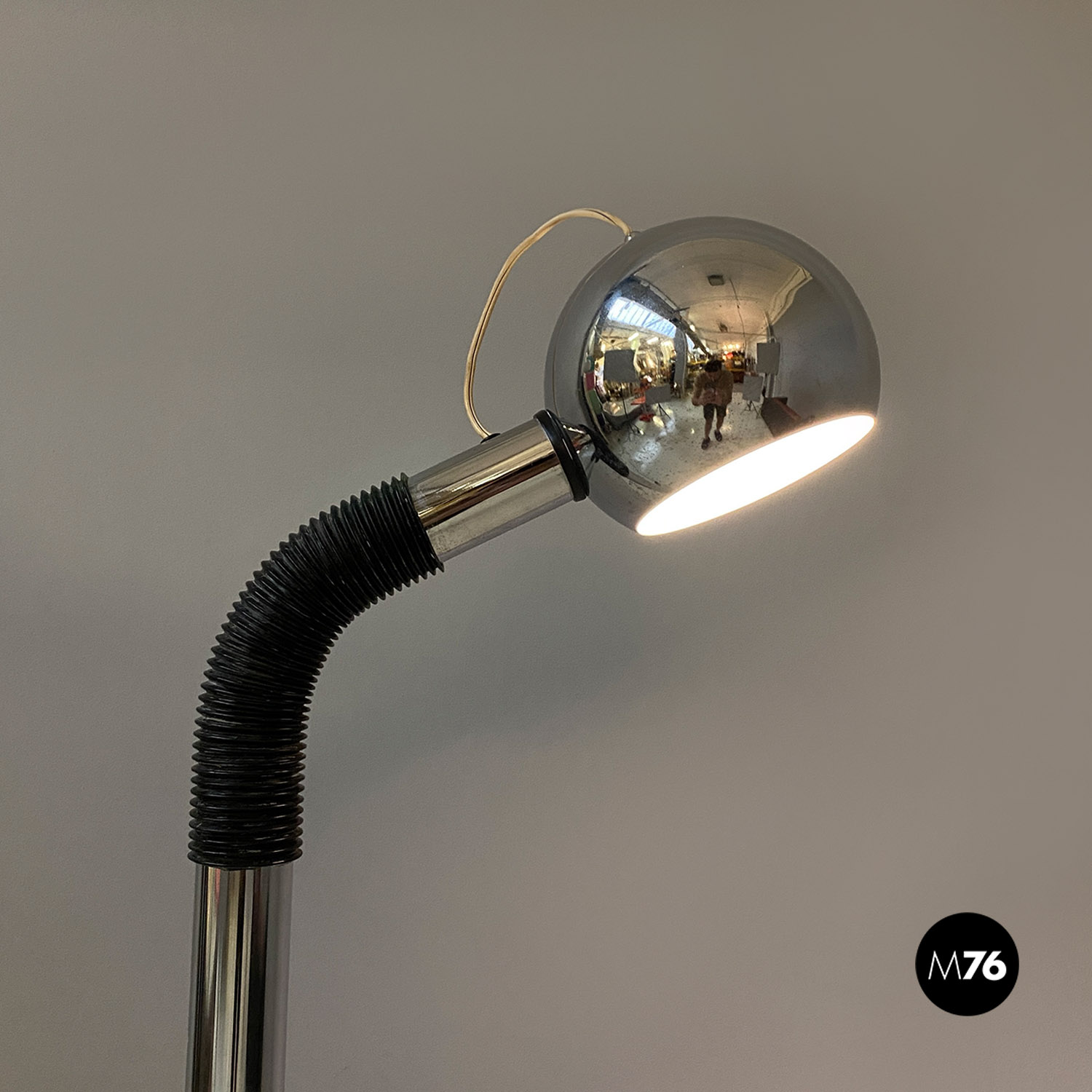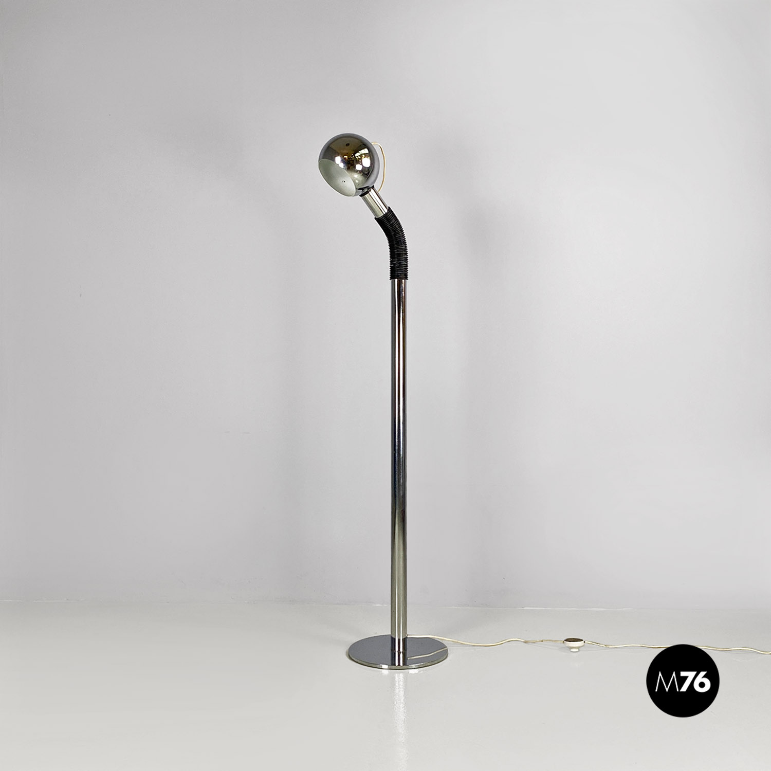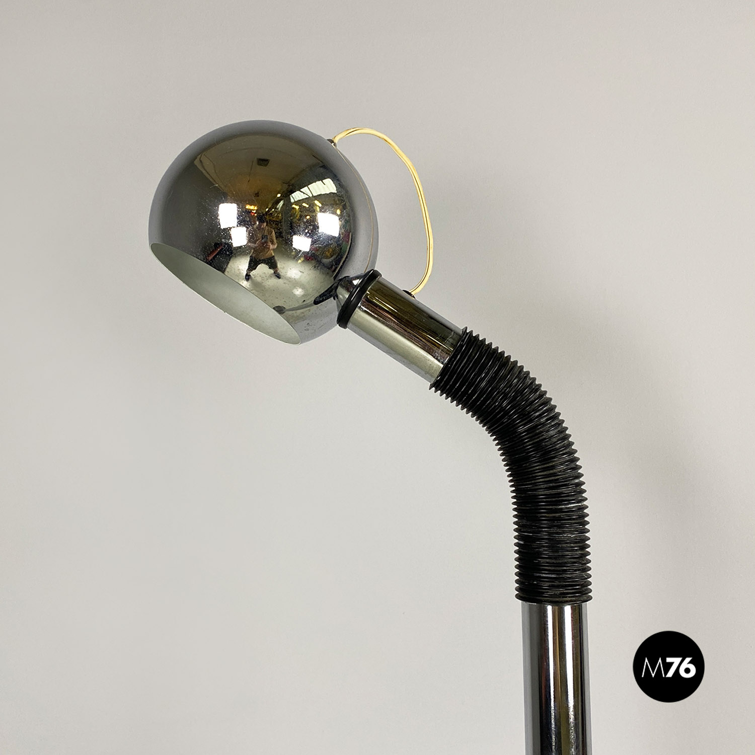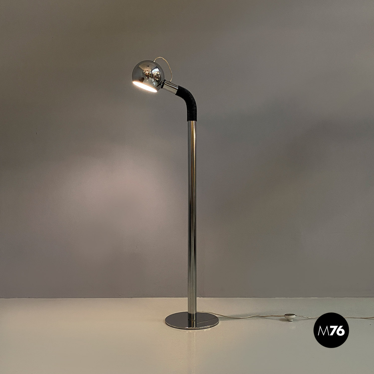 Lampada da terra con luce orientabile con base tonda in acciaio cromato, supporto regolabile in plastica color nero, che permette di curvare lo stelo nella parte terminale e di direzionare la luce. Il diffusore è sferico, anche esso con finitura esterna cromata e verniciato in bianco opaco all’interno.