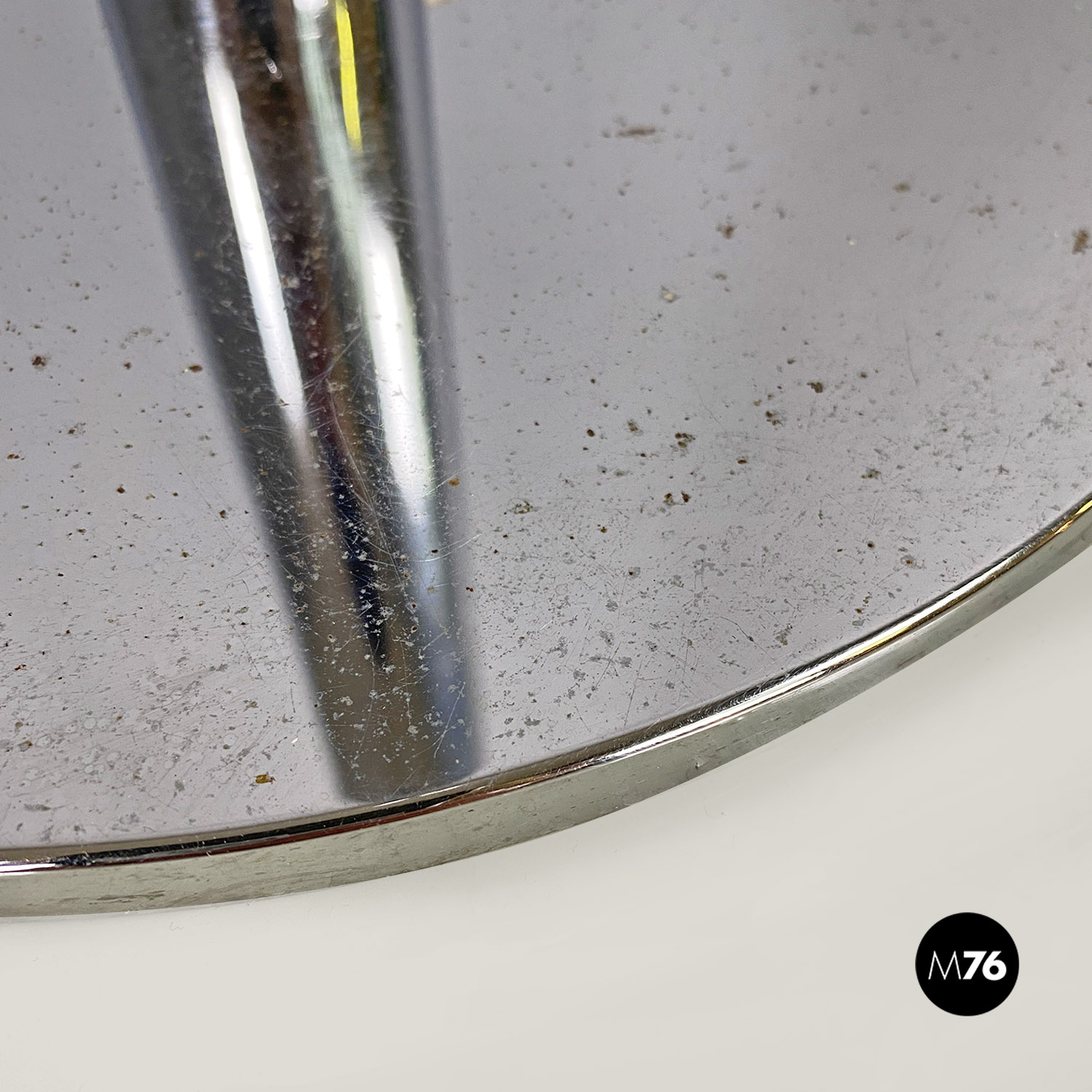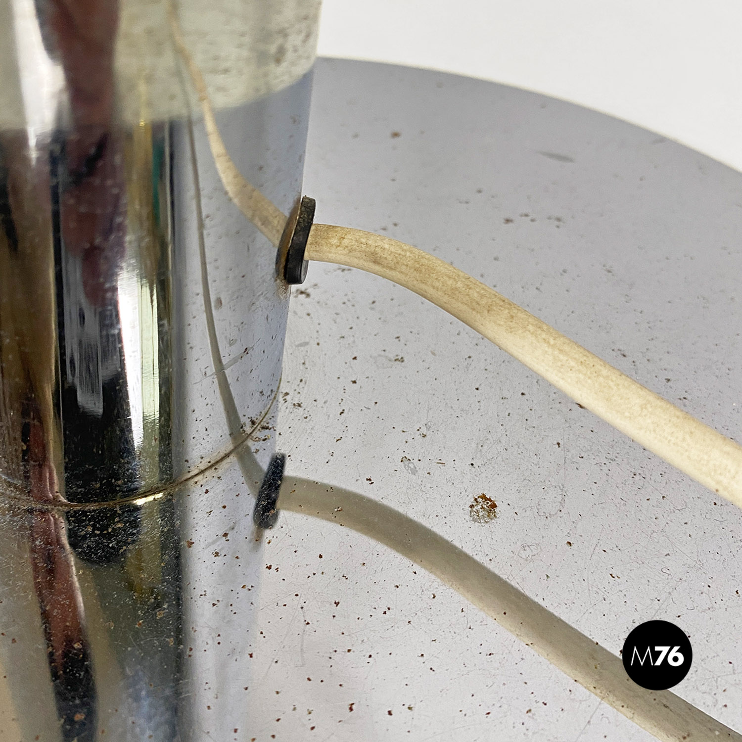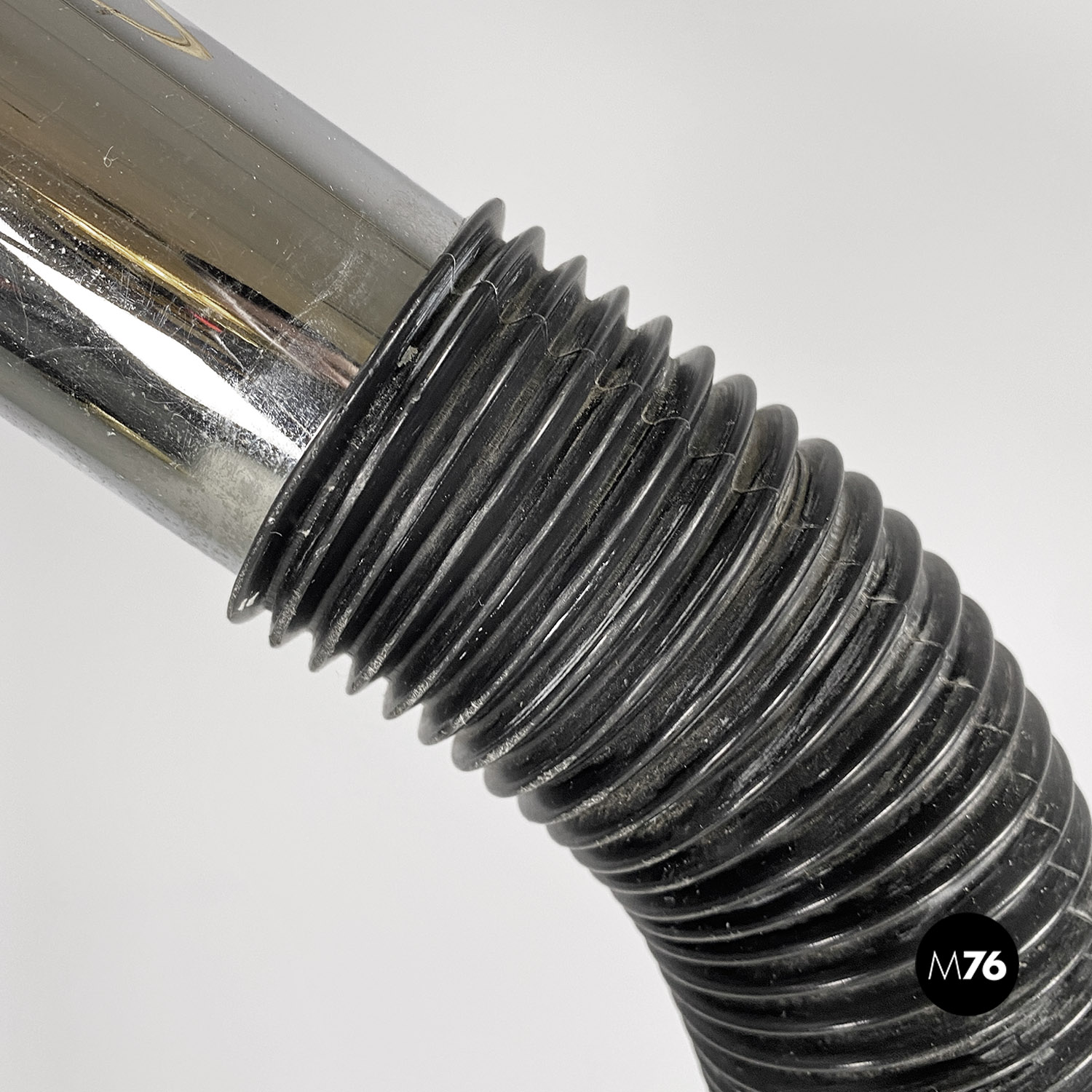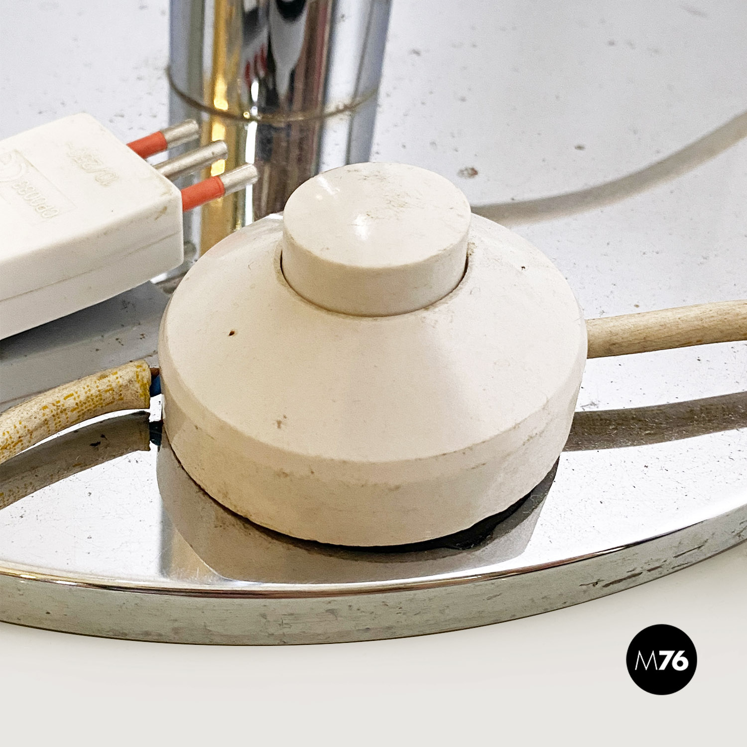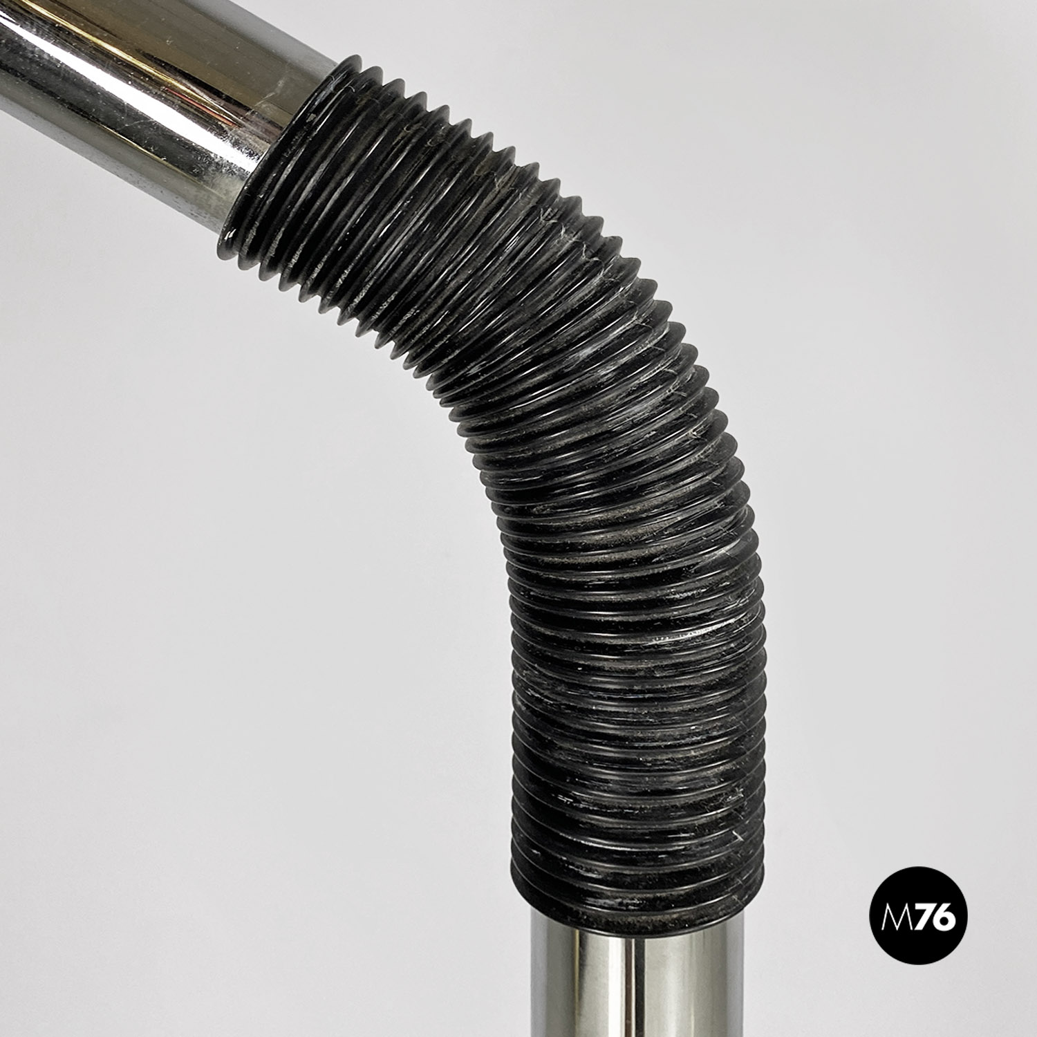 Lampada da terra con luce orientabile con base tonda in acciaio cromato, supporto regolabile in plastica color nero, che permette di curvare lo stelo nella parte terminale e di direzionare la luce. Il diffusore è sferico, anche esso con finitura esterna cromata e verniciato in bianco opaco all’interno.