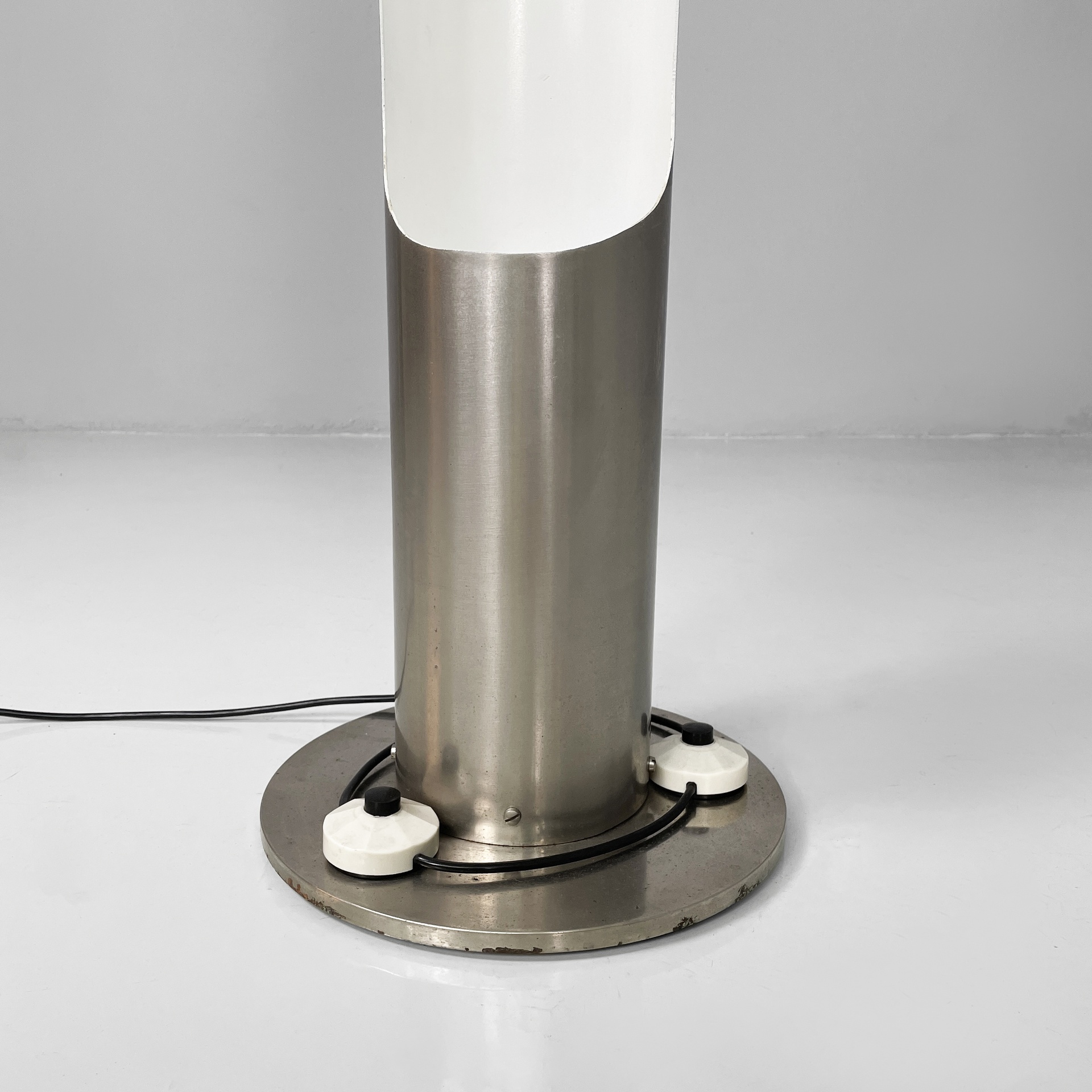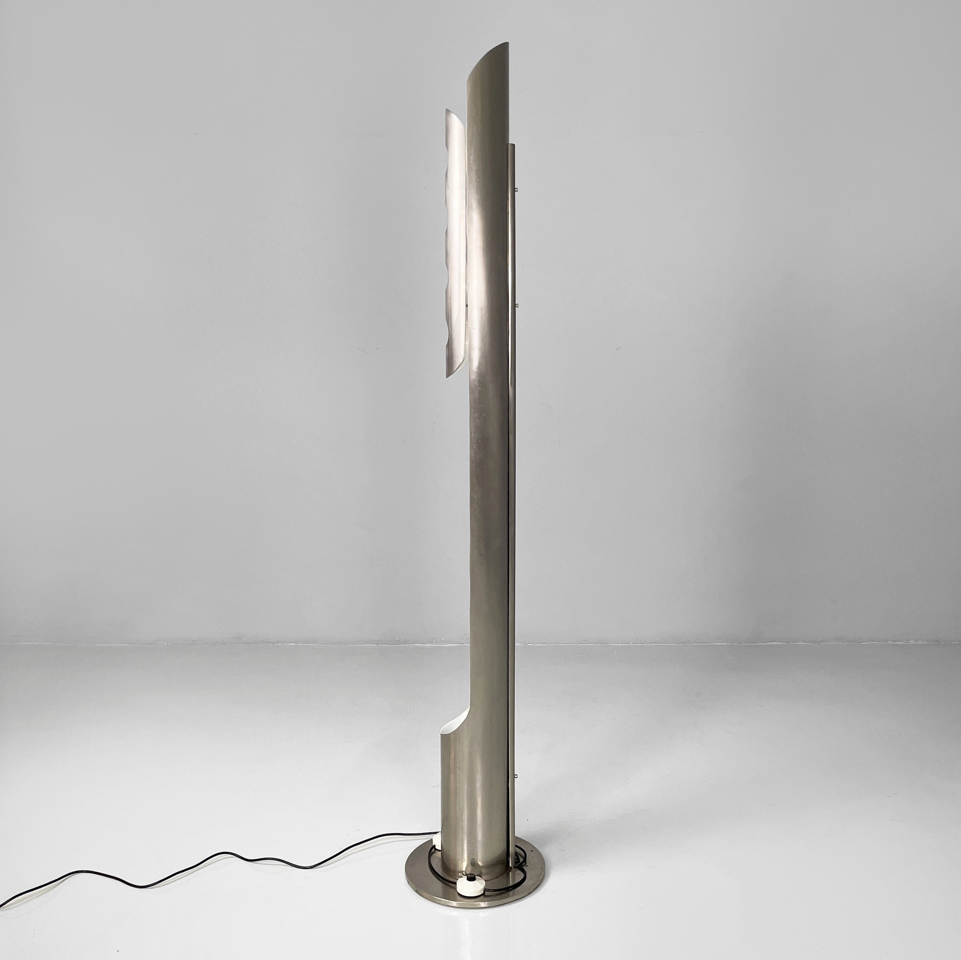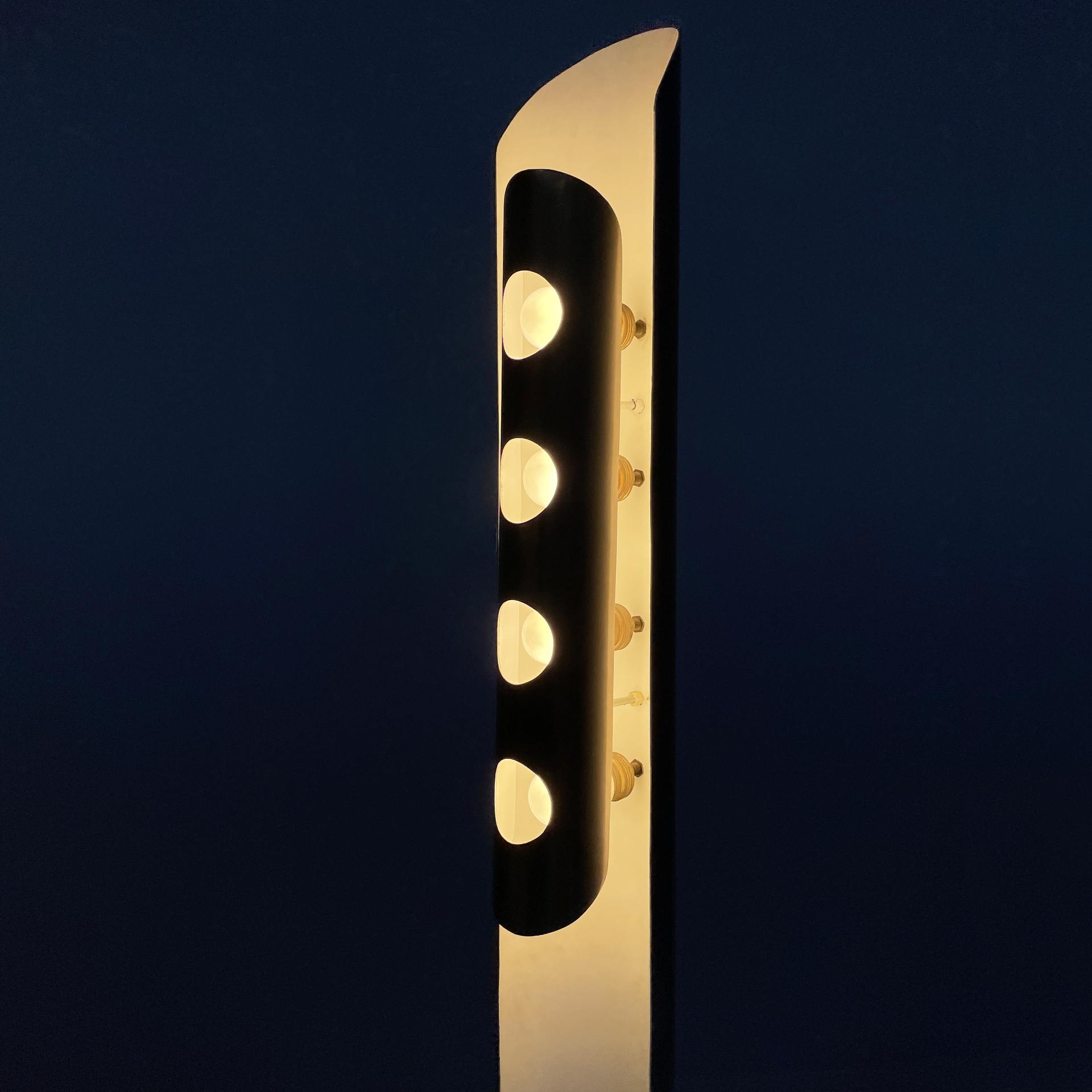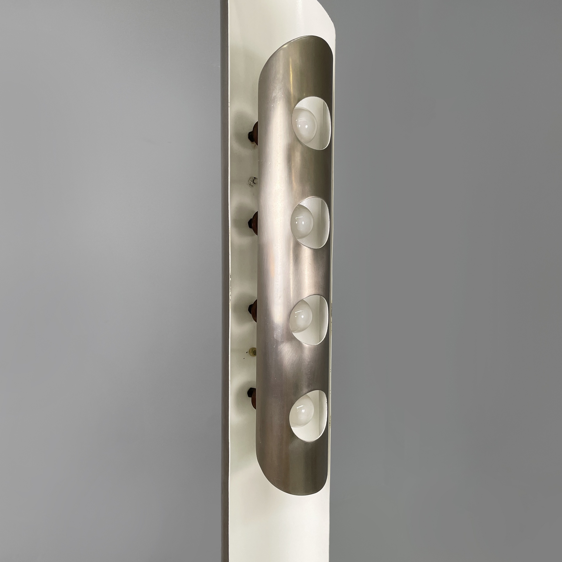 Lampada da terra a base tonda in metallo. Nella parte alta presenta una lamina in metallo curvato con quattro fori, nei quali sono posizionate quattro lampadine. La struttura è composta da una lamina curvata in metallo con interno verniciato bianco. Nella parte bassa è presente un foro dove è presente una seconda fonte luminosa tonda. Base tonda con due interruttori. Space Age.