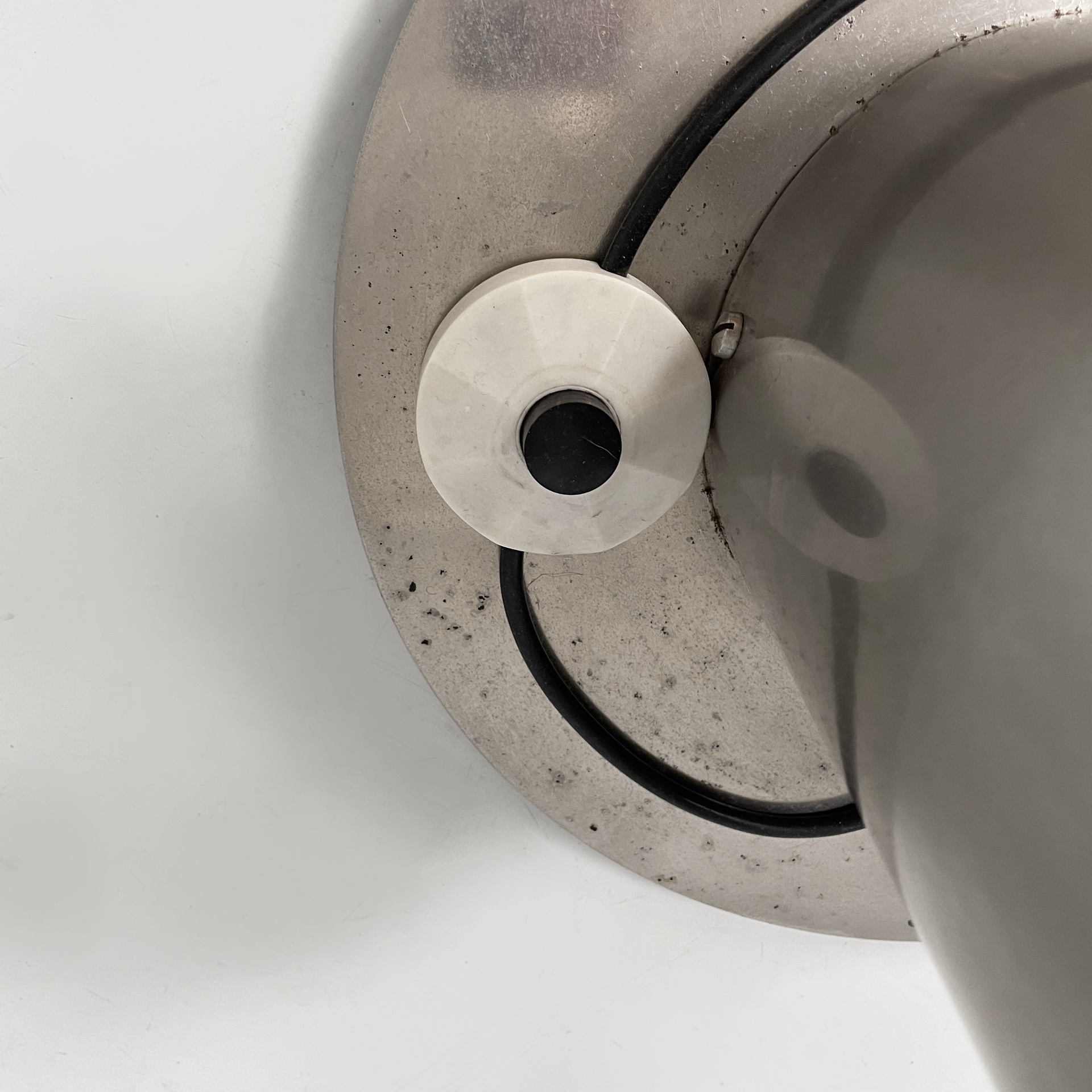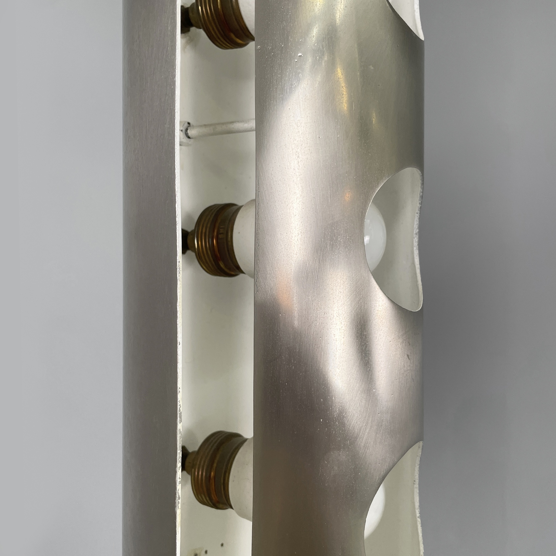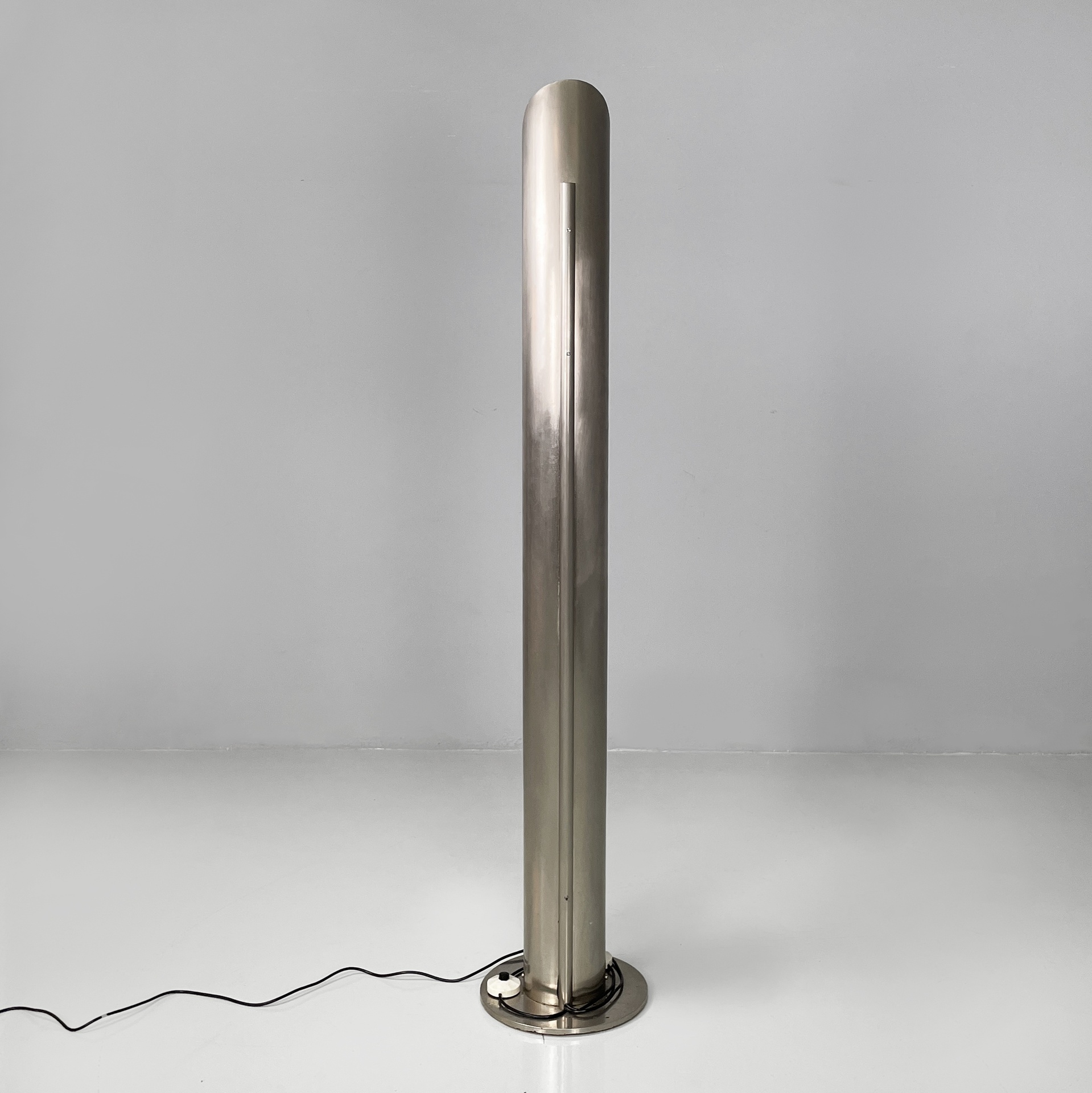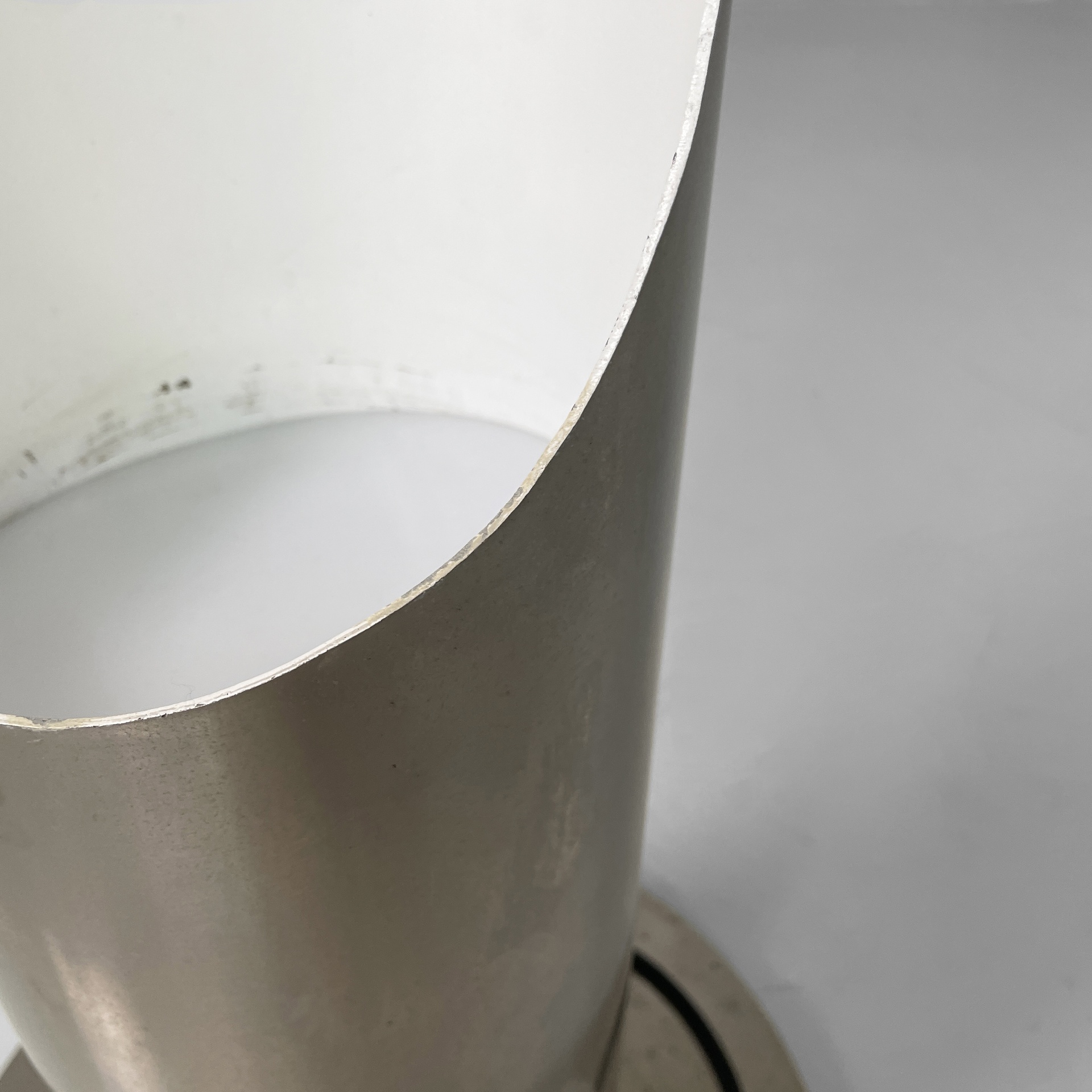 Lampada da terra a base tonda in metallo. Nella parte alta presenta una lamina in metallo curvato con quattro fori, nei quali sono posizionate quattro lampadine. La struttura è composta da una lamina curvata in metallo con interno verniciato bianco. Nella parte bassa è presente un foro dove è presente una seconda fonte luminosa tonda. Base tonda con due interruttori. Space Age.