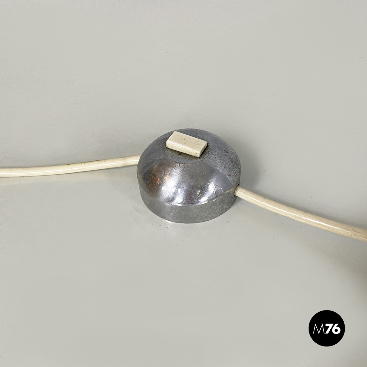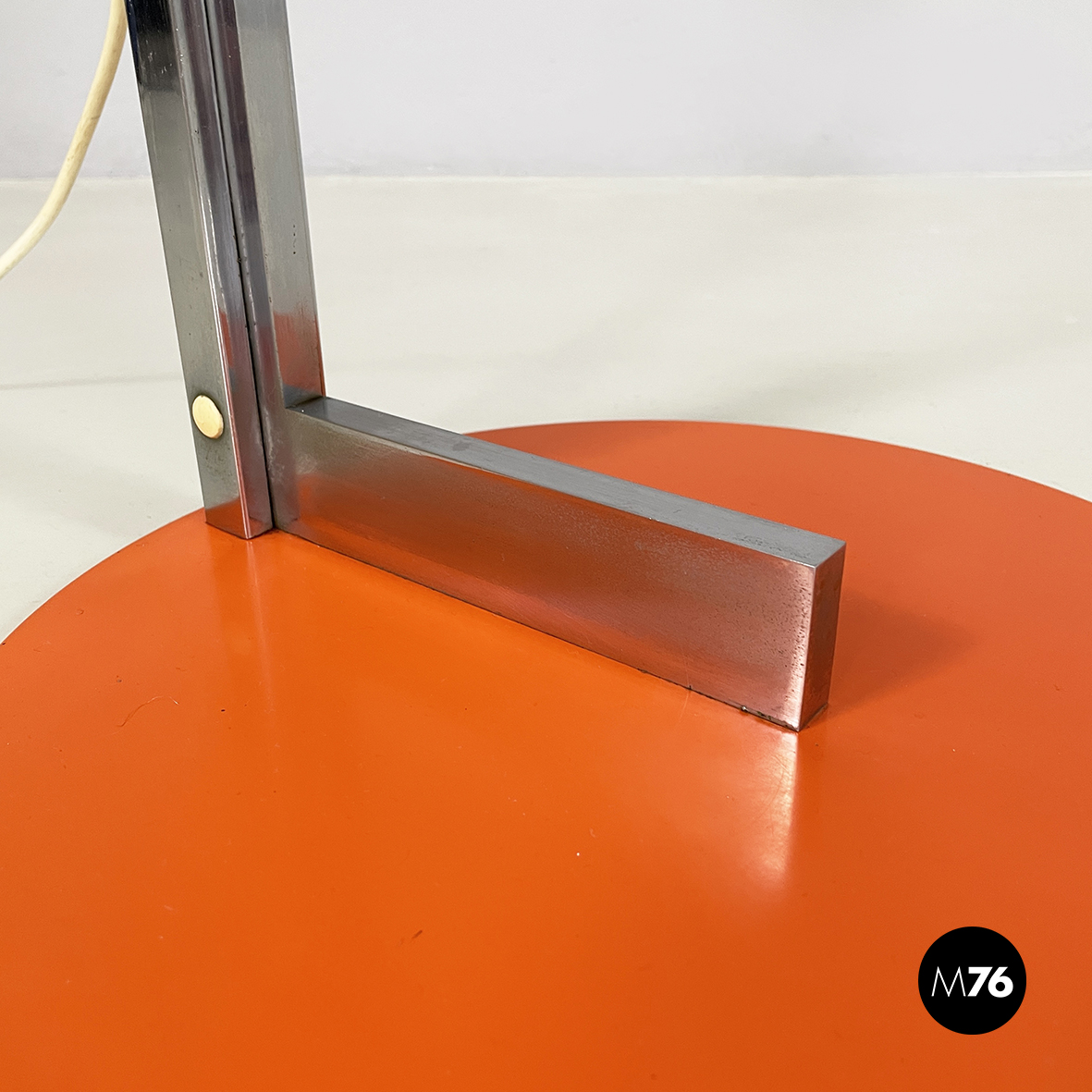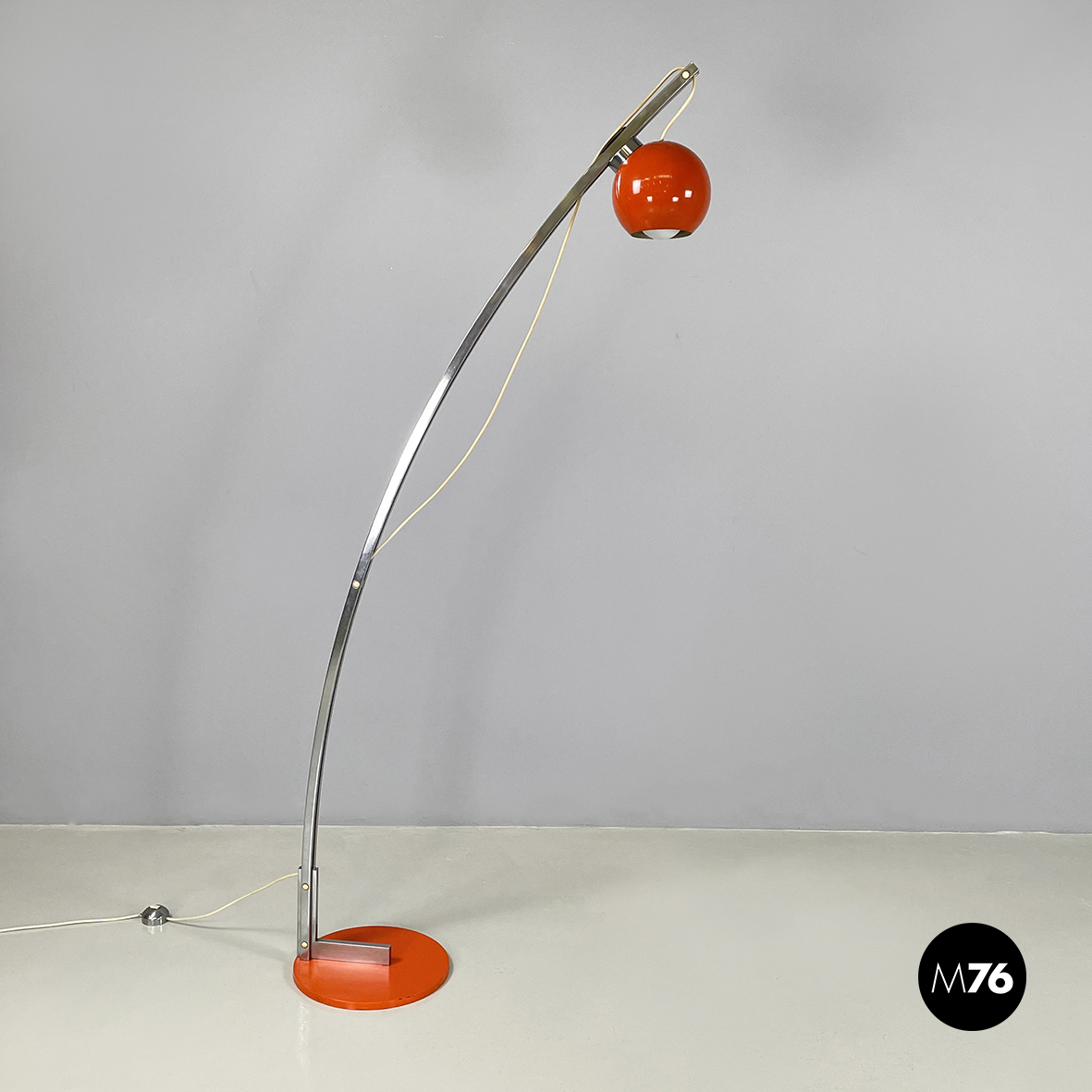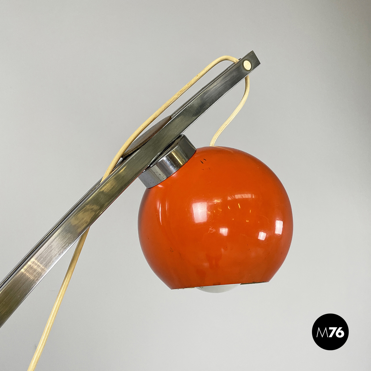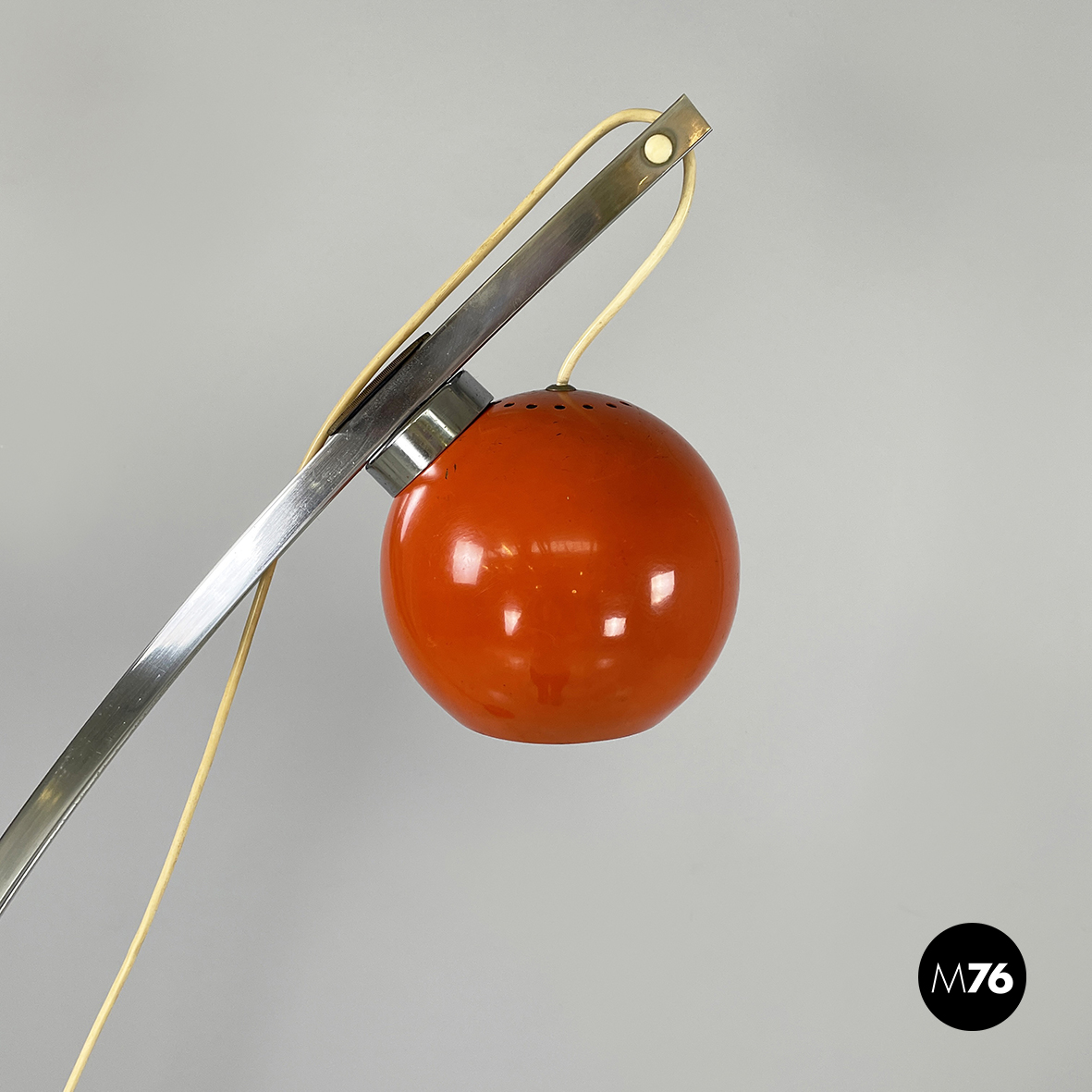 Lampada da terra con diffusore sferico e orientabile in metallo verniciato arancio. La struttura leggermente curvata è composta da due listelli metallici rettangolari, che fungono da “binari” per spostare il diffusore. La base rotonda è in metallo verniciato arancione.