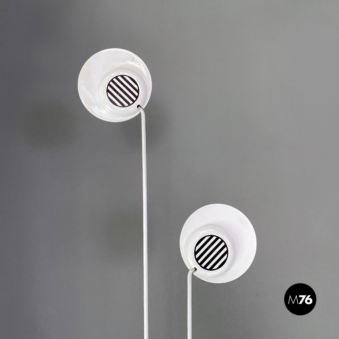 Lampada da terra a base tonda con motivo a righe bianche e nere. Dalla base si sviluppano due steli in tondino di metallo bianco con altezze differenti, saldati tra loro da altri tre tondini di lunghezza inferiore. Diffusori a disco orientabili, con attacco per lampadina alogena da un lato e motivo decorativo bianco e nero dall’altro.