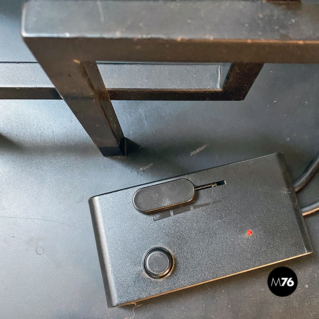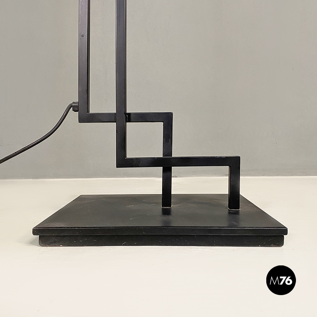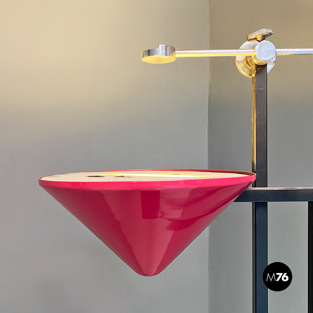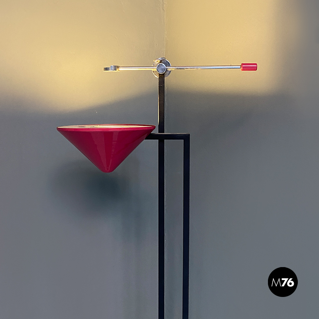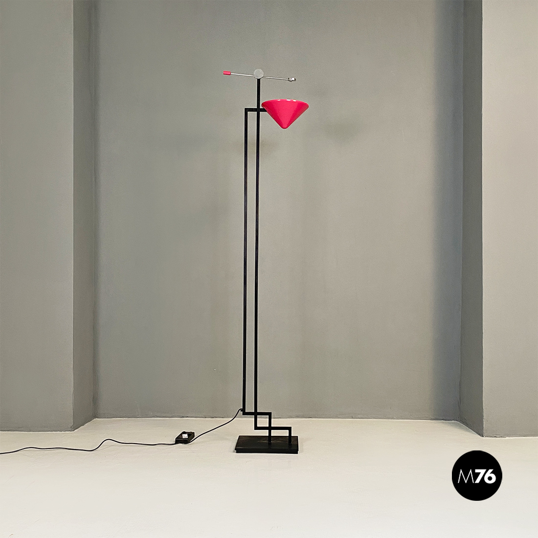 Lampada da terra con base rettangolare in metallo nero, stelo doppio a sezione quadrata, sempre in metallo nero e diffusore di forma conica, rovesciato, in metallo color magenta. Sul paralume è posta una asta con posizione regolabile in acciaio cromato, con un piccolo tondino a fare da terminale.
