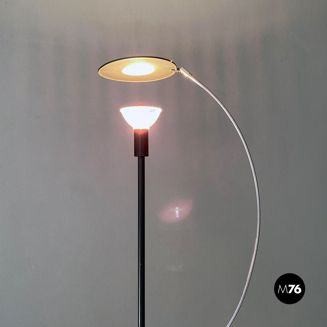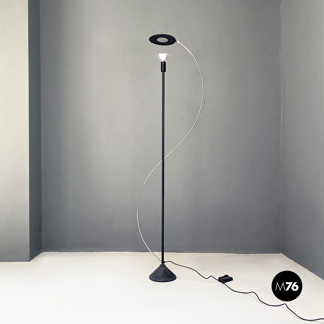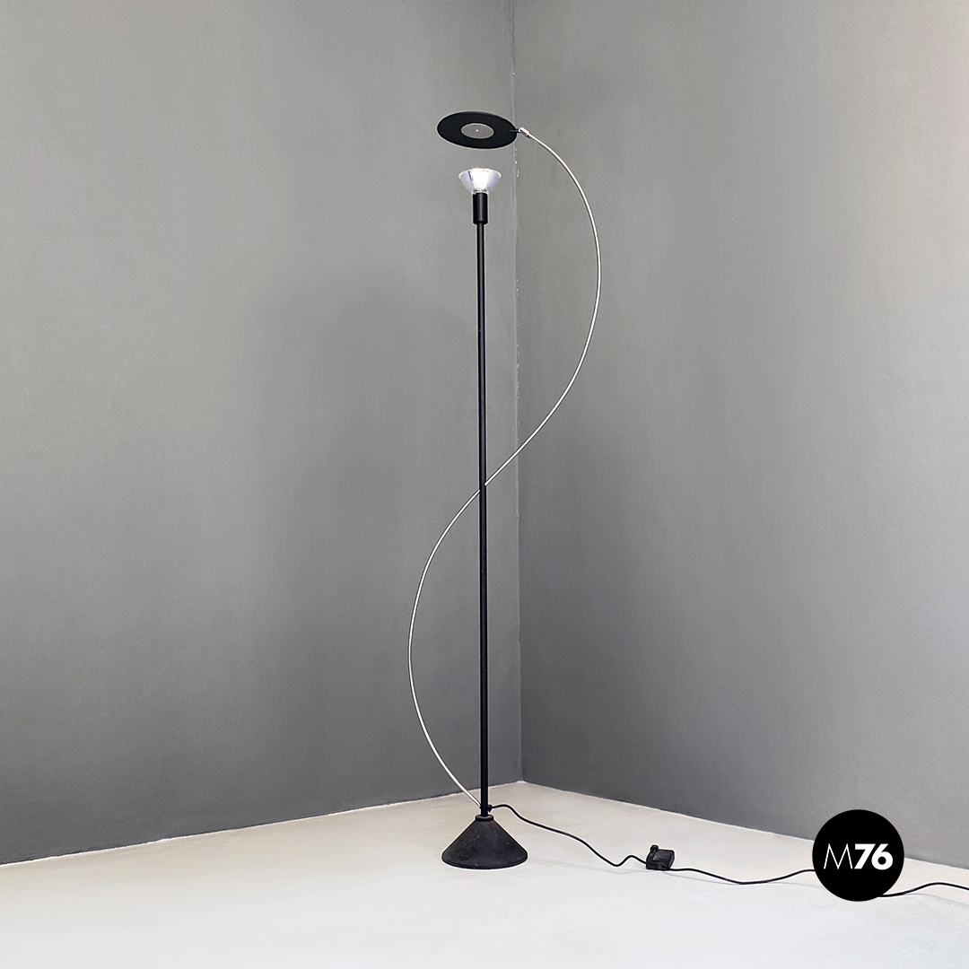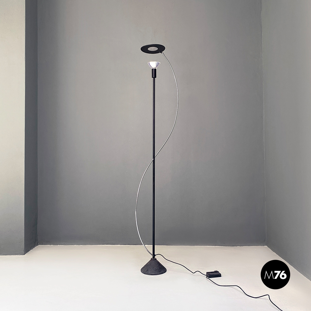 Lampada da terra a base conica, stelo in metallo nero centrale a cui si interseca un secondo tondino decorativo in acciaio a forma di “esse”. Lampadina alogena con disco riflettente posto al di sopra.