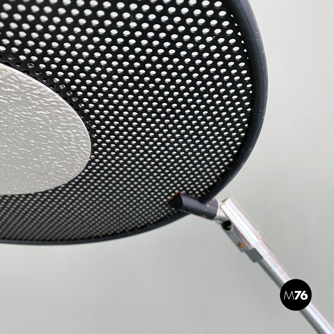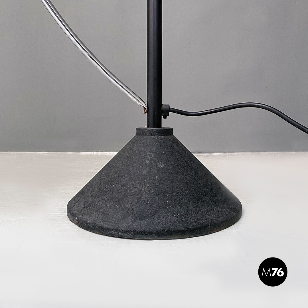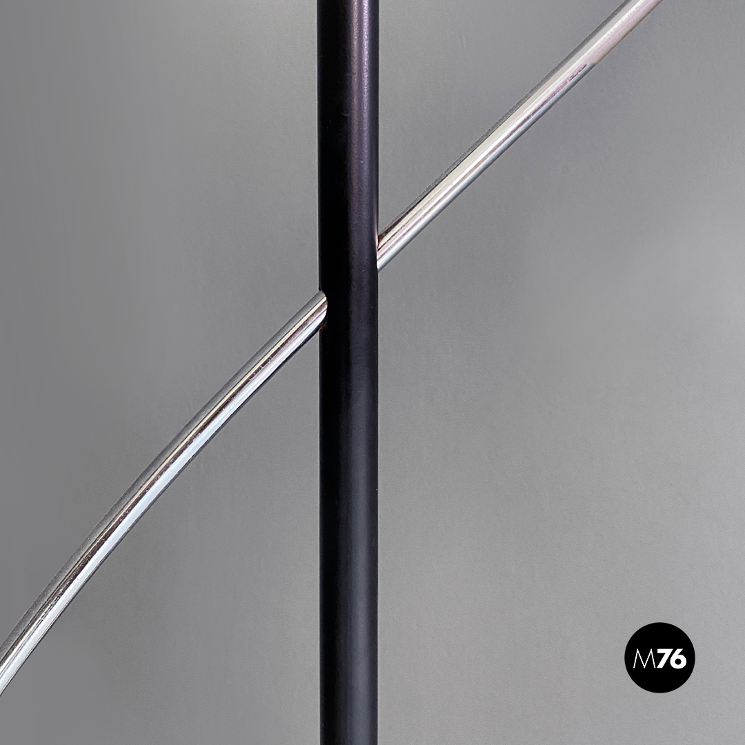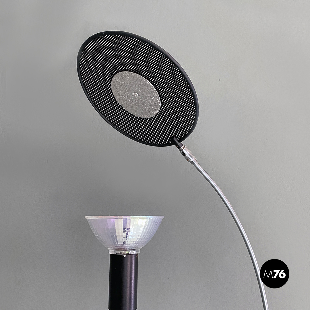 Lampada da terra a base conica, stelo in metallo nero centrale a cui si interseca un secondo tondino decorativo in acciaio a forma di “esse”. Lampadina alogena con disco riflettente posto al di sopra.