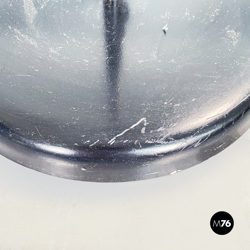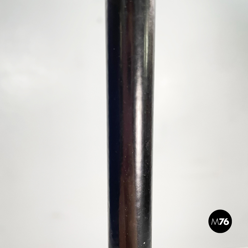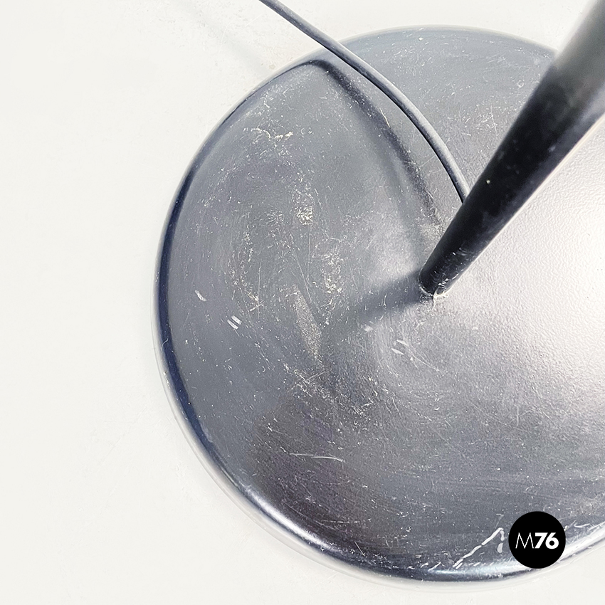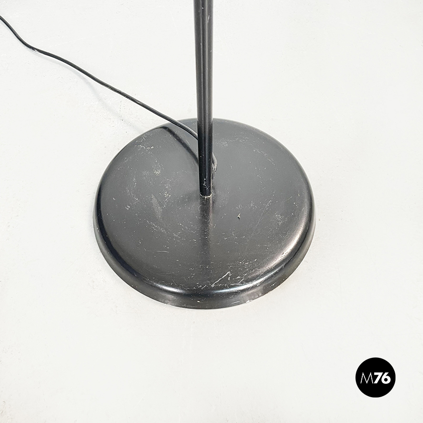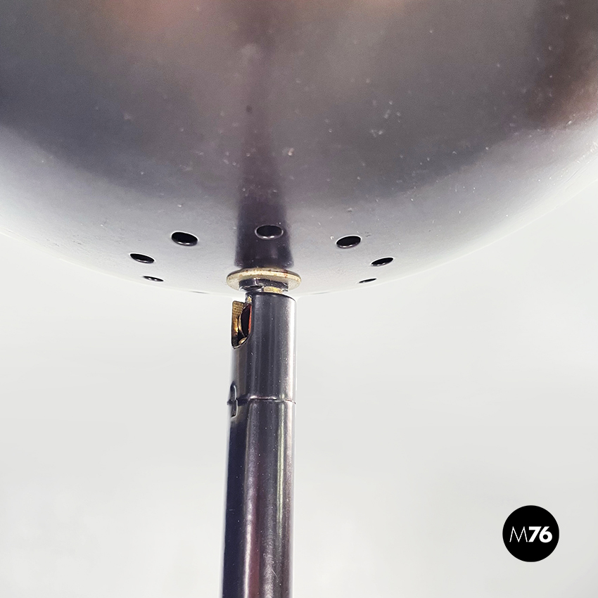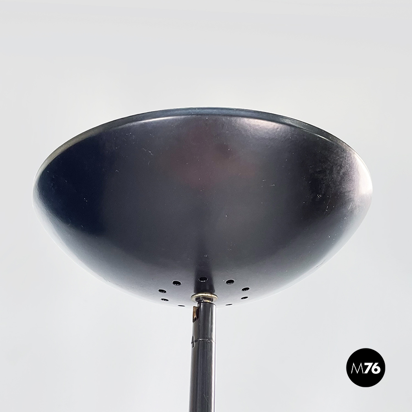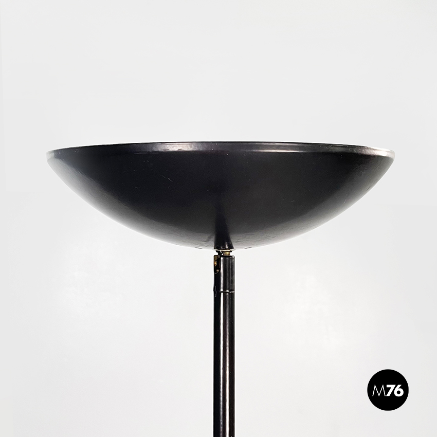 Lampada da terra a base tonda in metallo verniciato nero. Il paralume è semisferico, che permette un’illuminazione verso l’alto diffusa. La struttura centrale è a stelo.