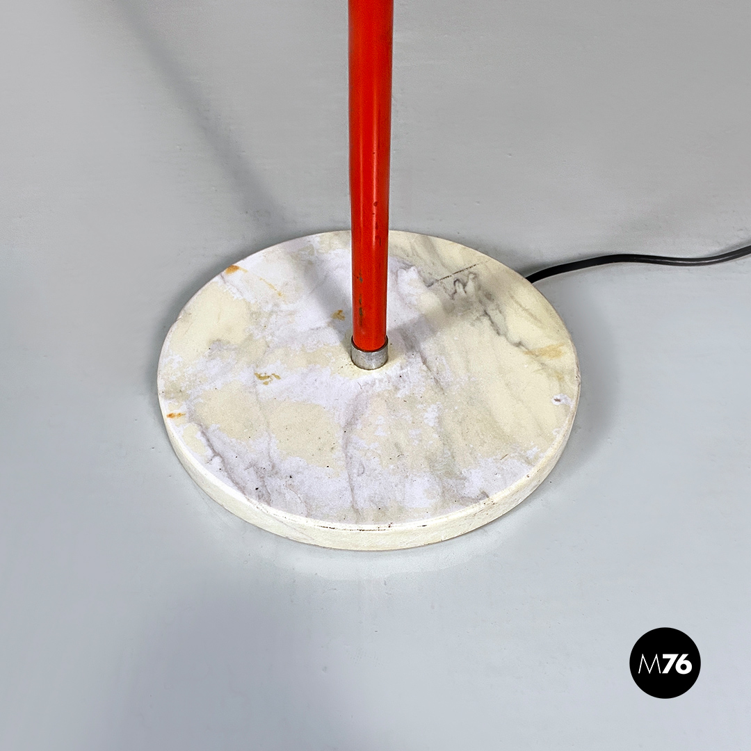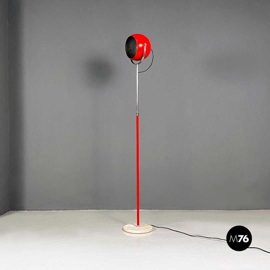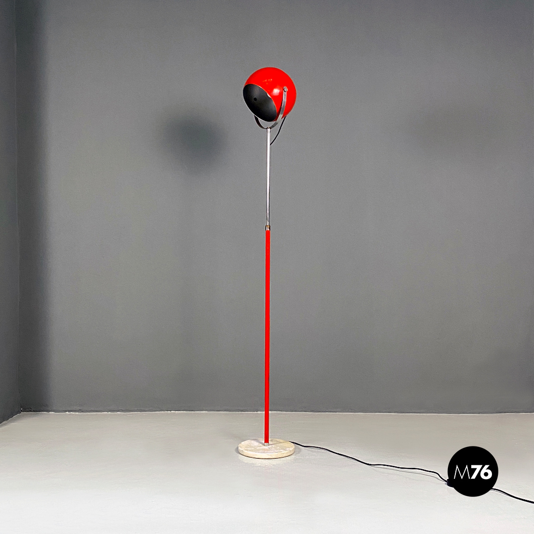 Lampada da terra con base tonda in marmo, stelo in metallo rosso con parte terminale in acciaio cromato a cui è ancorato il diffusore a sfera orientabile, sempre in metallo rosso, con finitura interna color argento satinato.
