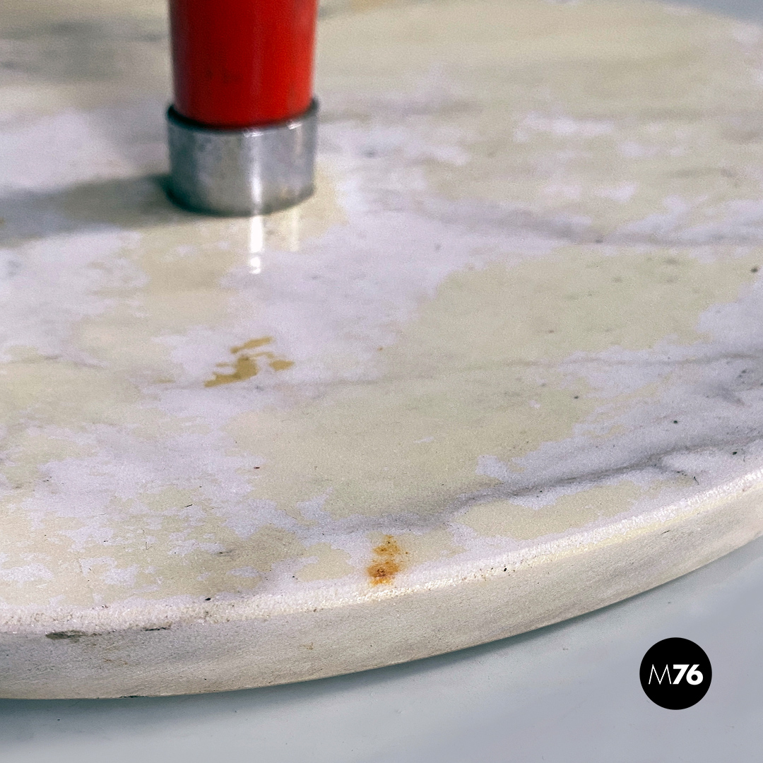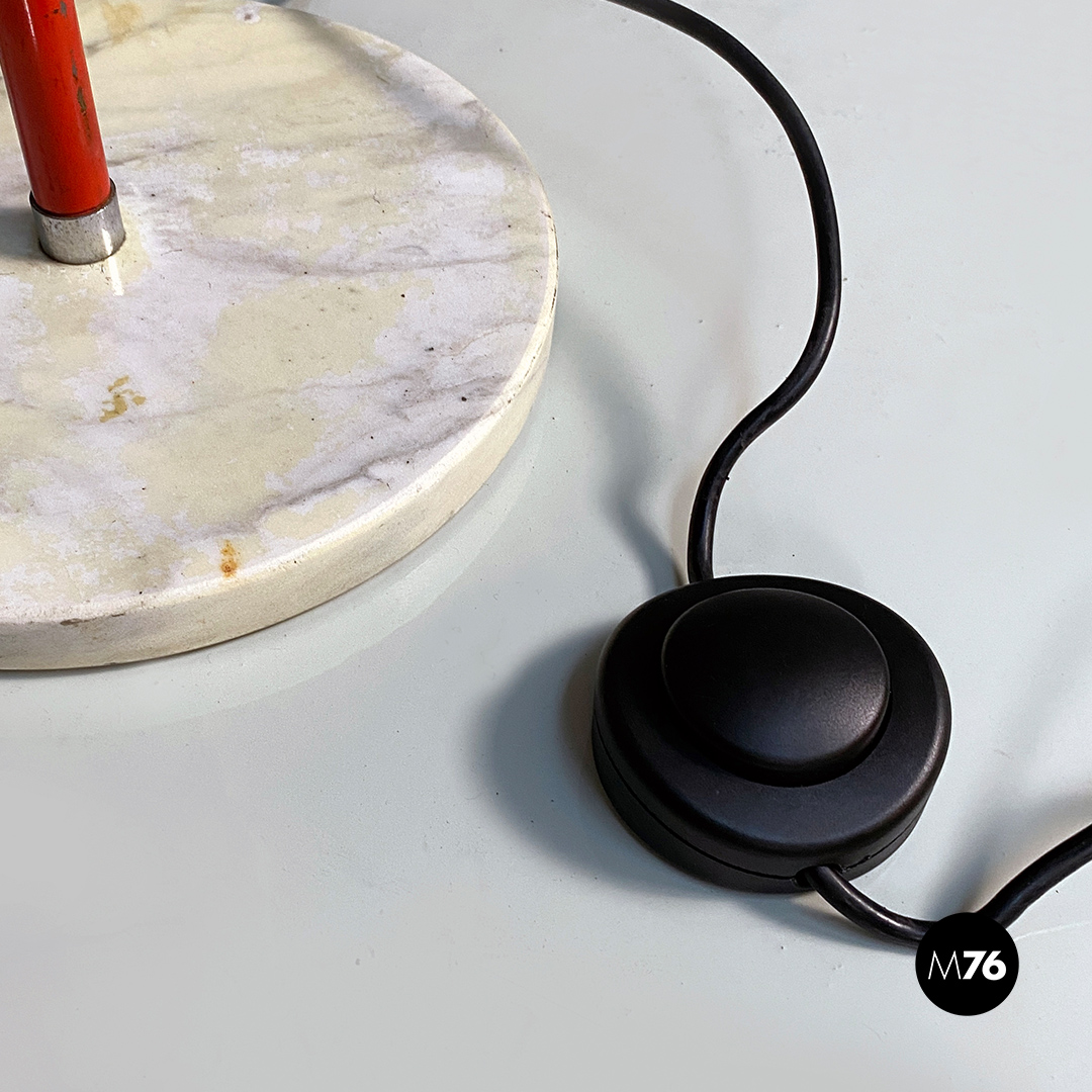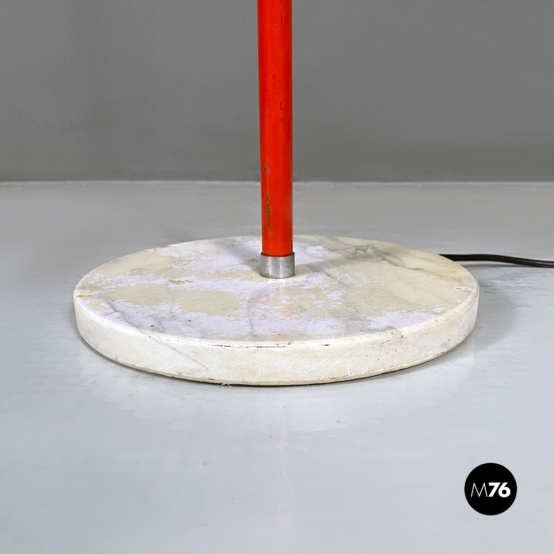 Lampada da terra con base tonda in marmo, stelo in metallo rosso con parte terminale in acciaio cromato a cui è ancorato il diffusore a sfera orientabile, sempre in metallo rosso, con finitura interna color argento satinato.