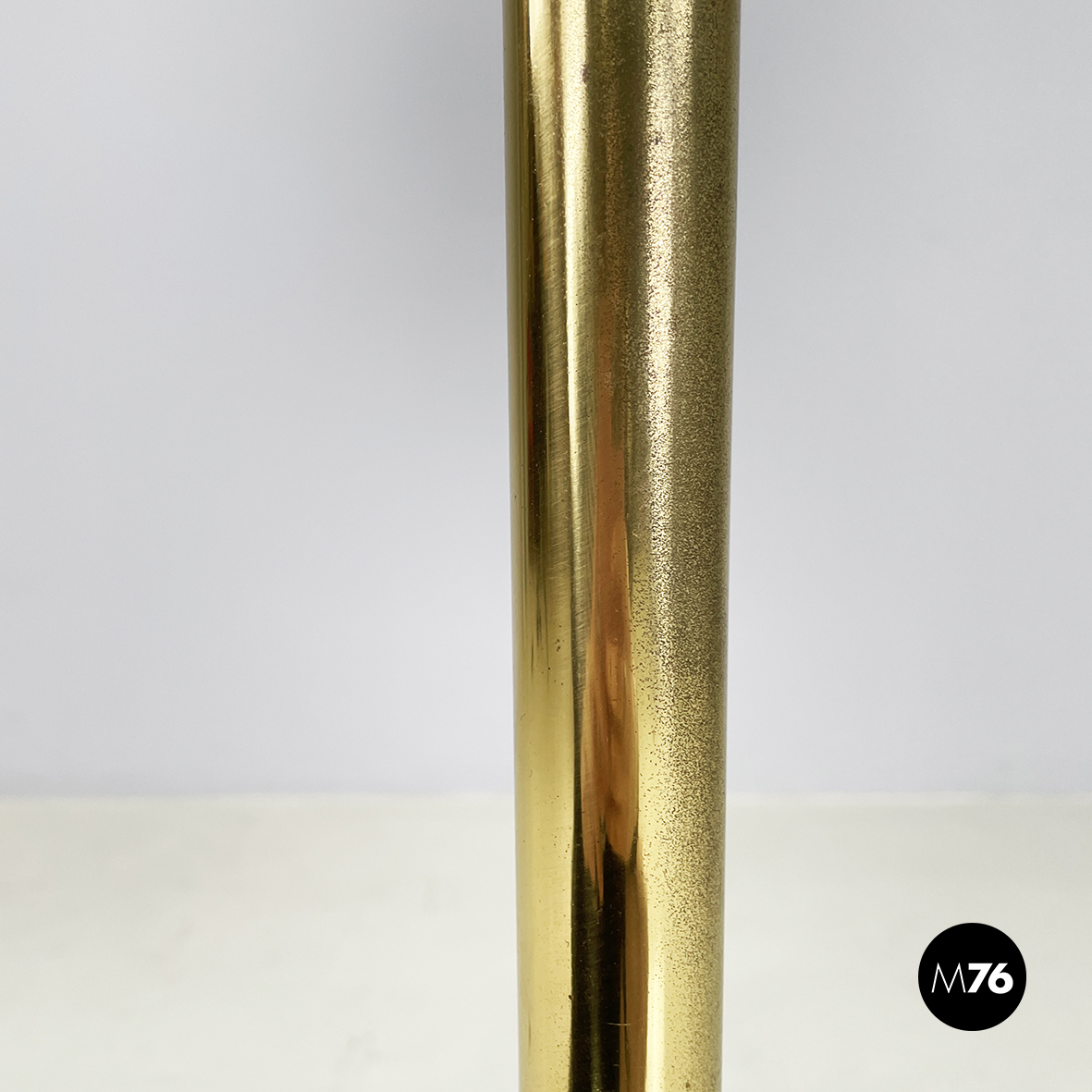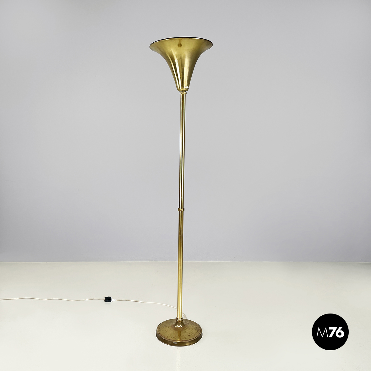 Lampada da terra a base tonda interamente in ottone. Il diffusore conico presenta una silhouette tondeggiante. La struttura a sezione tonda presenta al centro un anello decorativo con scanalature. Base tonda.