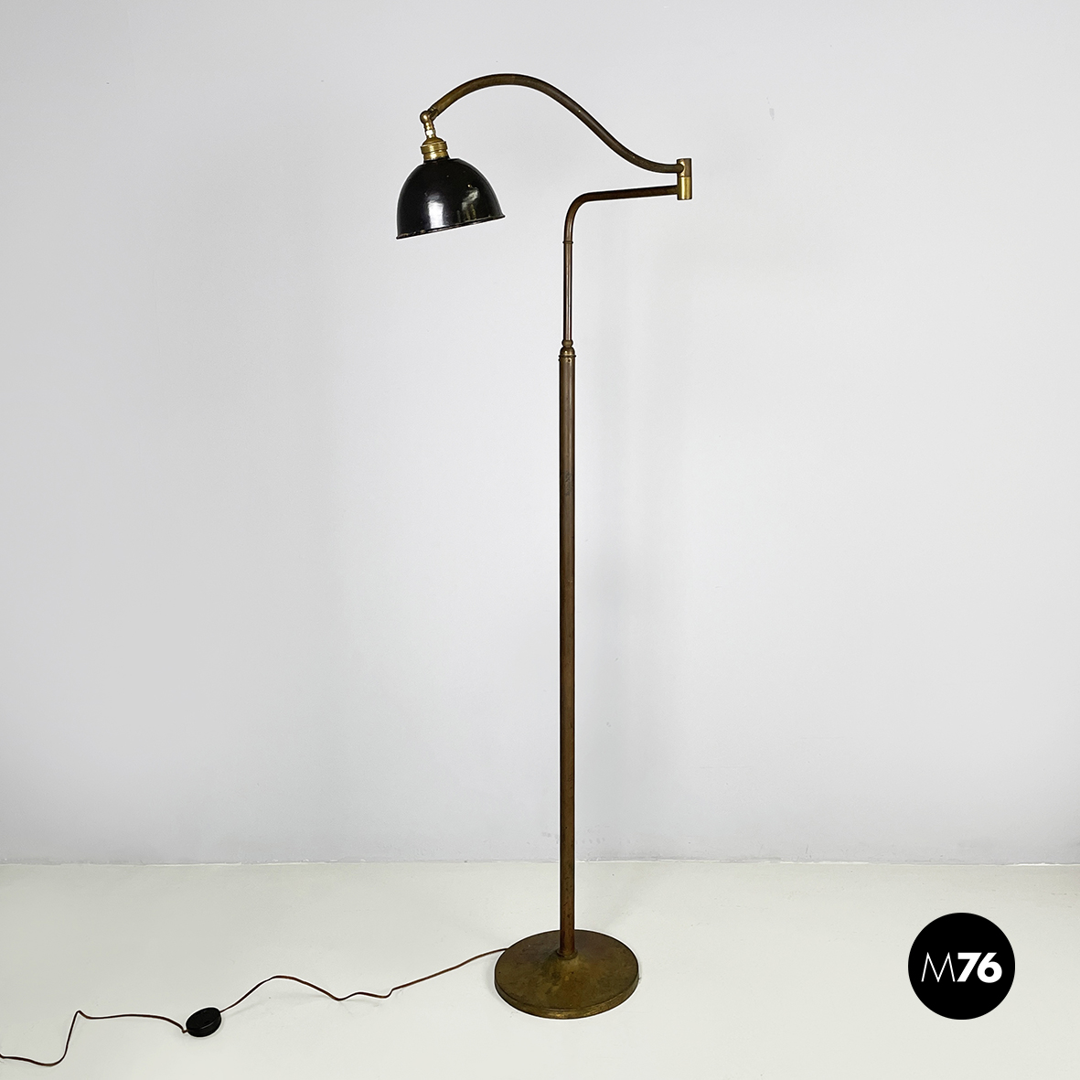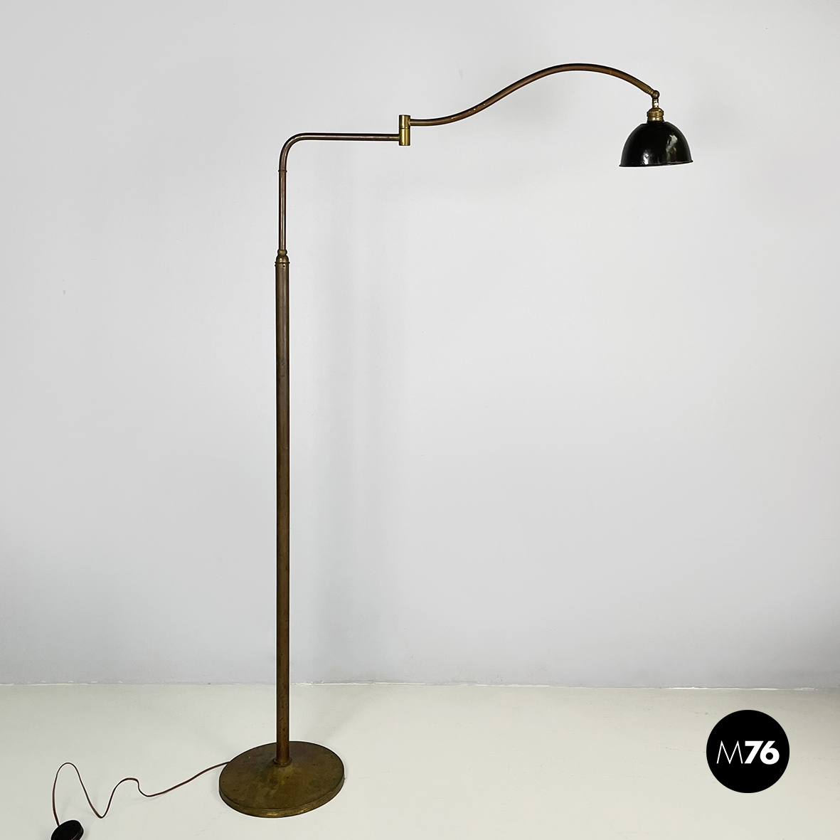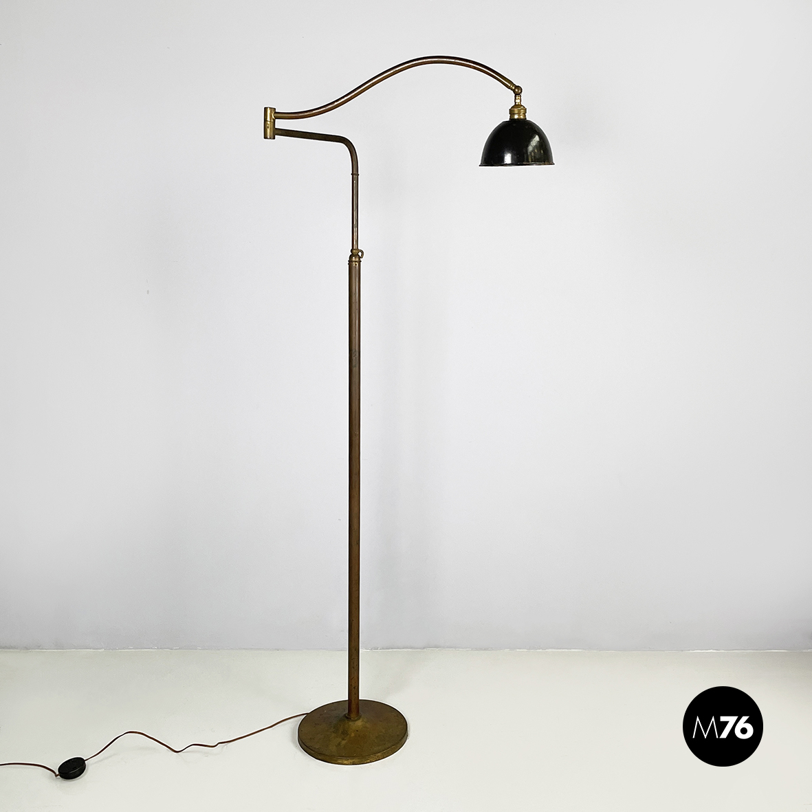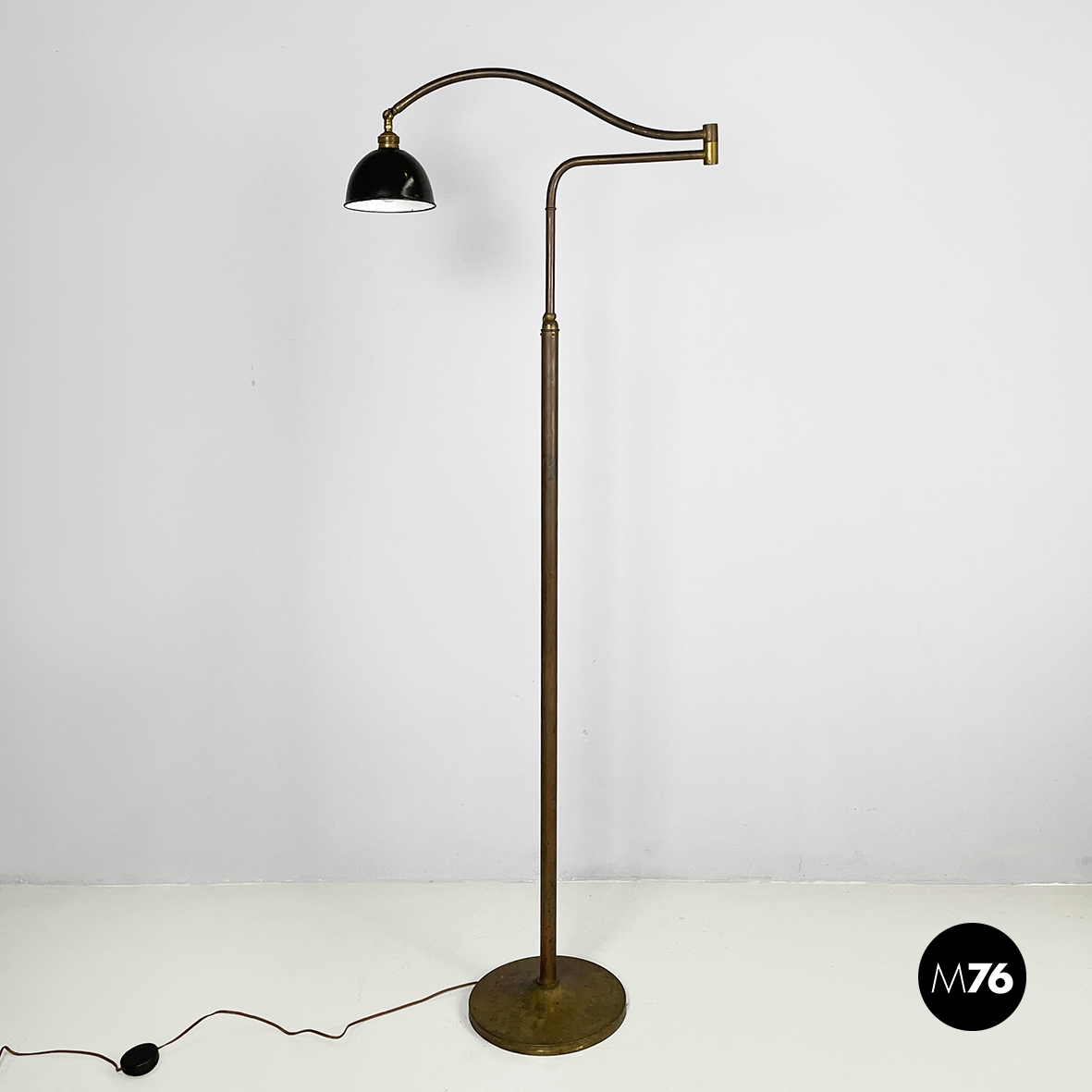 Lampada da terra con diffusore orientabile a cupola in metallo verniciato nero esternamente e bianco internamente. Il paralume è collegato alla struttura in ottone grazie a due bracci snodabili e curvi, in tondino di ottone. Base tonda in ottone.