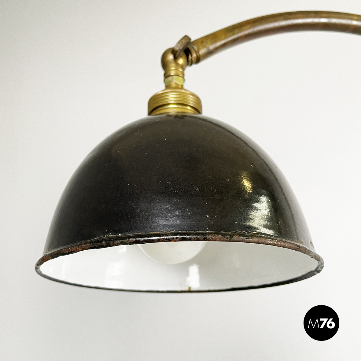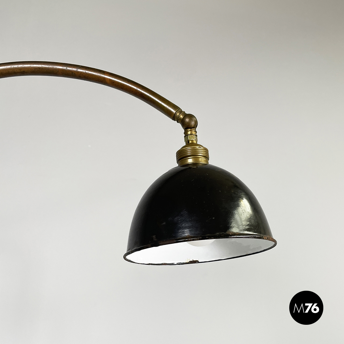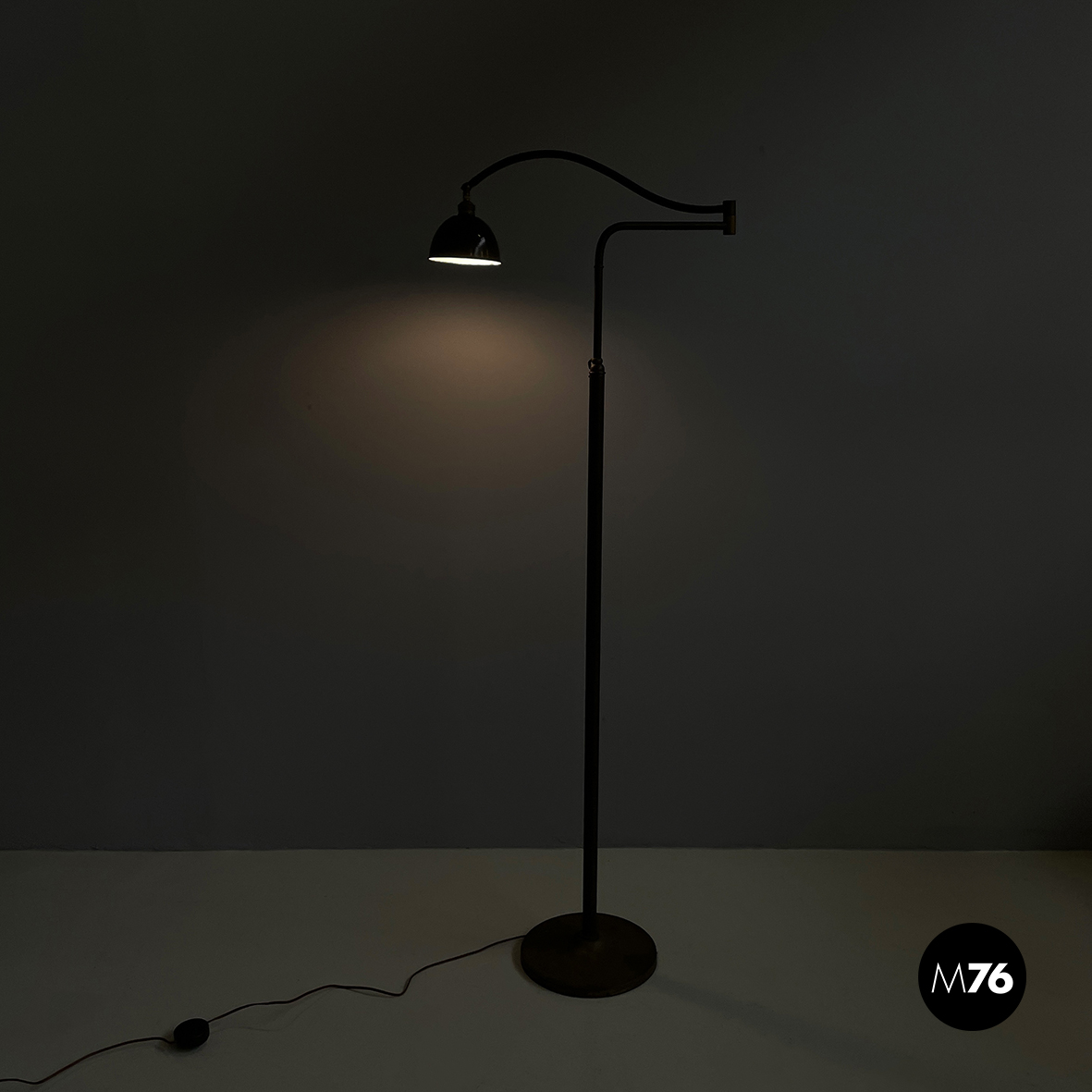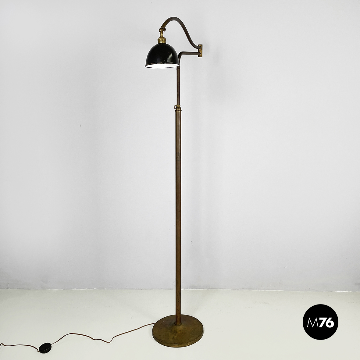 Lampada da terra con diffusore orientabile a cupola in metallo verniciato nero esternamente e bianco internamente. Il paralume è collegato alla struttura in ottone grazie a due bracci snodabili e curvi, in tondino di ottone. Base tonda in ottone.