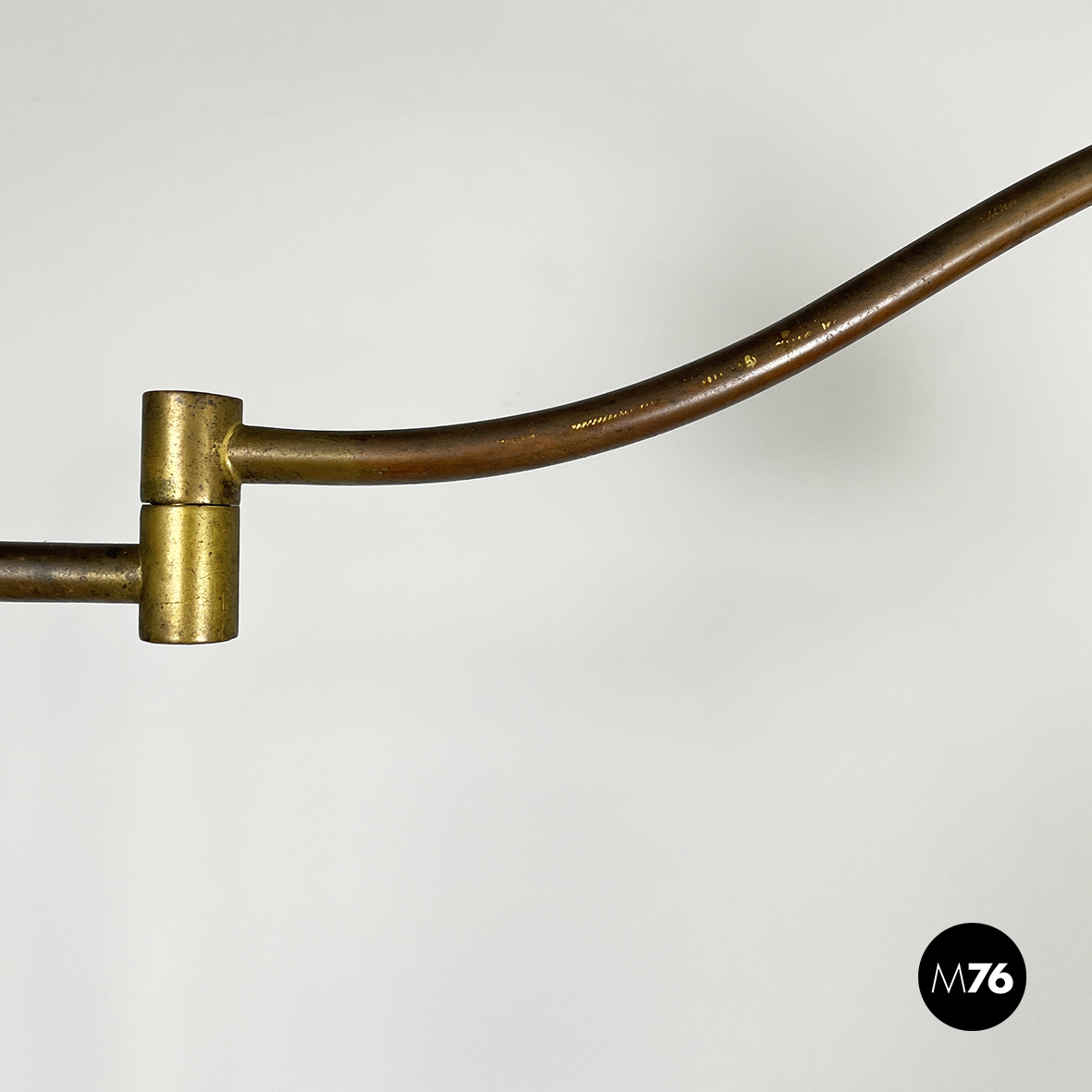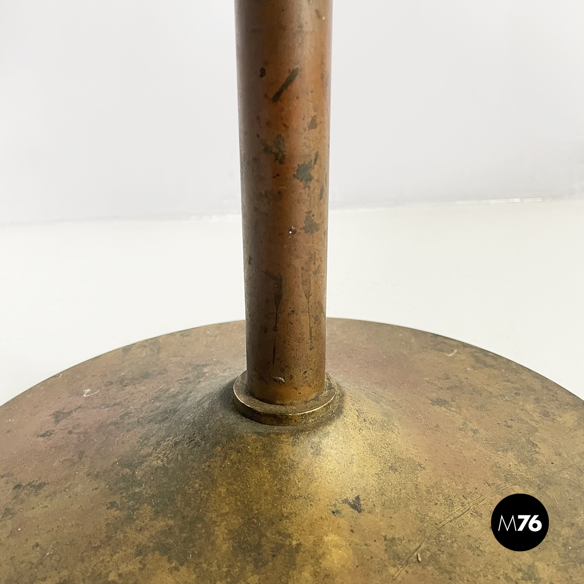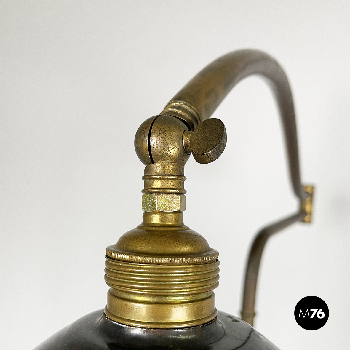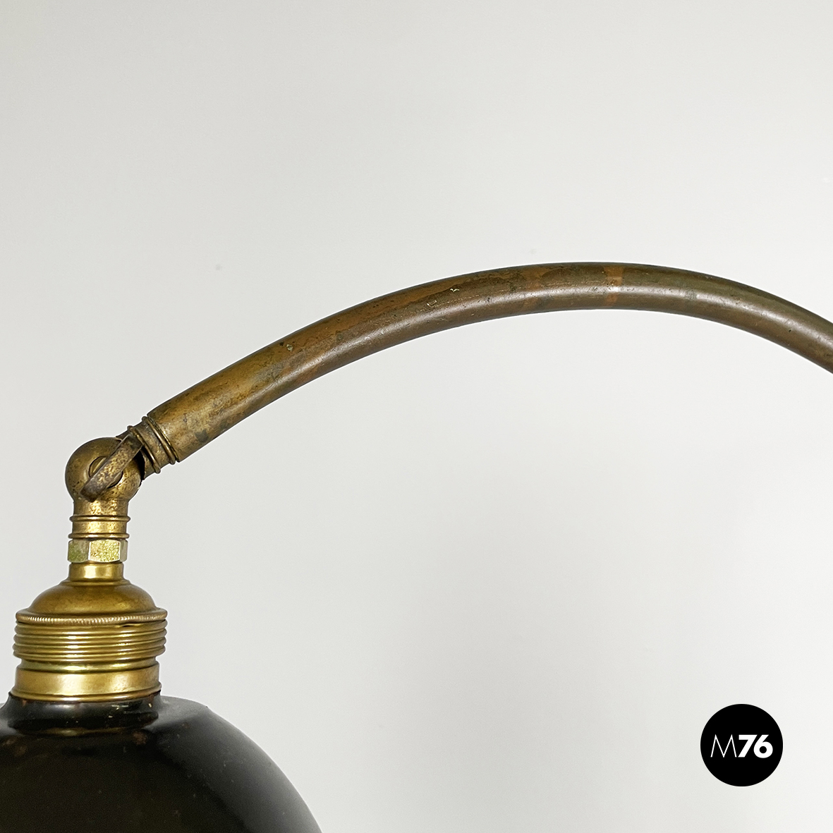 Lampada da terra con diffusore orientabile a cupola in metallo verniciato nero esternamente e bianco internamente. Il paralume è collegato alla struttura in ottone grazie a due bracci snodabili e curvi, in tondino di ottone. Base tonda in ottone.