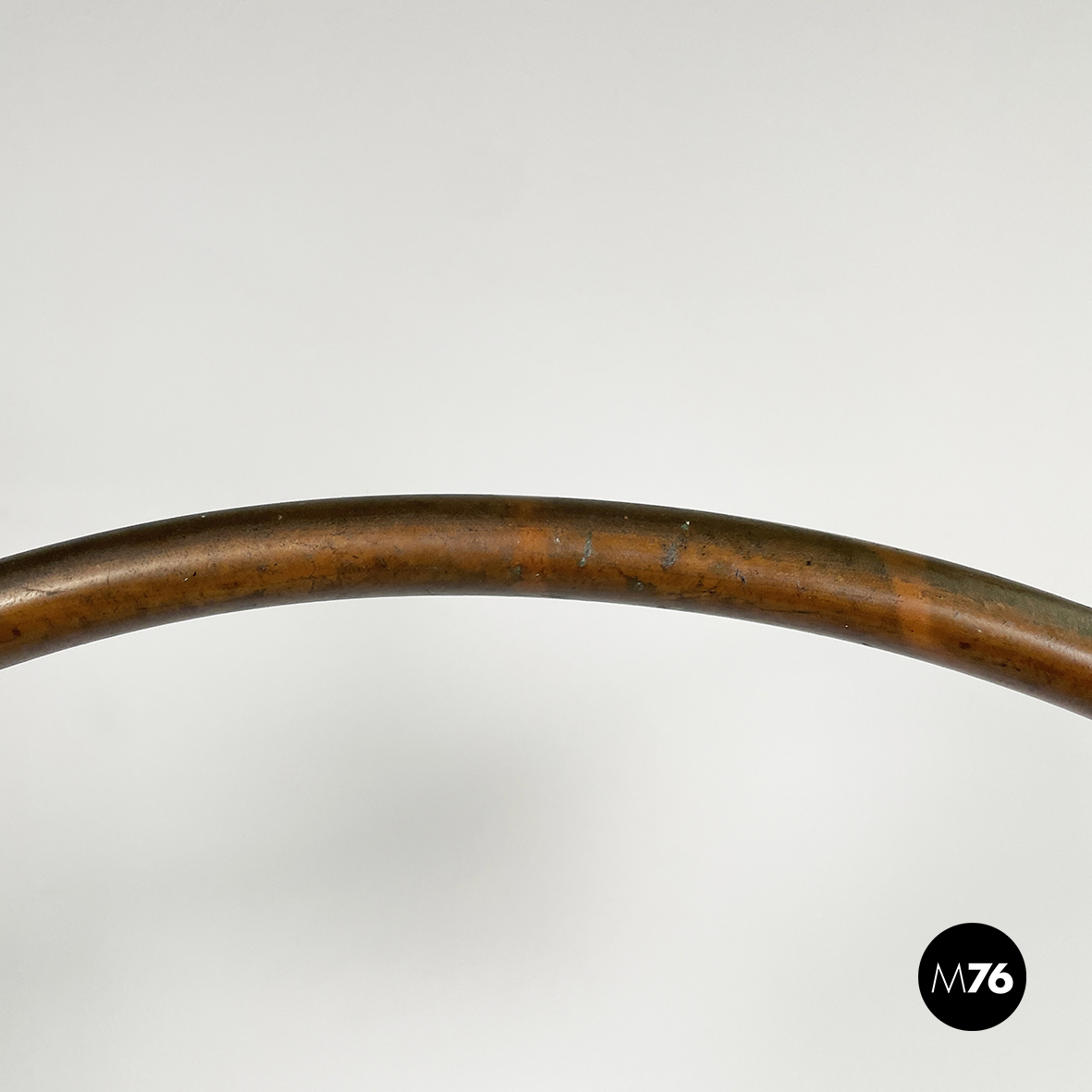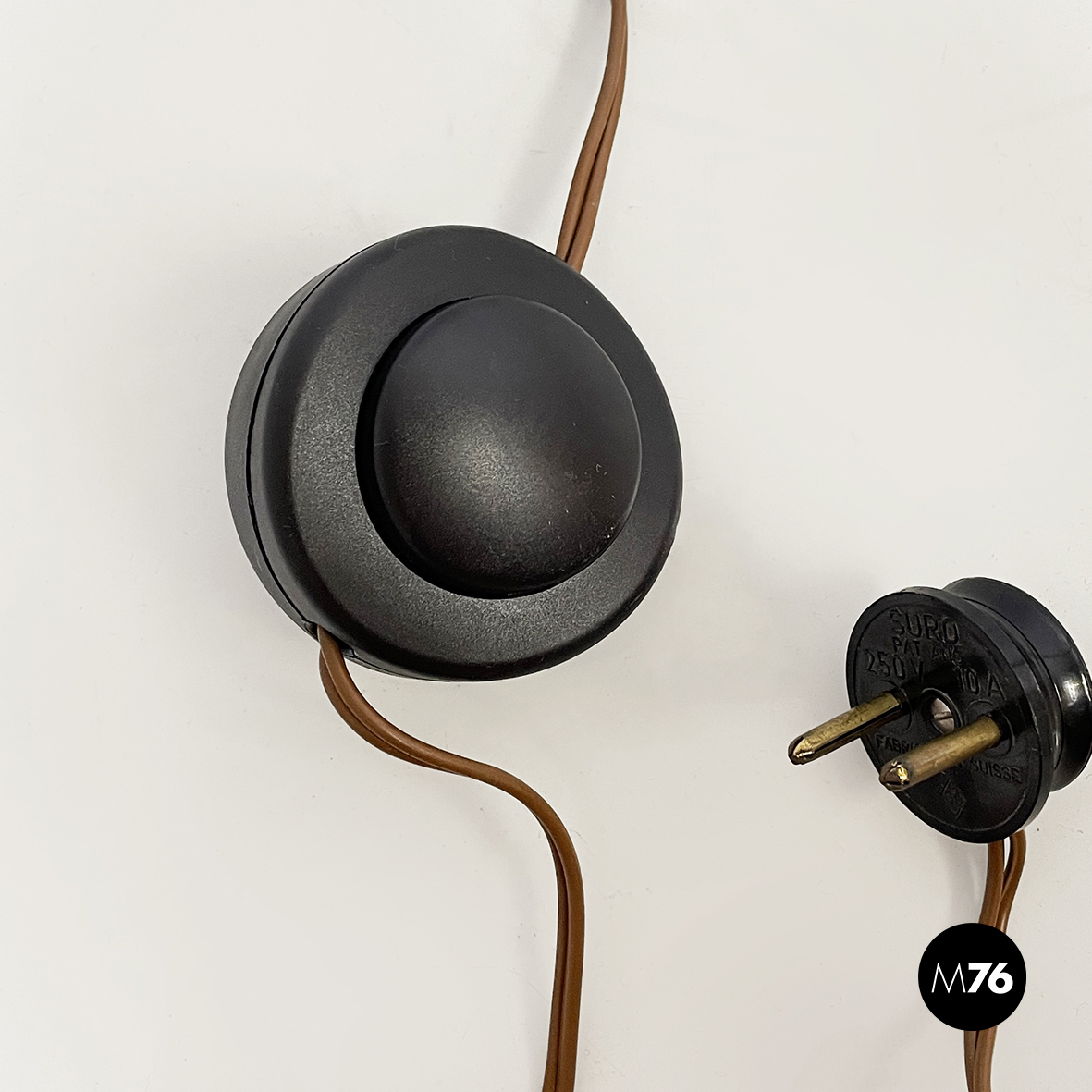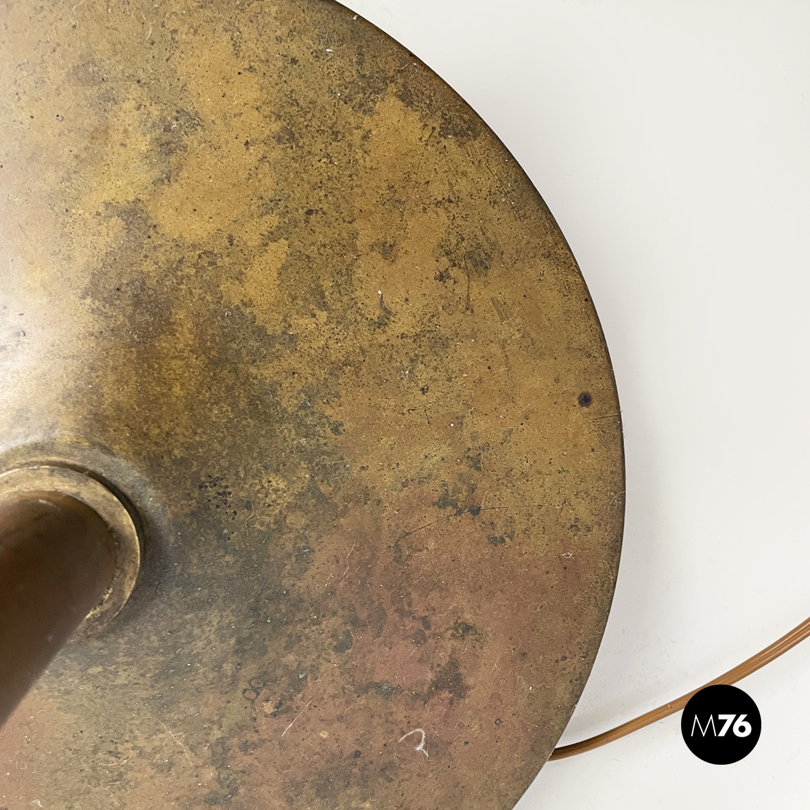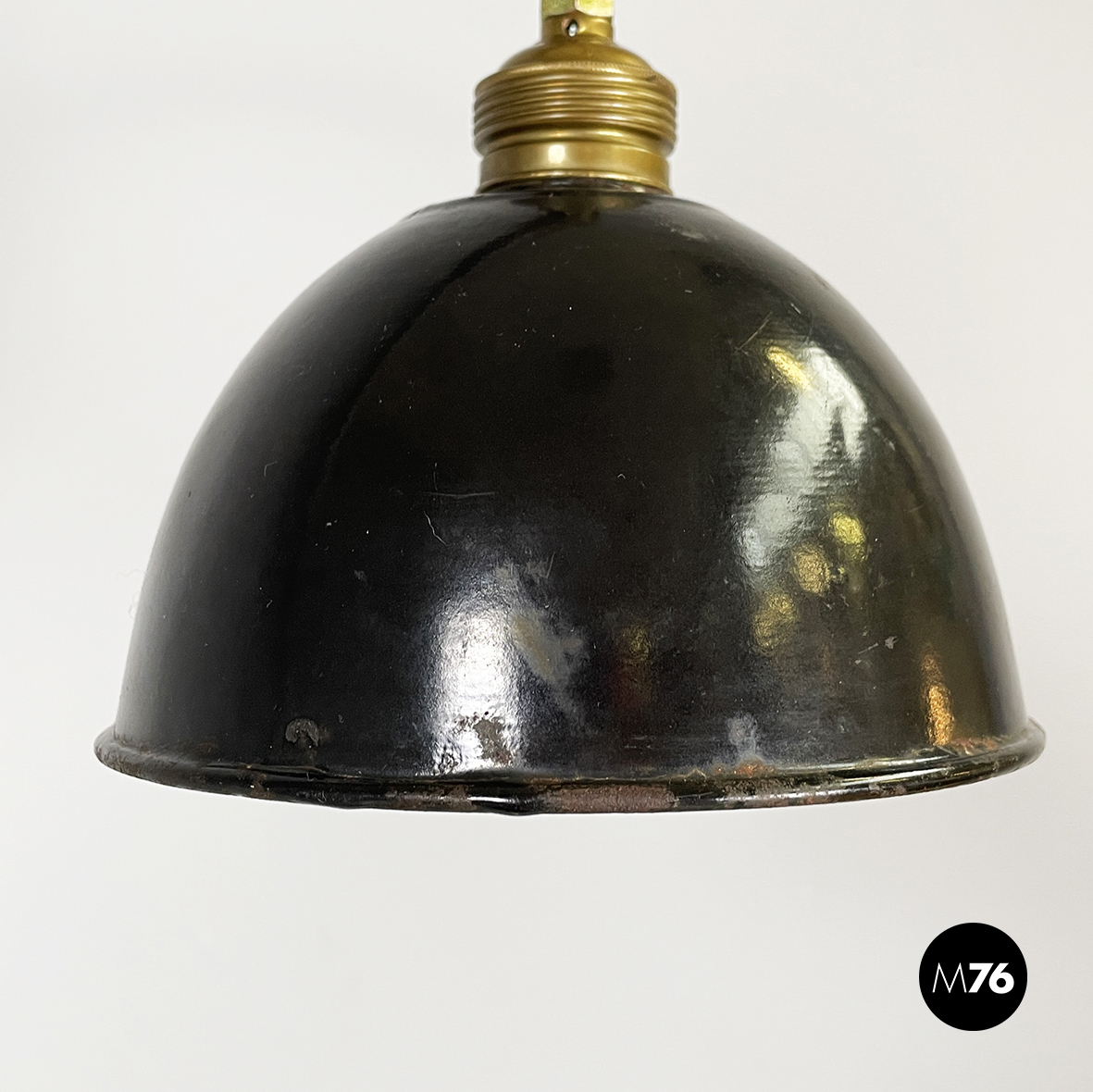 Lampada da terra con diffusore orientabile a cupola in metallo verniciato nero esternamente e bianco internamente. Il paralume è collegato alla struttura in ottone grazie a due bracci snodabili e curvi, in tondino di ottone. Base tonda in ottone.
