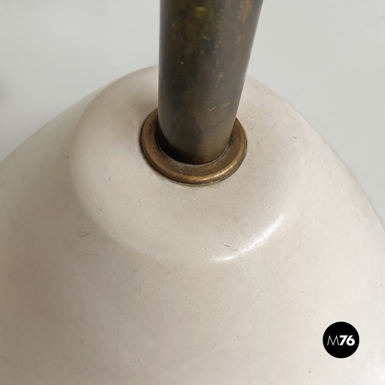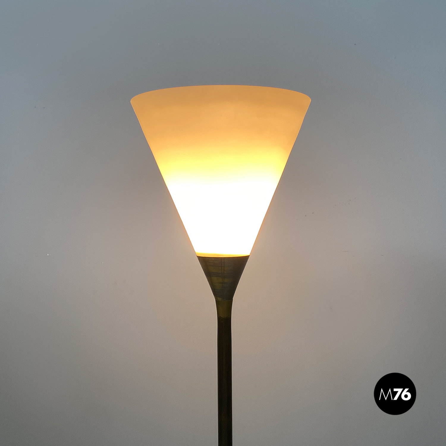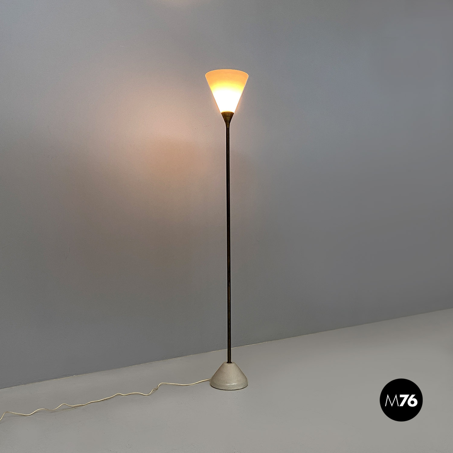 Lampada da terra con stelo e il cono, su cui è posto il paralume, in ottone. Base in fusione di ghisa laccata bianca. Il vetro è originale, triplex, bianco opaco all’esterno e bianco lucido all’interno per ottenere una migliore riflessione della luce.