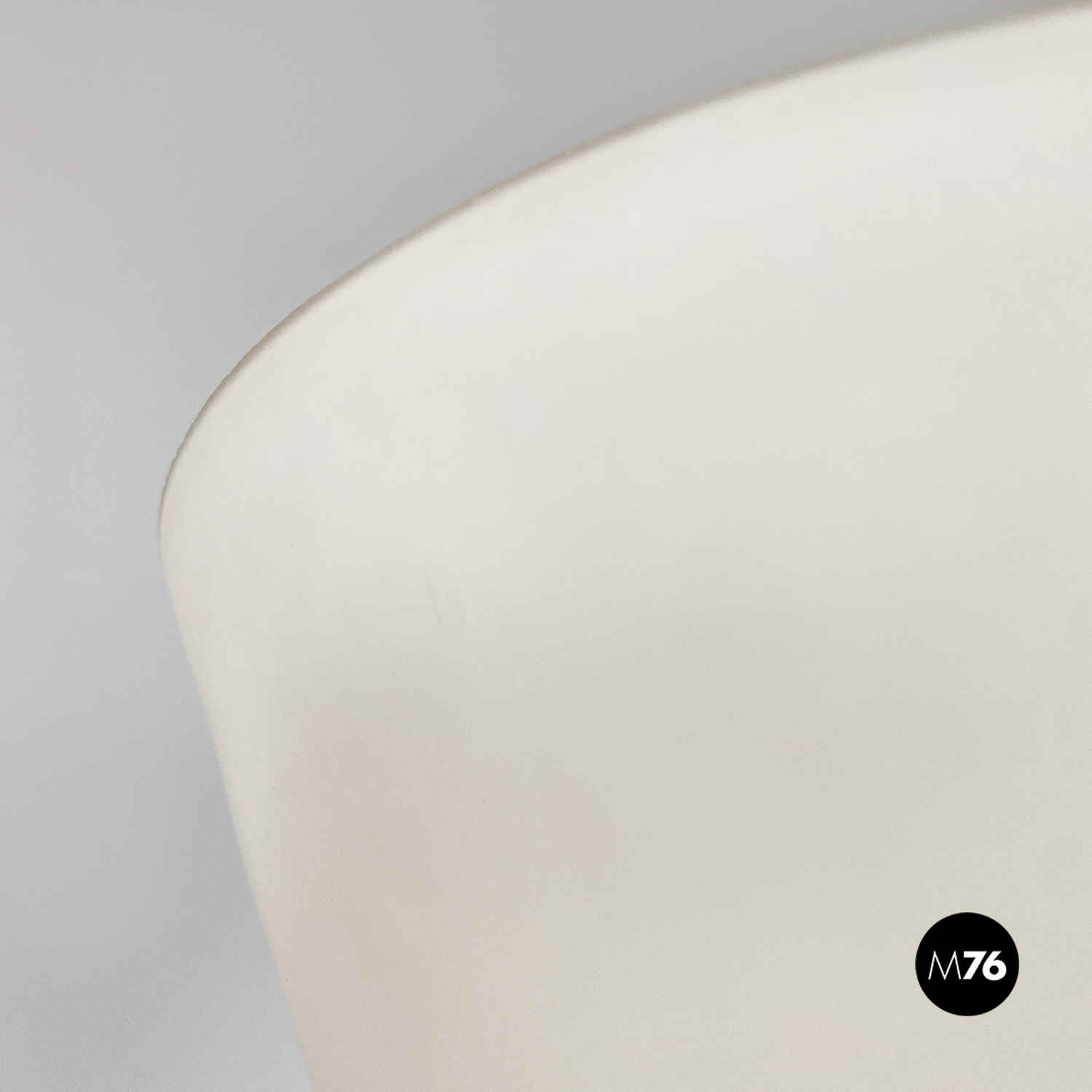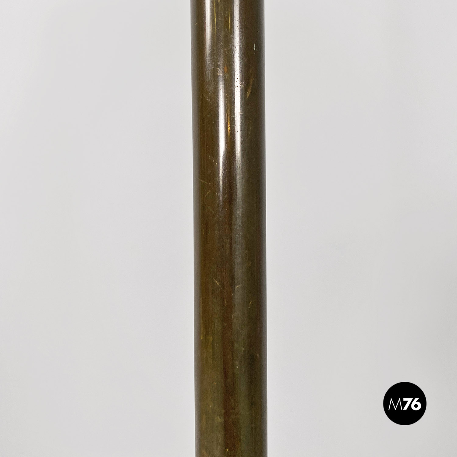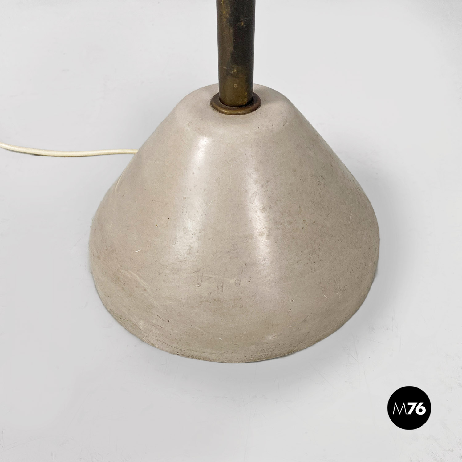 Lampada da terra con stelo e il cono, su cui è posto il paralume, in ottone. Base in fusione di ghisa laccata bianca. Il vetro è originale, triplex, bianco opaco all’esterno e bianco lucido all’interno per ottenere una migliore riflessione della luce.