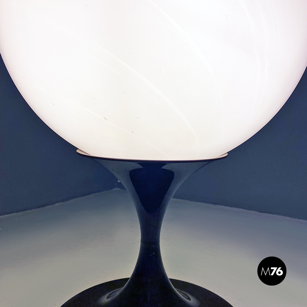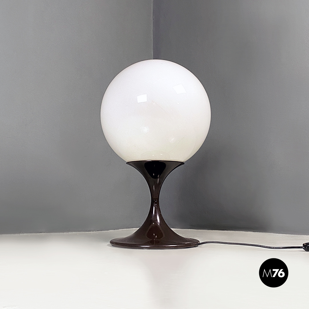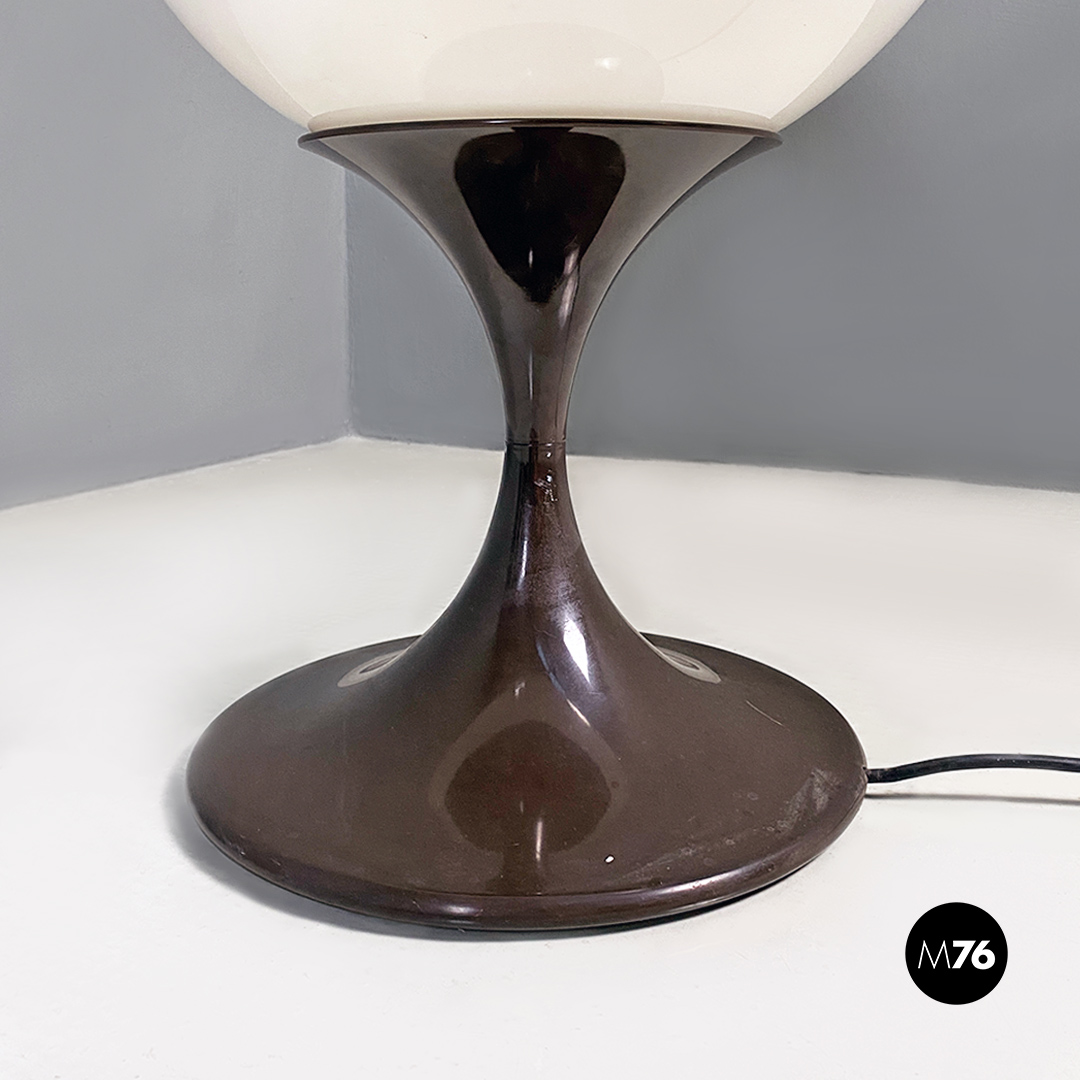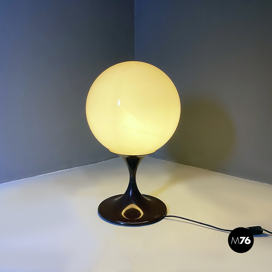 Lampada da tavolo o da terra con base di forma “tulip” in plastica marrone e diffusore a sfera in vetro opalino.