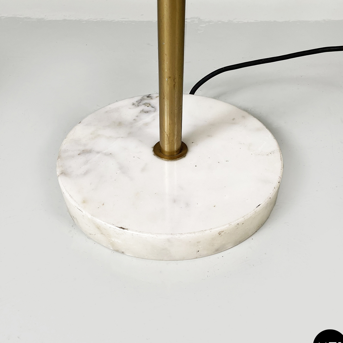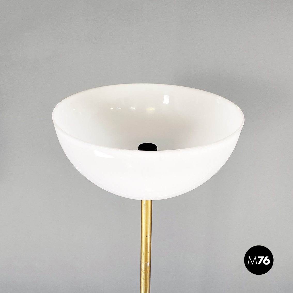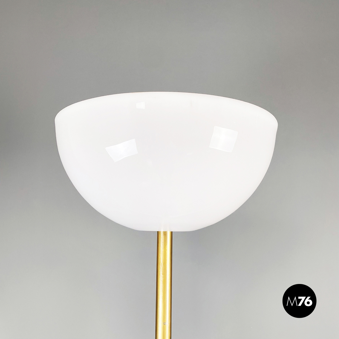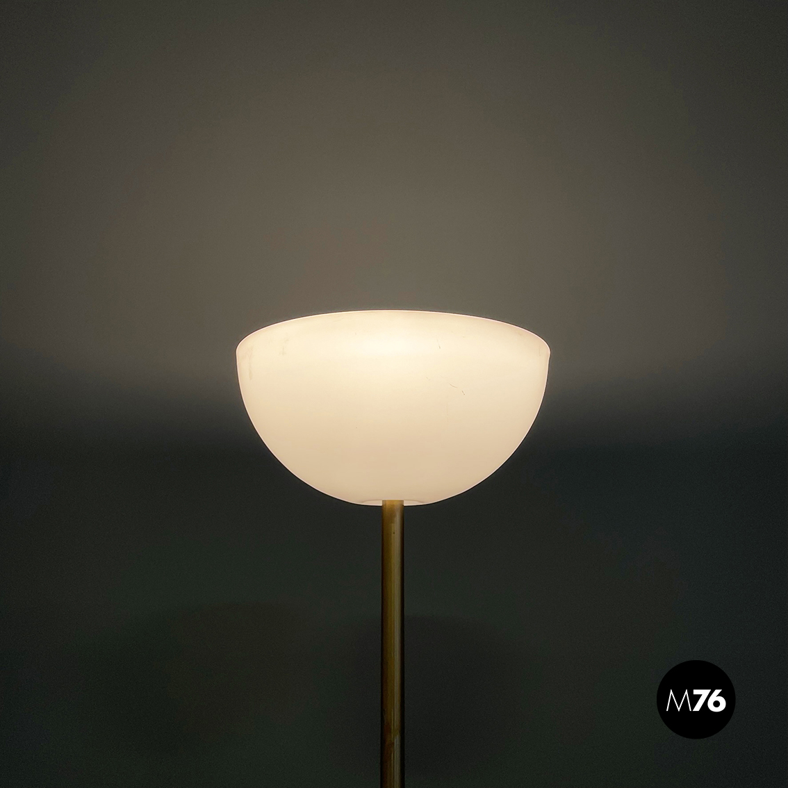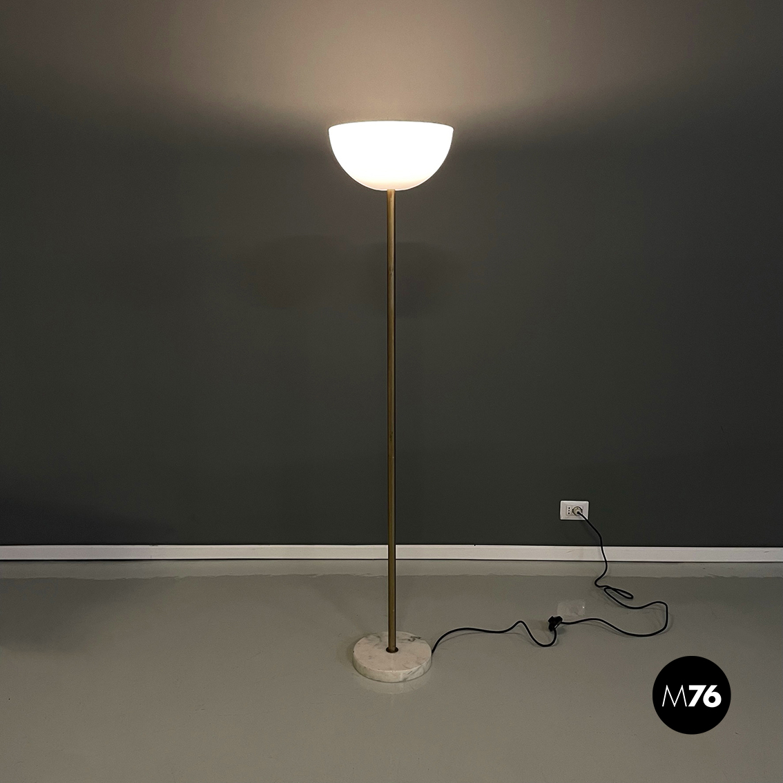 Lampada da terra a base tonda in marmo chiaro. Il diffusore a semisfera è in plexiglass opalino. La struttura centrale è composta da uno stelo in metallo con finitura dorata.
