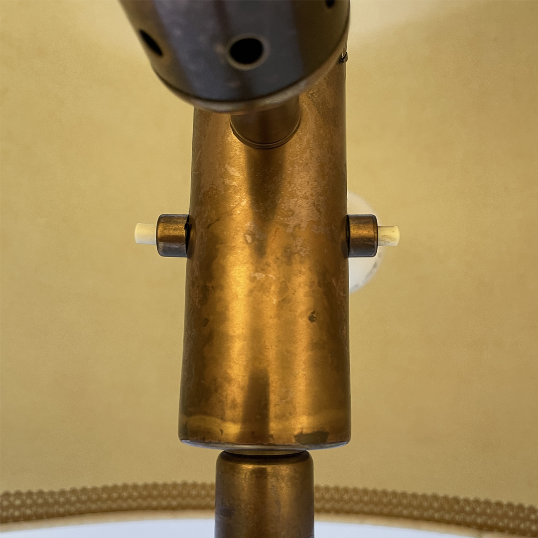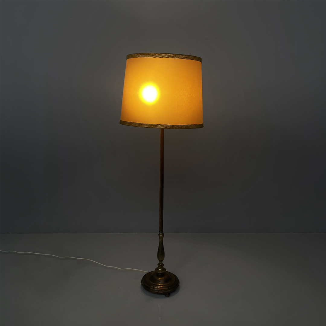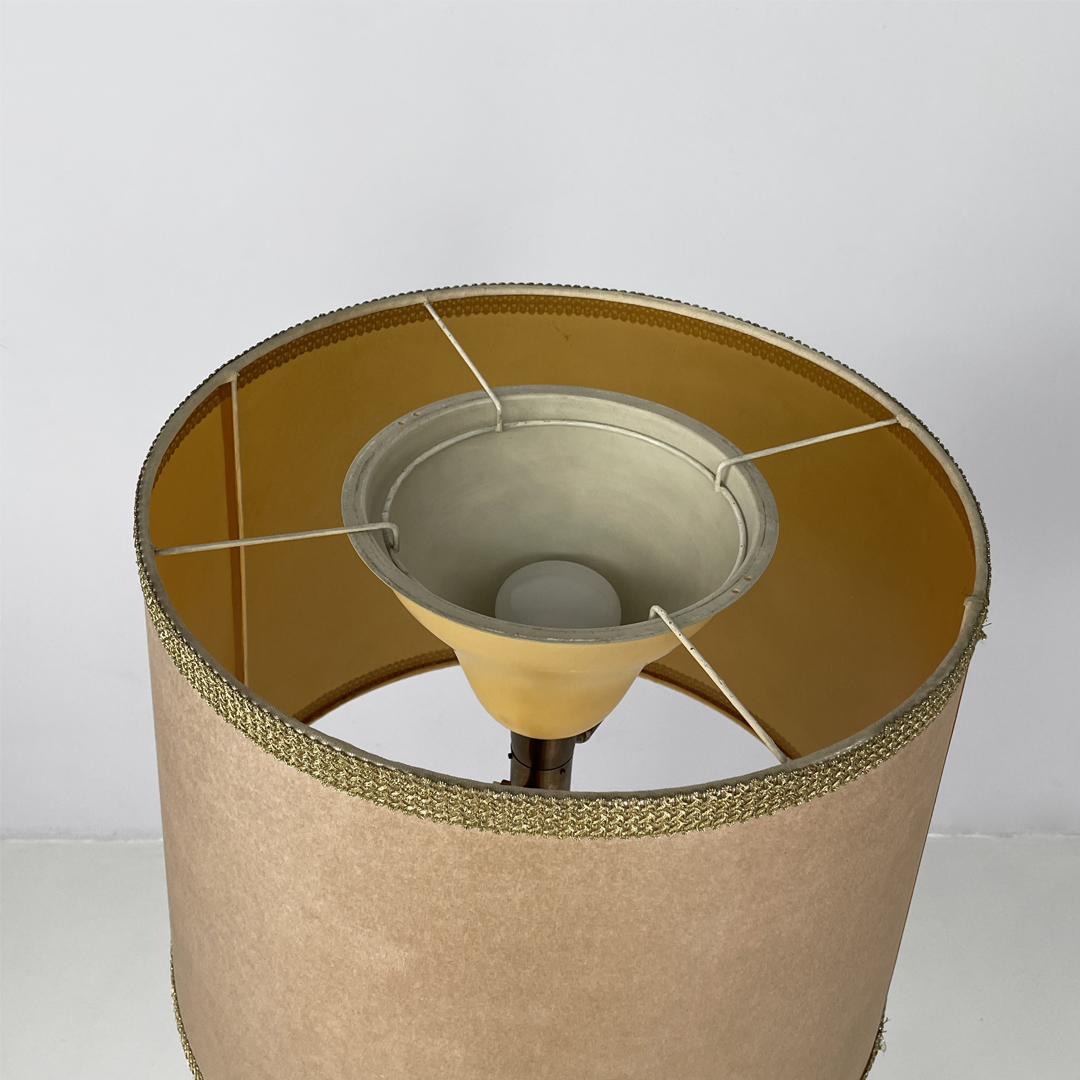 Lampada da terra con paralume a base tonda in carta rosa chiaro con passamaneria oro sui bordi. Lo stelo centrale è rivestito in velluto marrone scuro. Base tonda in ottone con piedini. La lampada presenta tre fonti luminose, due sui lati e un sopra. Le 3 lampadine presentano accensioni indipendenti grazie a due interruttori separati. Art Deco.