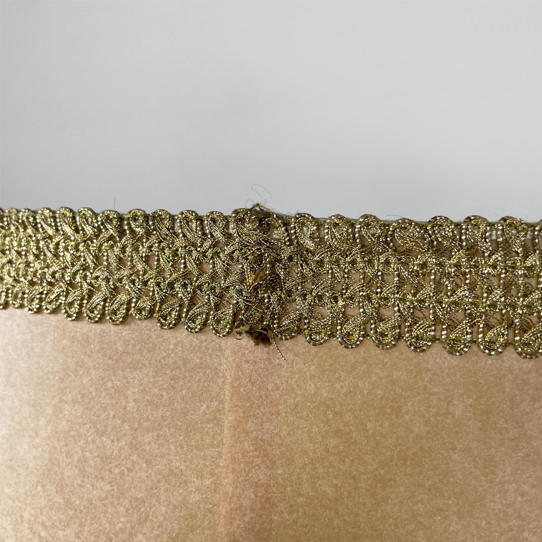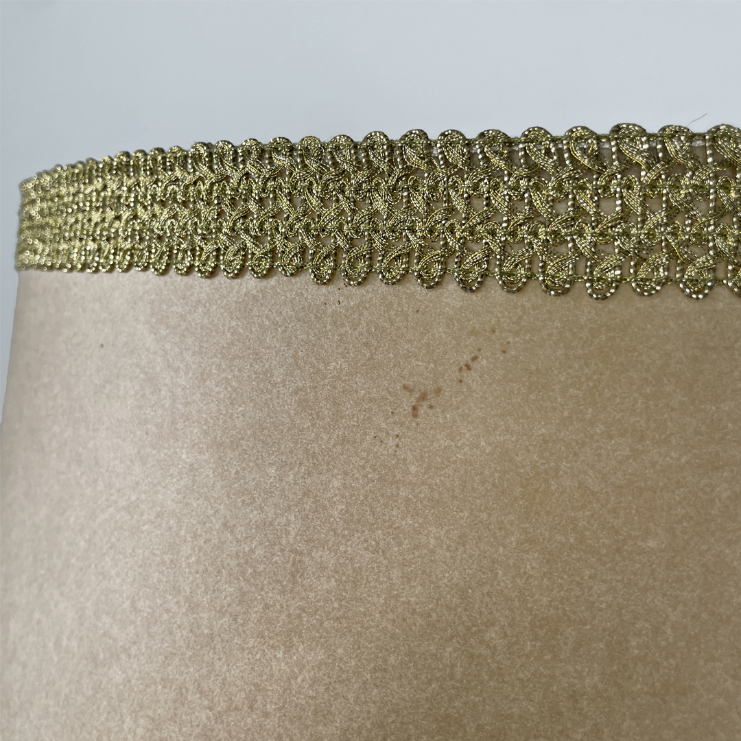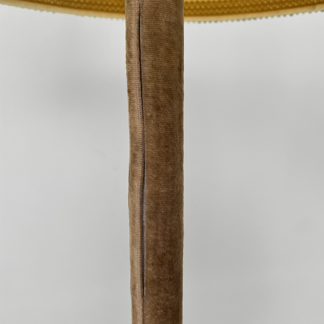 Lampada da terra con paralume a base tonda in carta rosa chiaro con passamaneria oro sui bordi. Lo stelo centrale è rivestito in velluto marrone scuro. Base tonda in ottone con piedini. La lampada presenta tre fonti luminose, due sui lati e un sopra. Le 3 lampadine presentano accensioni indipendenti grazie a due interruttori separati. Art Deco.
