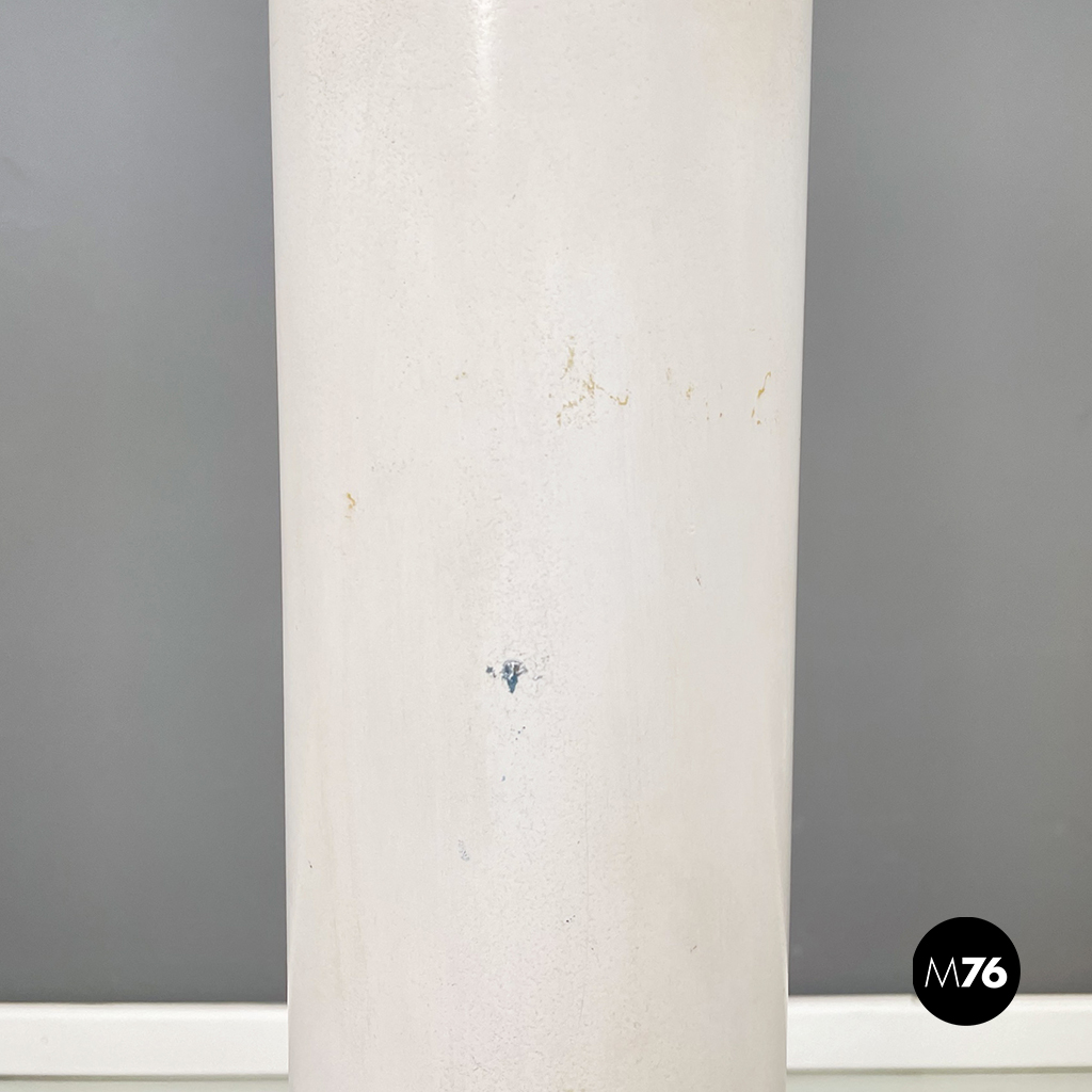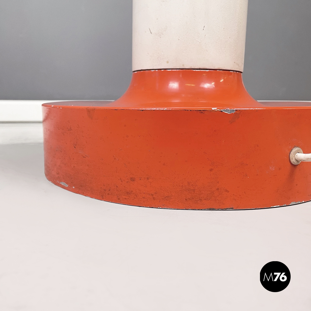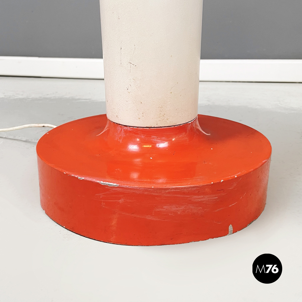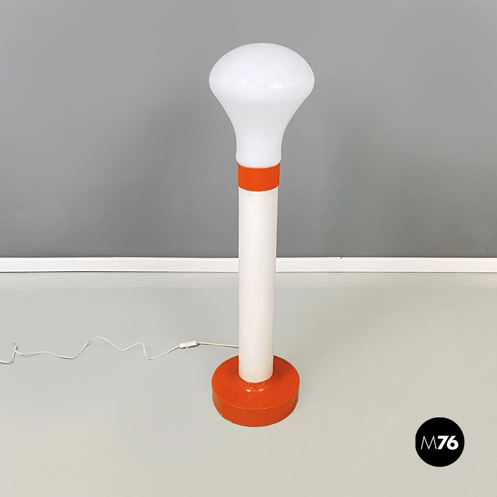 Lampada da terra con vetro opalino e struttura in metallo color bianco e arancione.