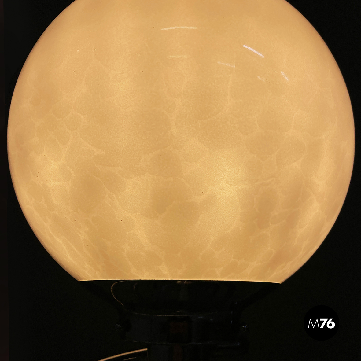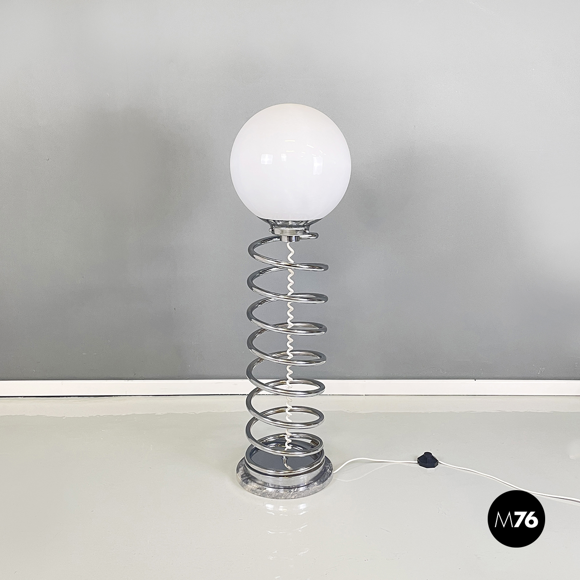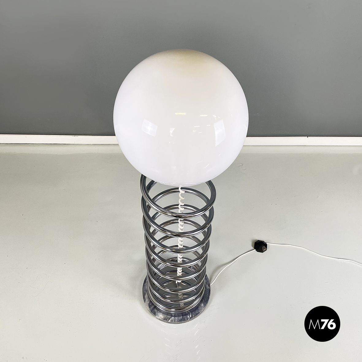 Lampada da terra con diffusore sferico in vetro opalino con decorazione interna, visibile solo da accesa. La struttura centrale è in tubolare di metallo a forma di molla. Base tonda in marmo grigio.