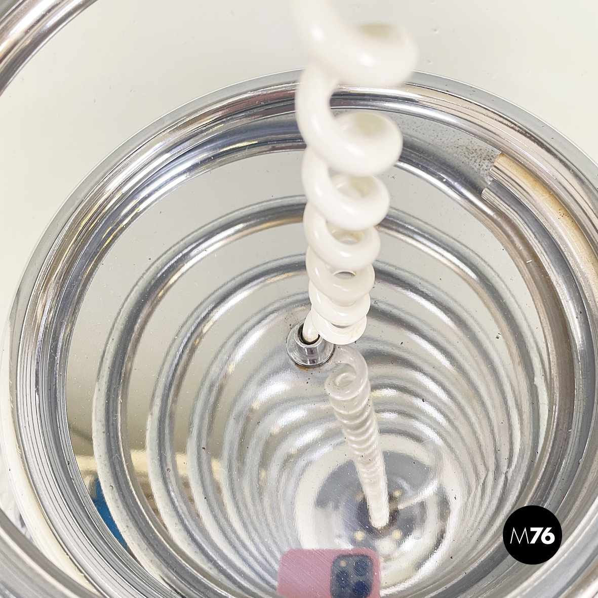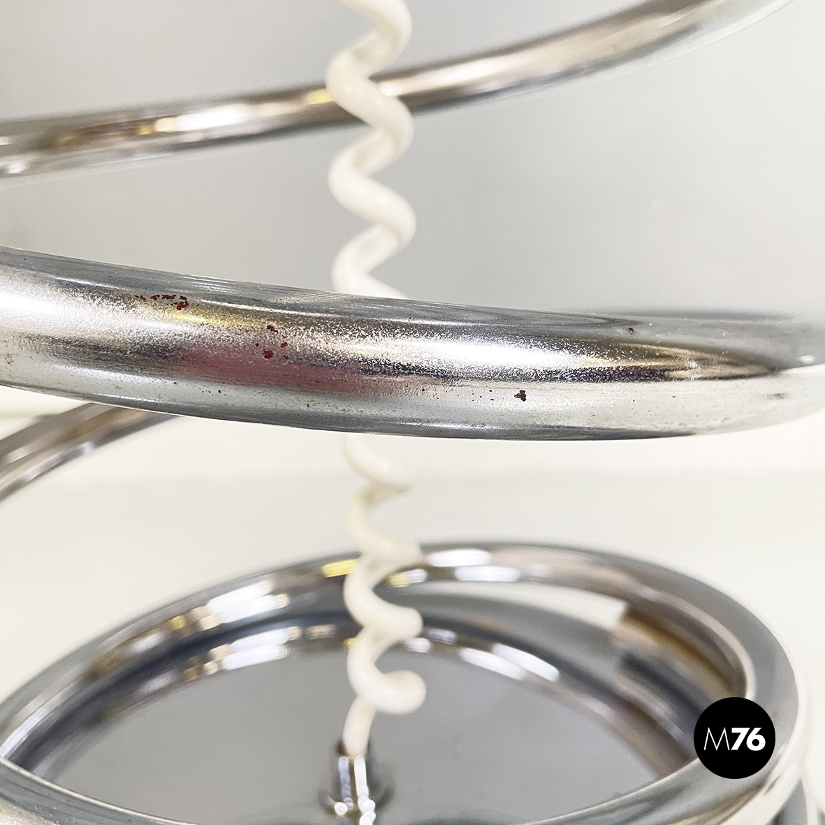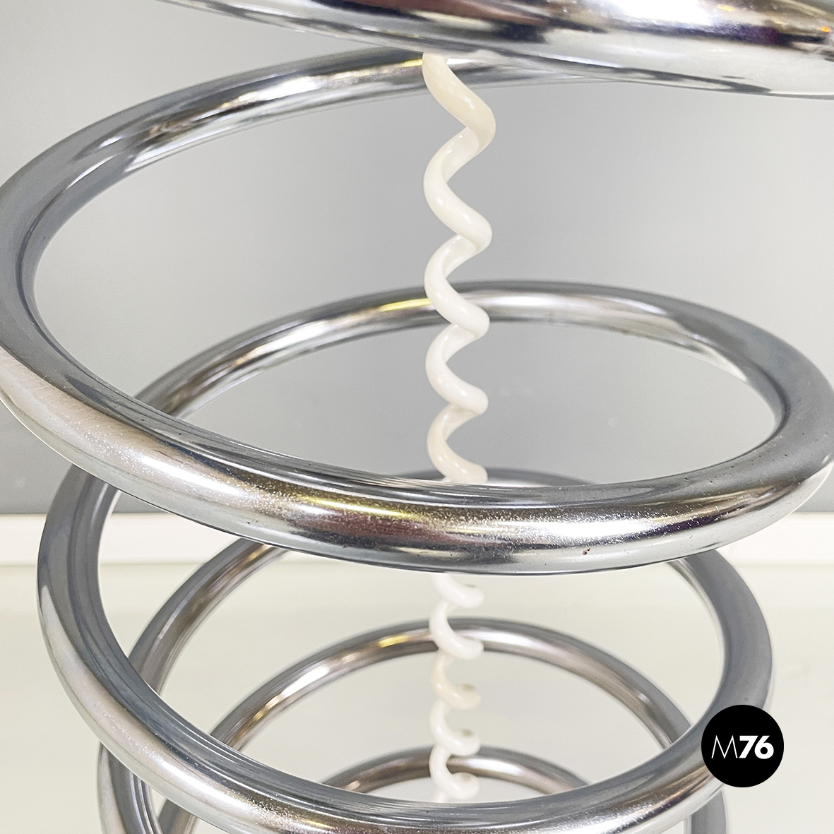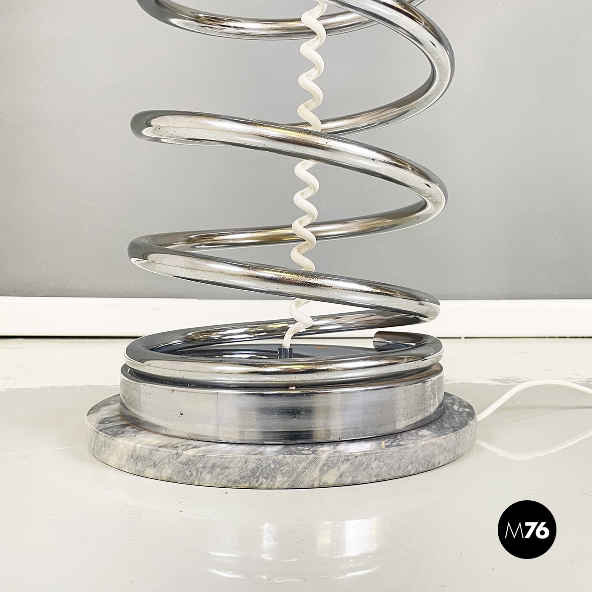 Lampada da terra con diffusore sferico in vetro opalino con decorazione interna, visibile solo da accesa. La struttura centrale è in tubolare di metallo a forma di molla. Base tonda in marmo grigio.