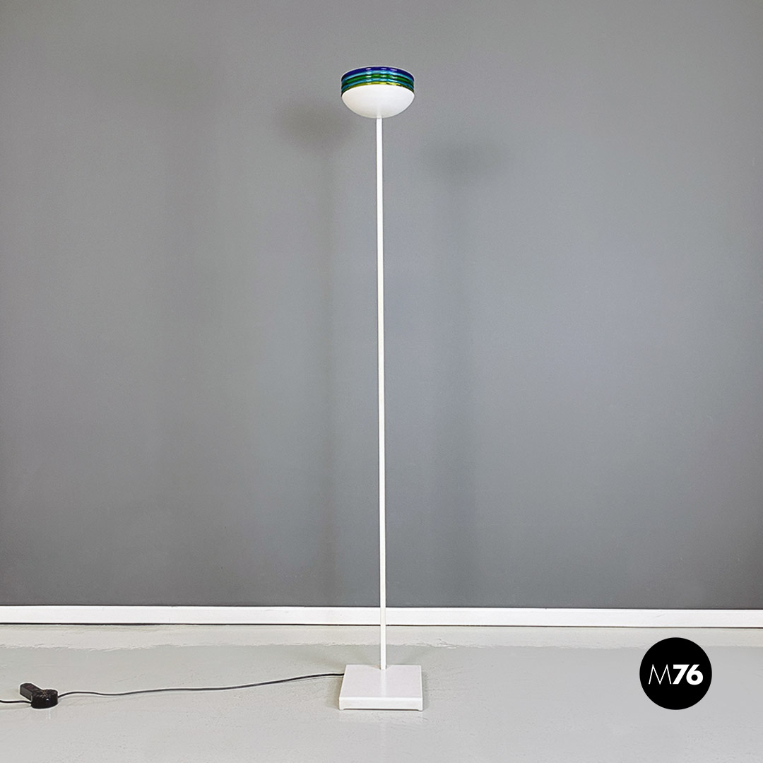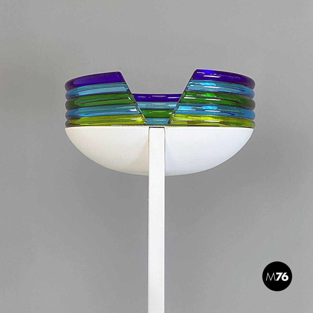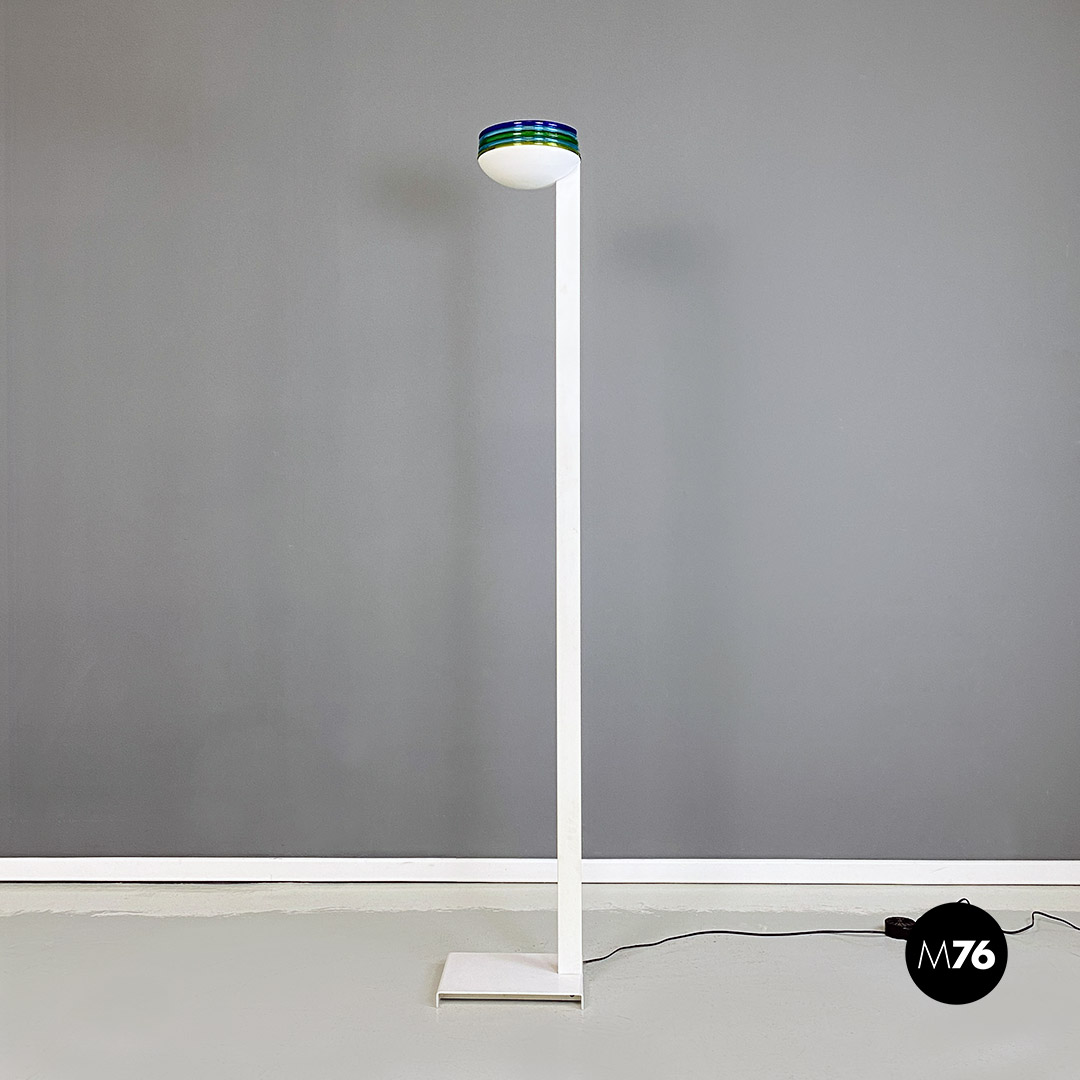 Lampada da terra alogena modello L670 con struttura in metallo bianco opaco, diffusore multicolore in vetro di Murano e base di forma rettangolare. Interruttore originale con dimmer.