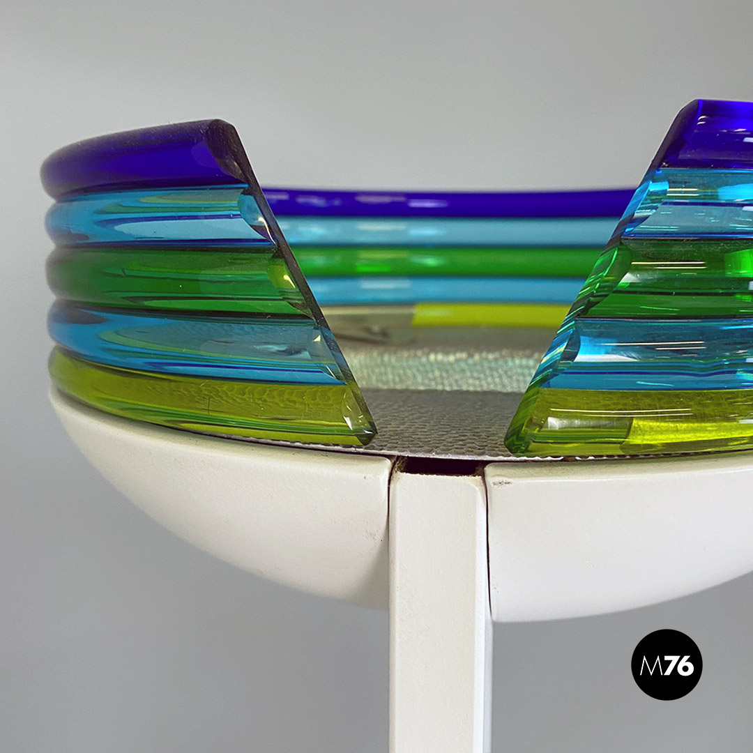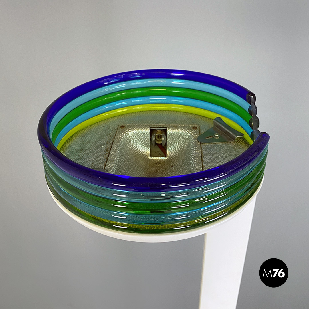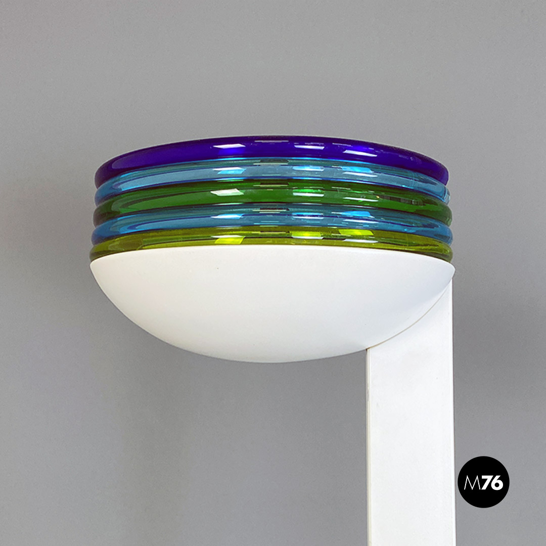 Lampada da terra alogena modello L670 con struttura in metallo bianco opaco, diffusore multicolore in vetro di Murano e base di forma rettangolare. Interruttore originale con dimmer.