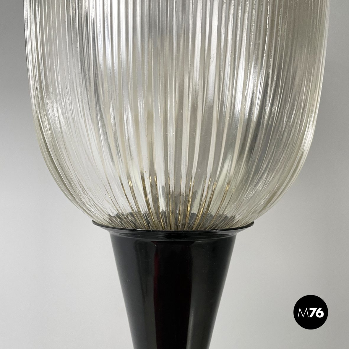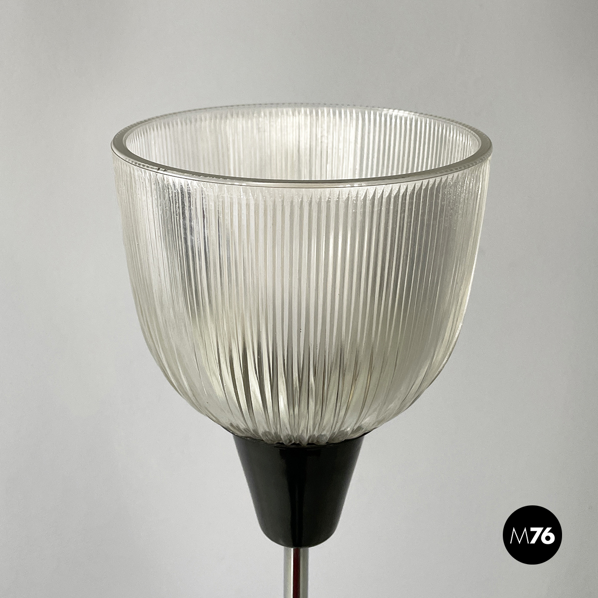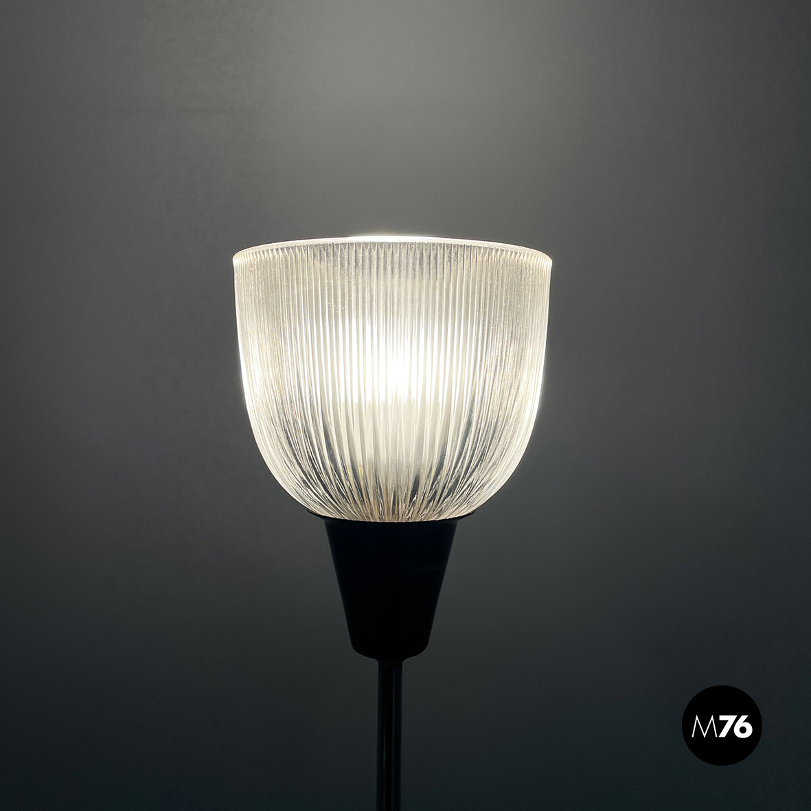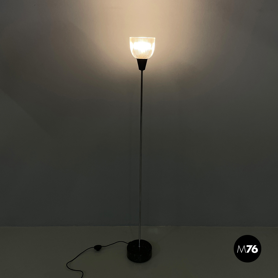 Lampada da terra modello LTE6 con diffusore a cupola in vetro prismatico e metallo verniciato nero. La struttura è in tondino di acciaio. La base tonda è in marmo nero.