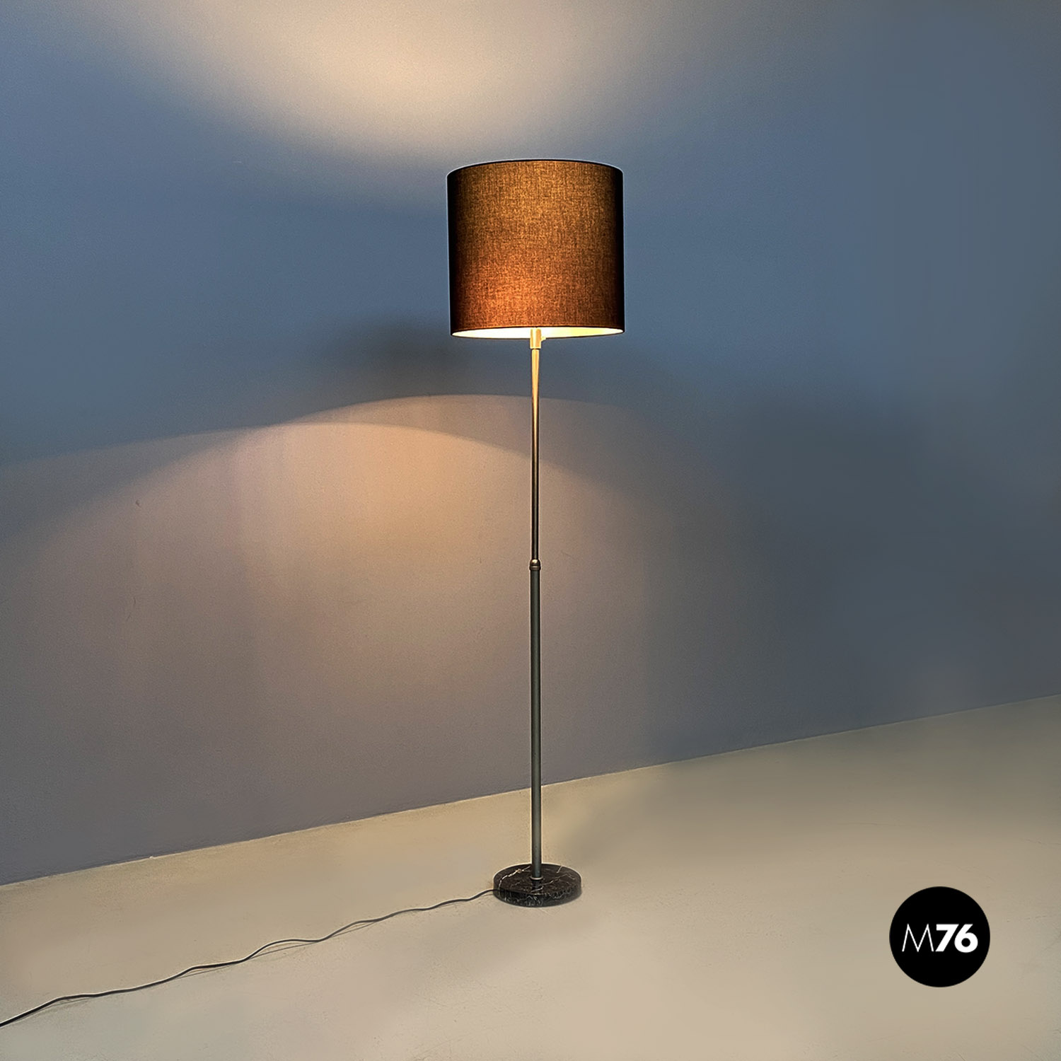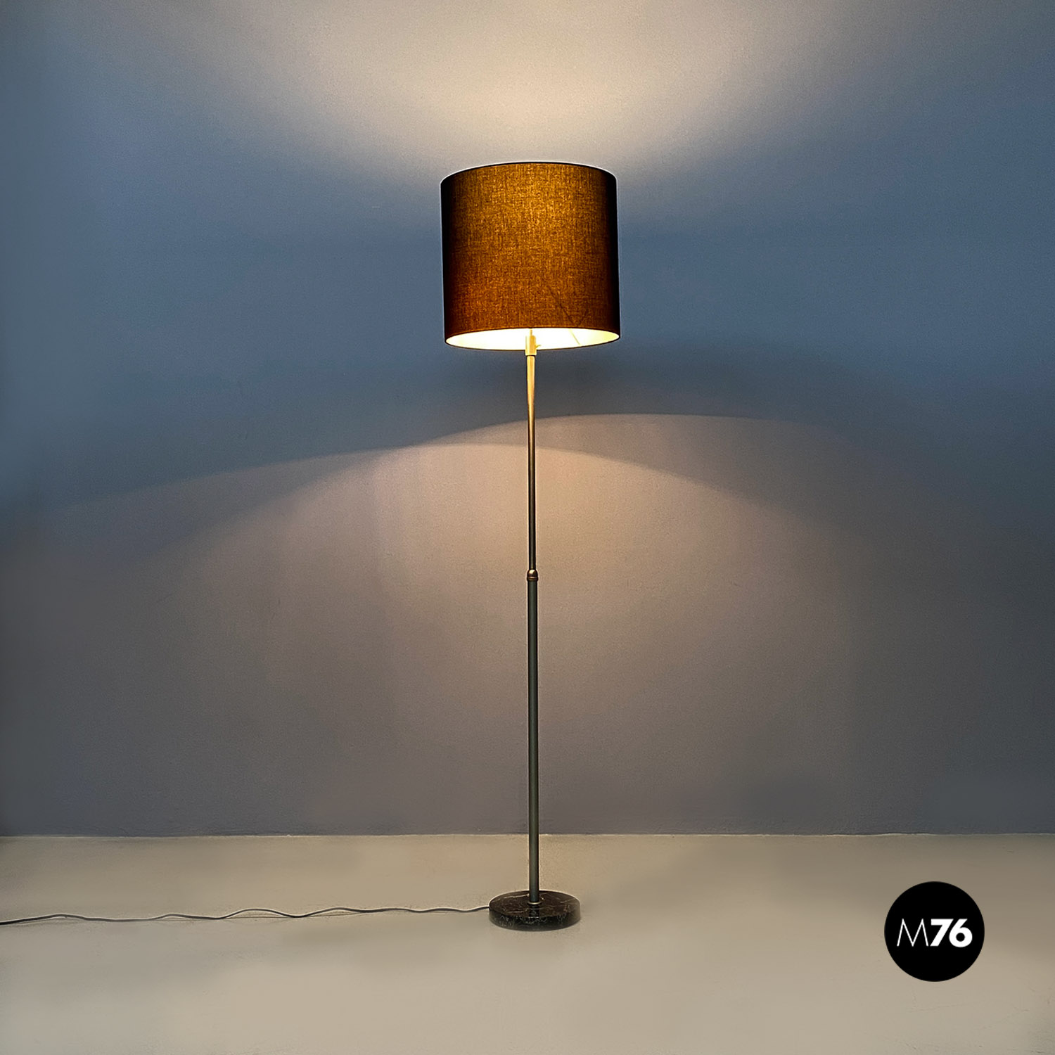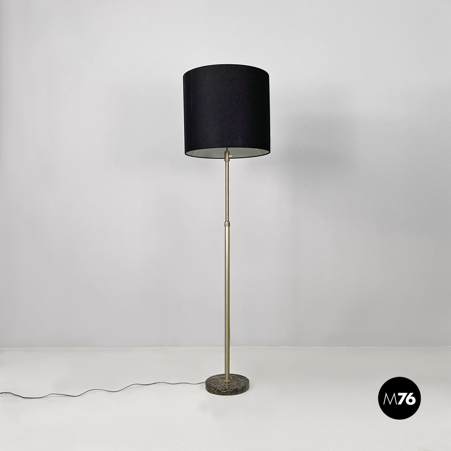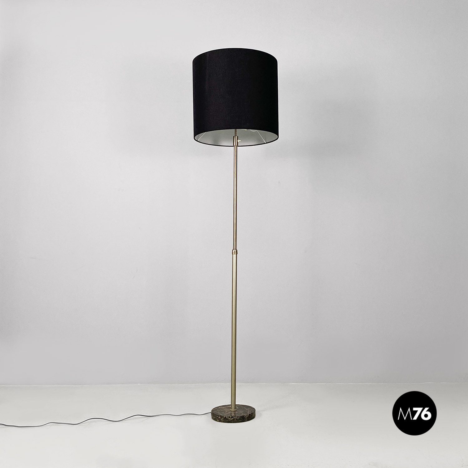 Lampada da terra regolabile con paralume cilindrico in tessuto nero con struttura telescopica in acciaio satinato e base in marmo di Marquinia.