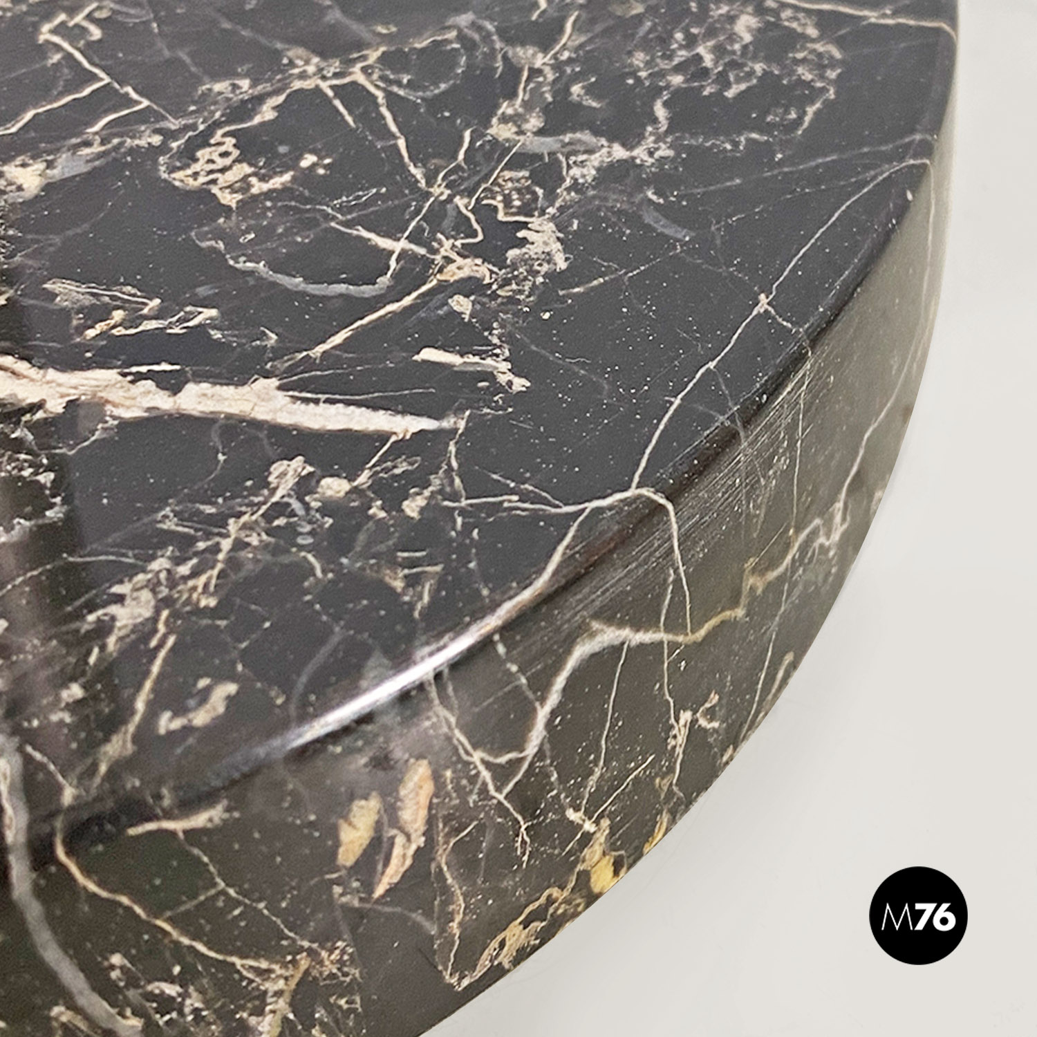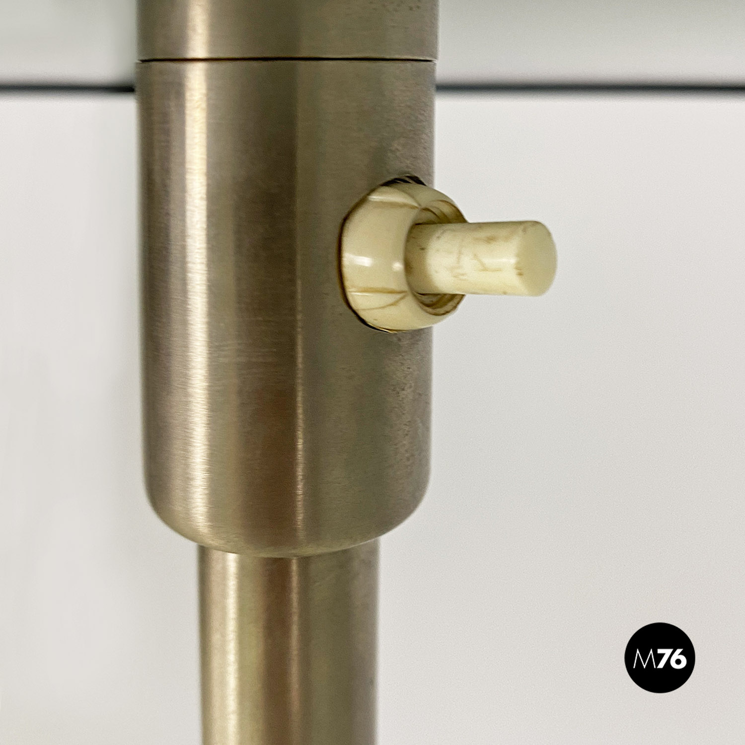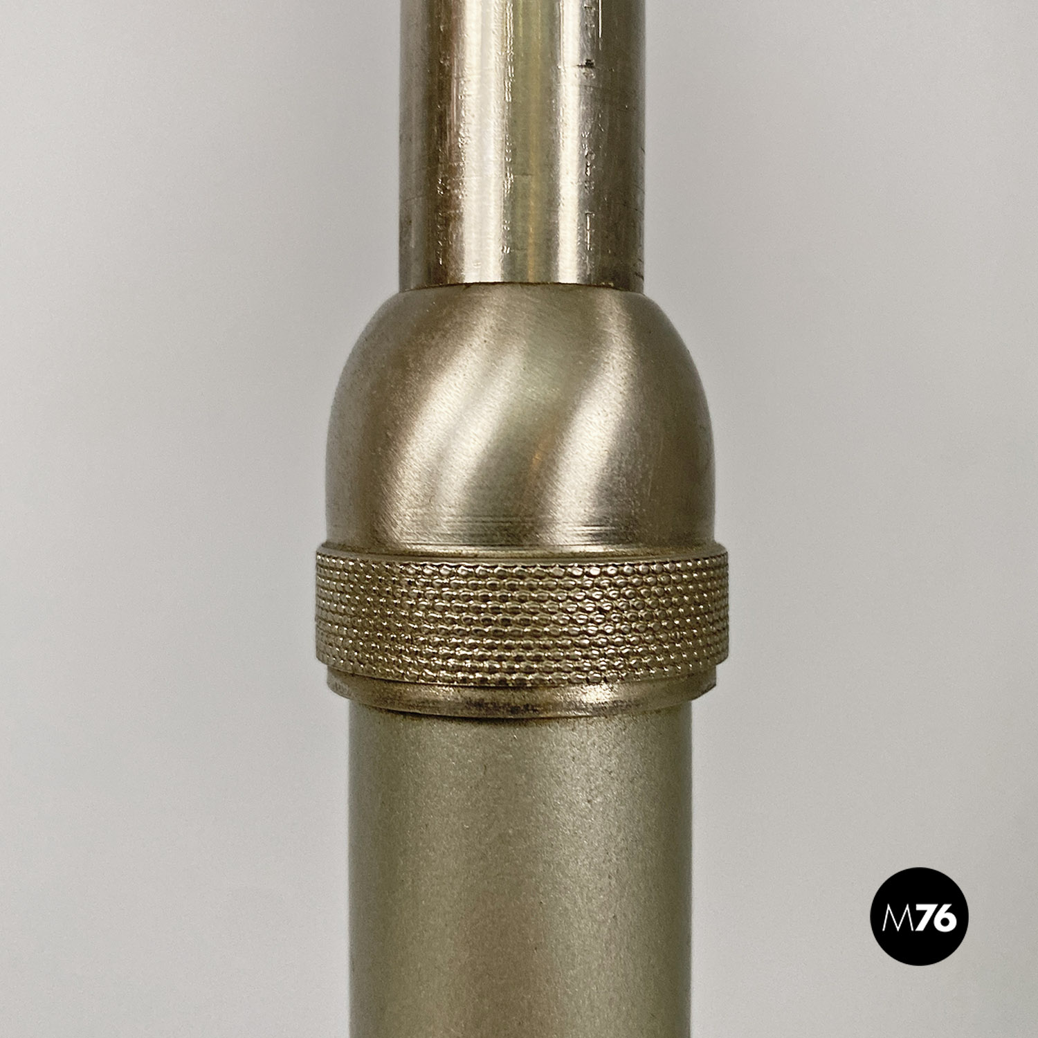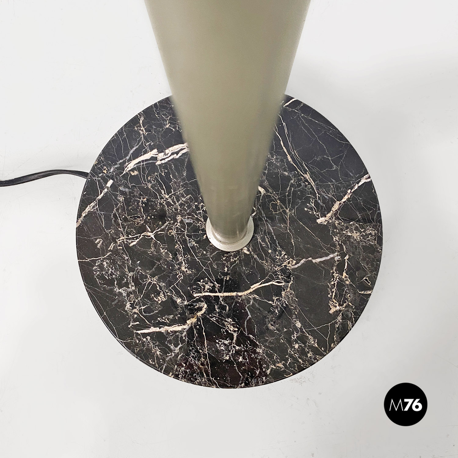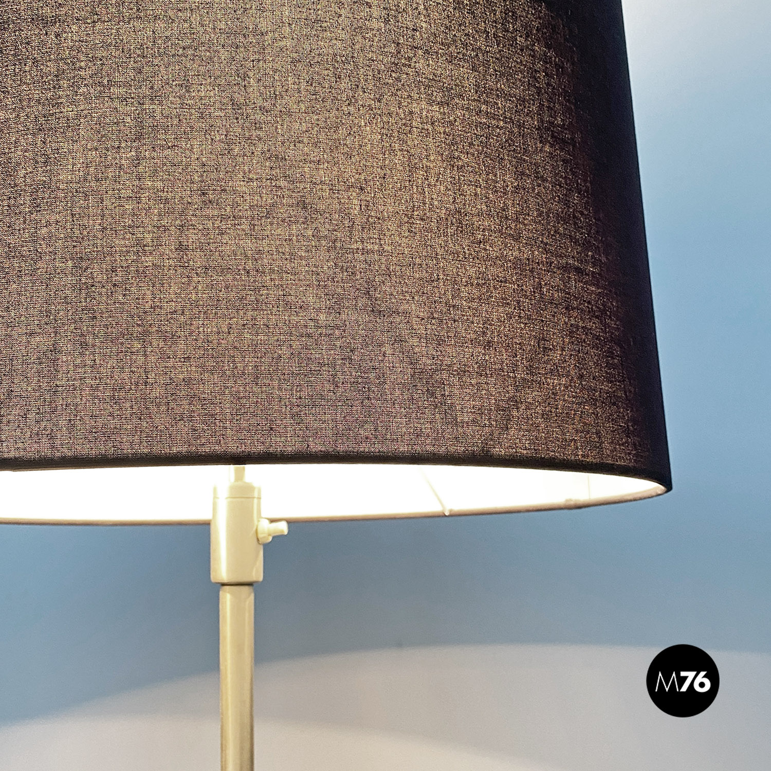 Lampada da terra regolabile con paralume cilindrico in tessuto nero con struttura telescopica in acciaio satinato e base in marmo di Marquinia.