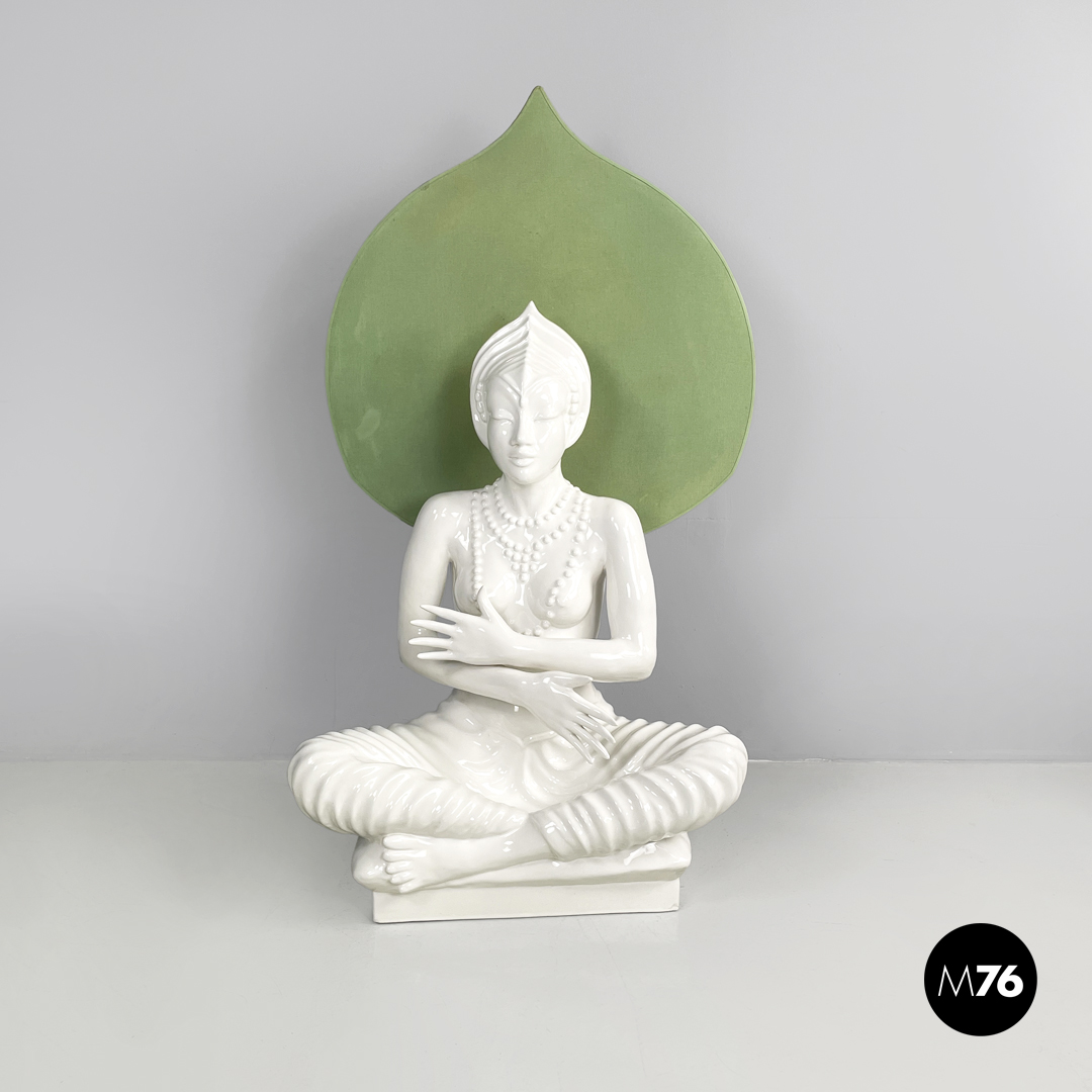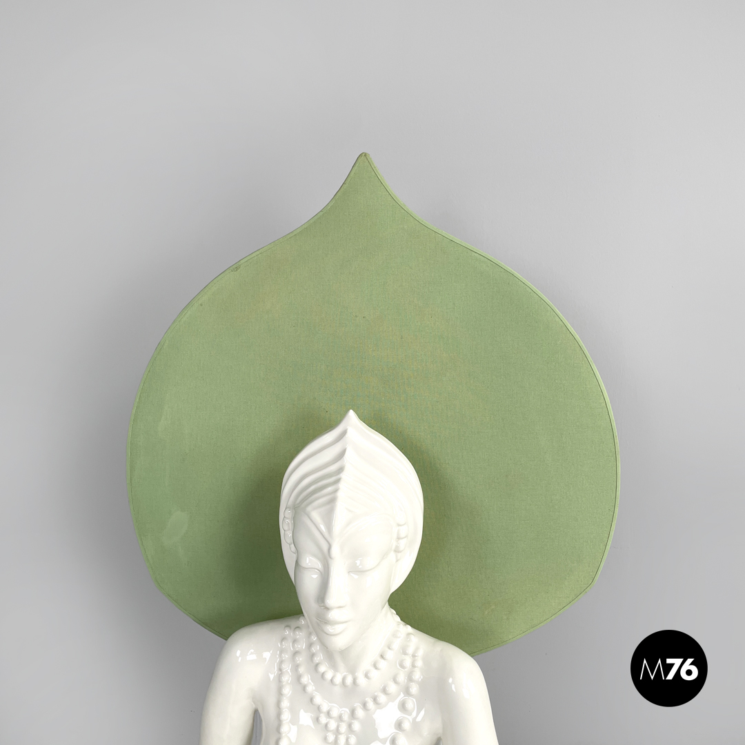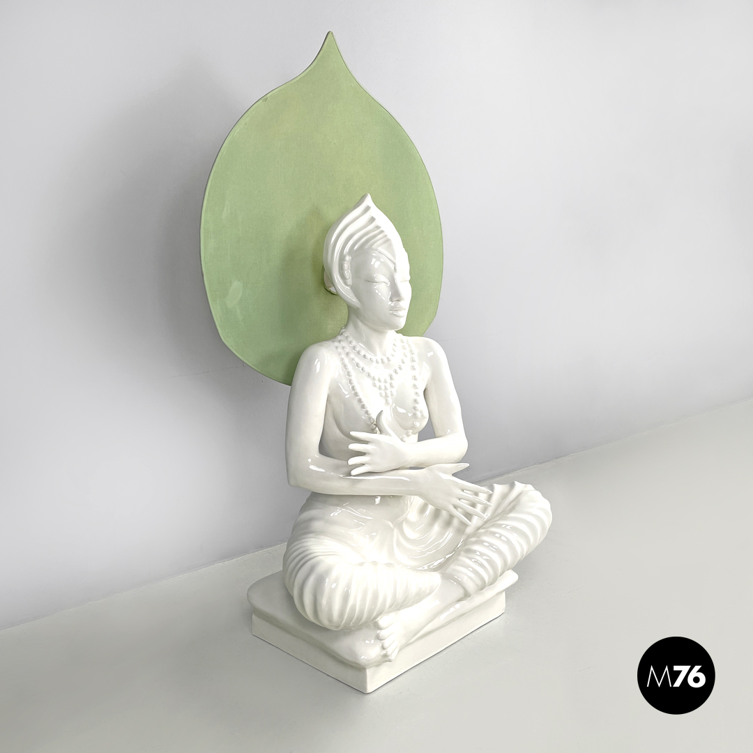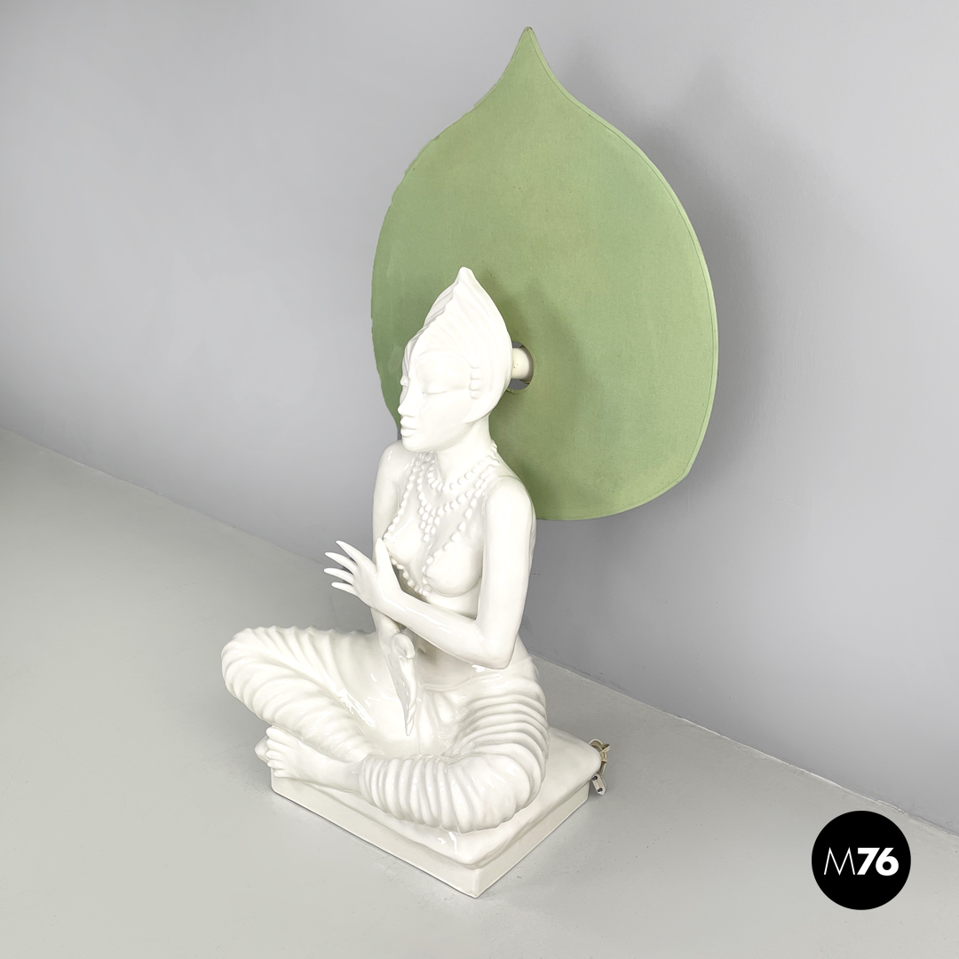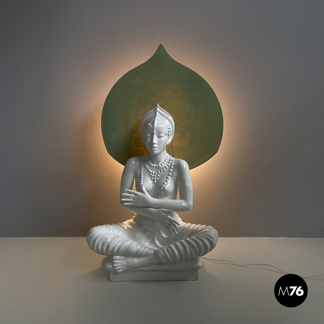 Lampada da terra in ceramica bianca con finitura lucida. La struttura è una scultura di forma umana che ricorda una divinità orientale, seduta a gambe incrociate, decorata con un copricapo e delle collane. Presenta un paralume in tessuto verde a forma di foglia che si erge dietro la testa e le spalle della figura “incorniciandola”. La figura poggia su una base rettangolare.