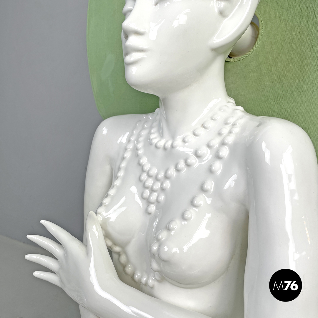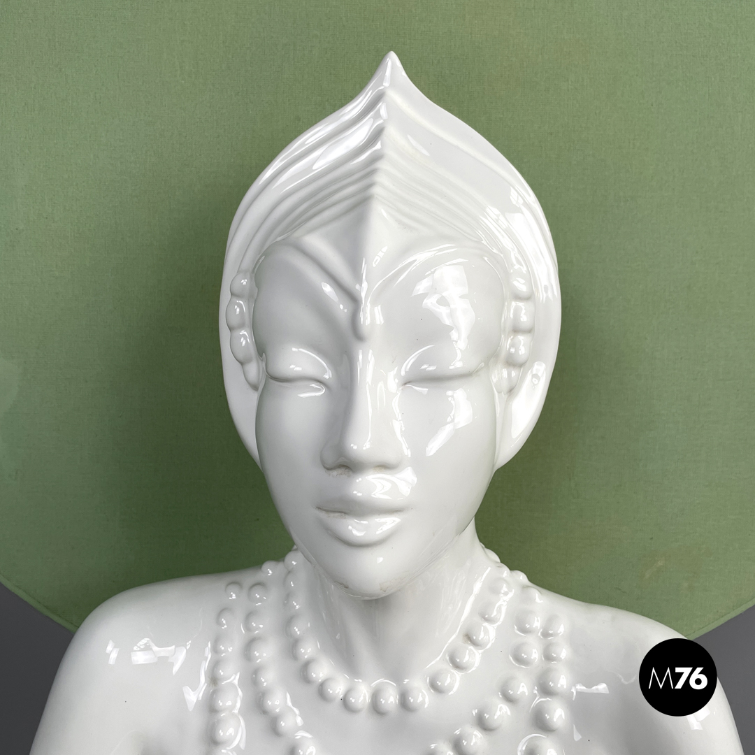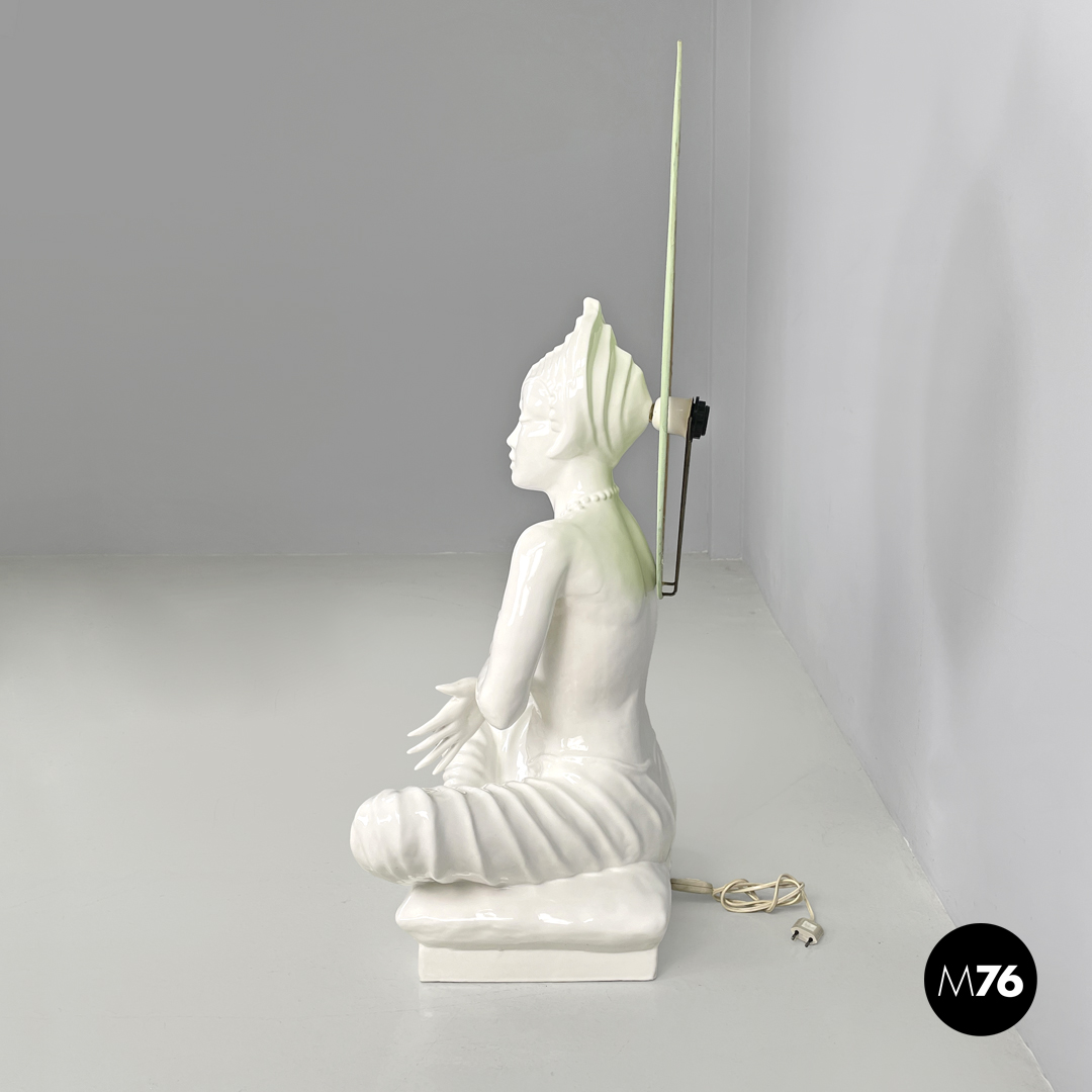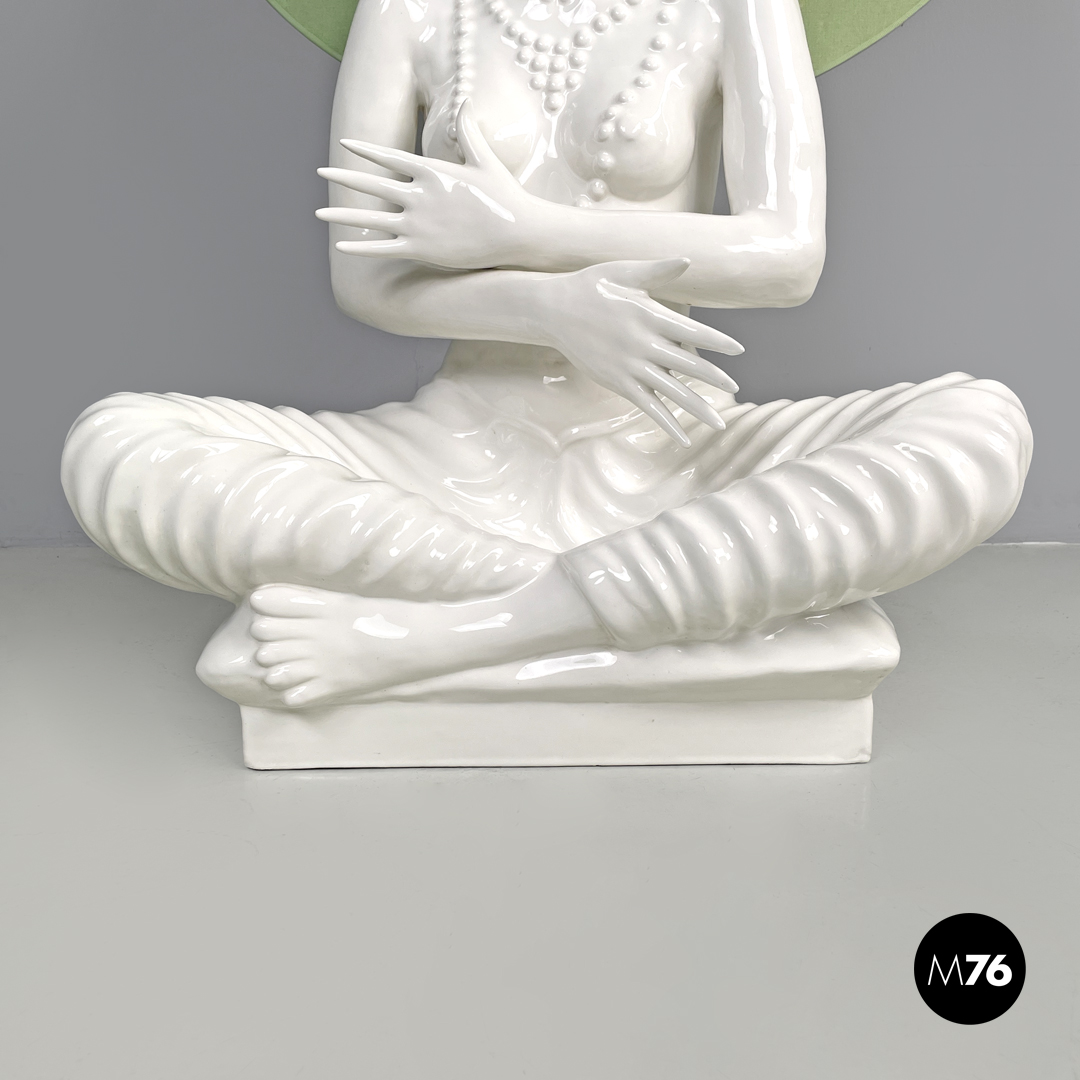 Lampada da terra in ceramica bianca con finitura lucida. La struttura è una scultura di forma umana che ricorda una divinità orientale, seduta a gambe incrociate, decorata con un copricapo e delle collane. Presenta un paralume in tessuto verde a forma di foglia che si erge dietro la testa e le spalle della figura “incorniciandola”. La figura poggia su una base rettangolare.