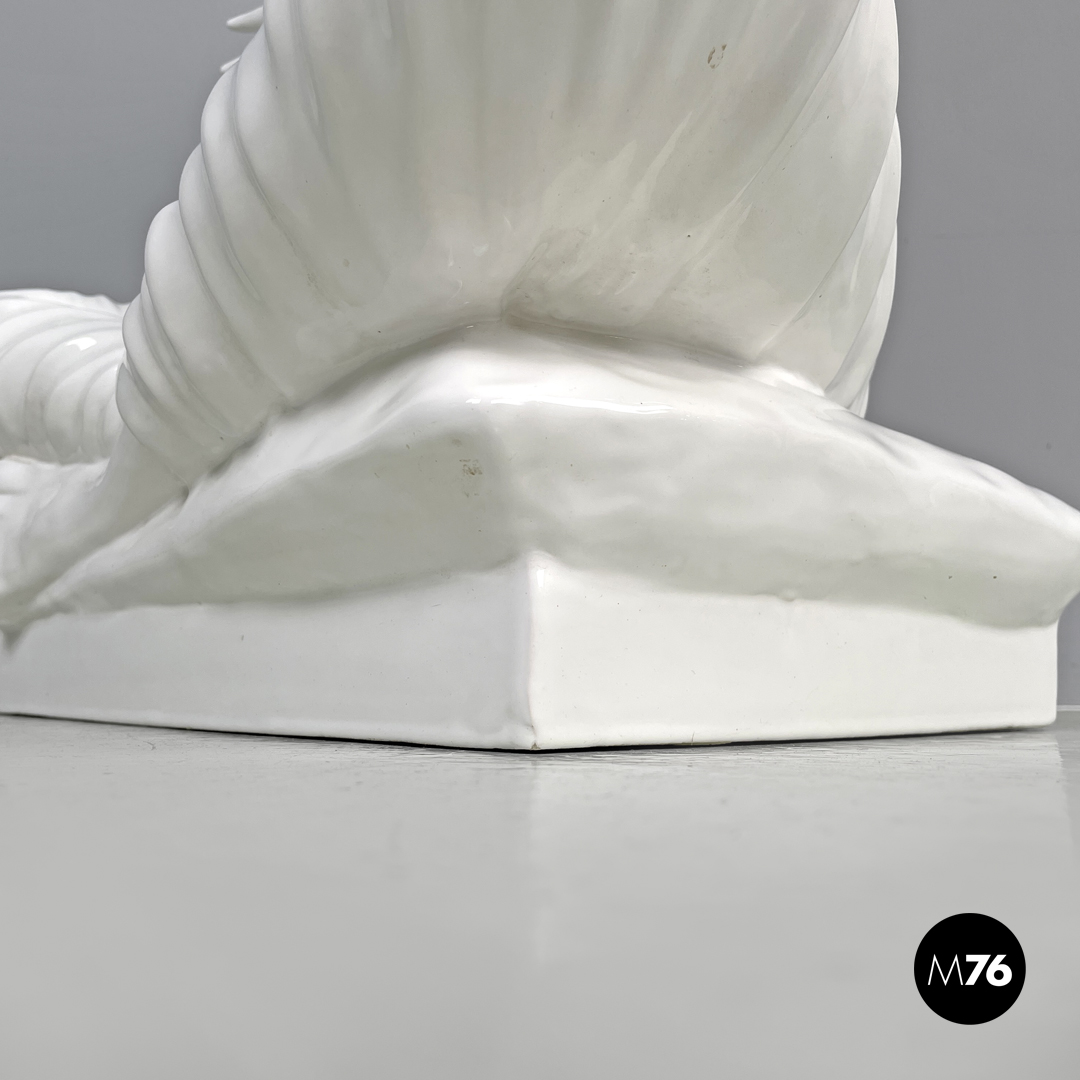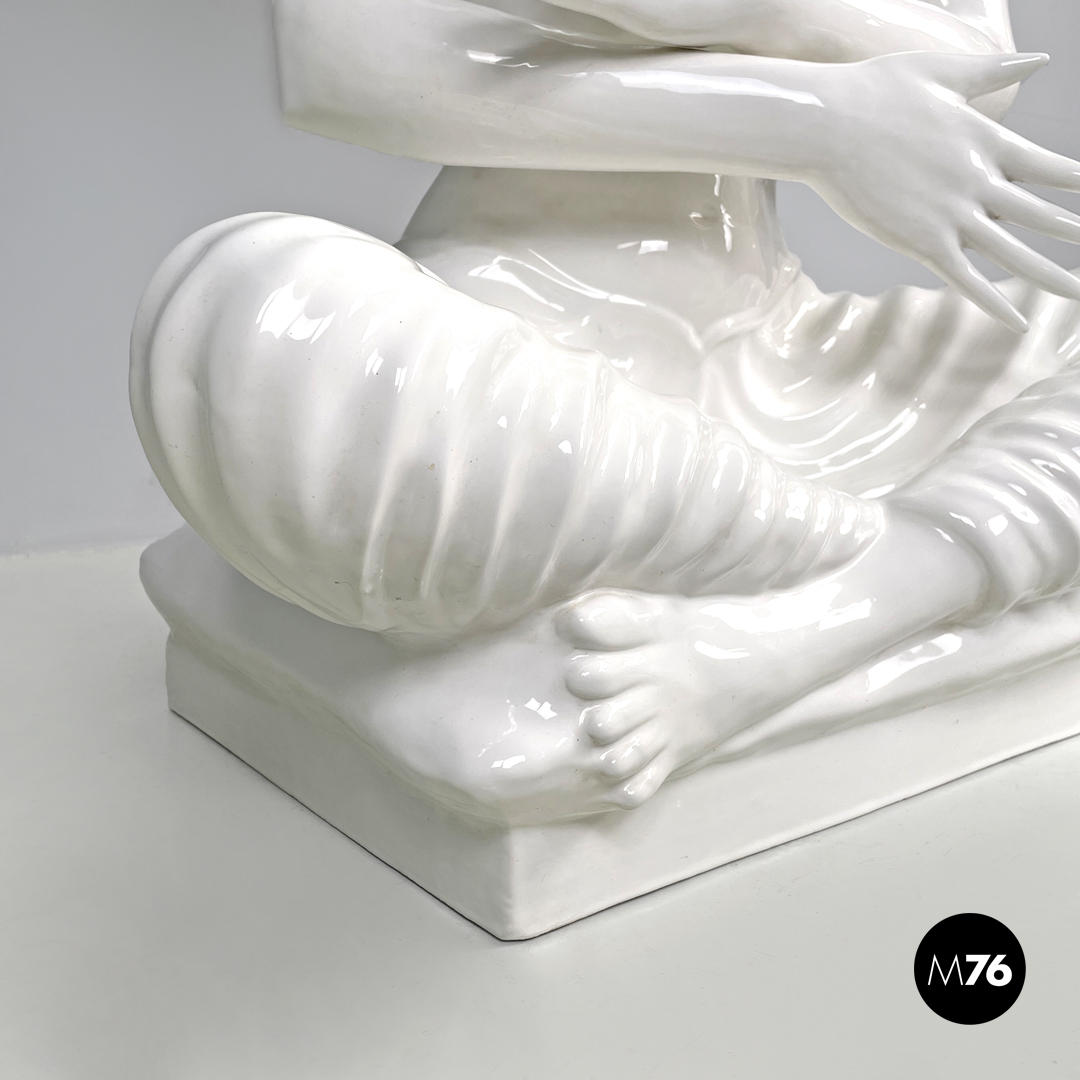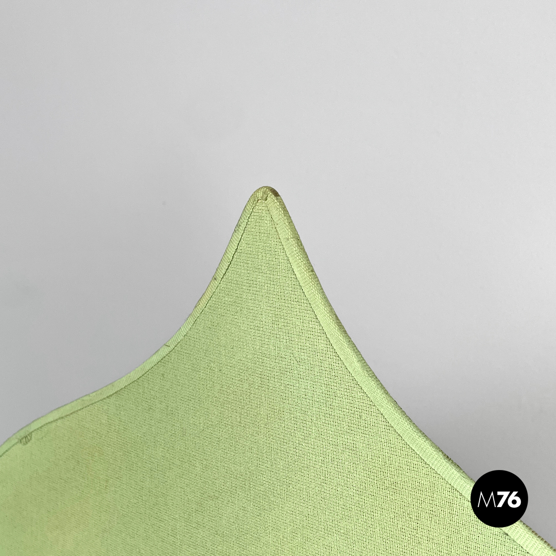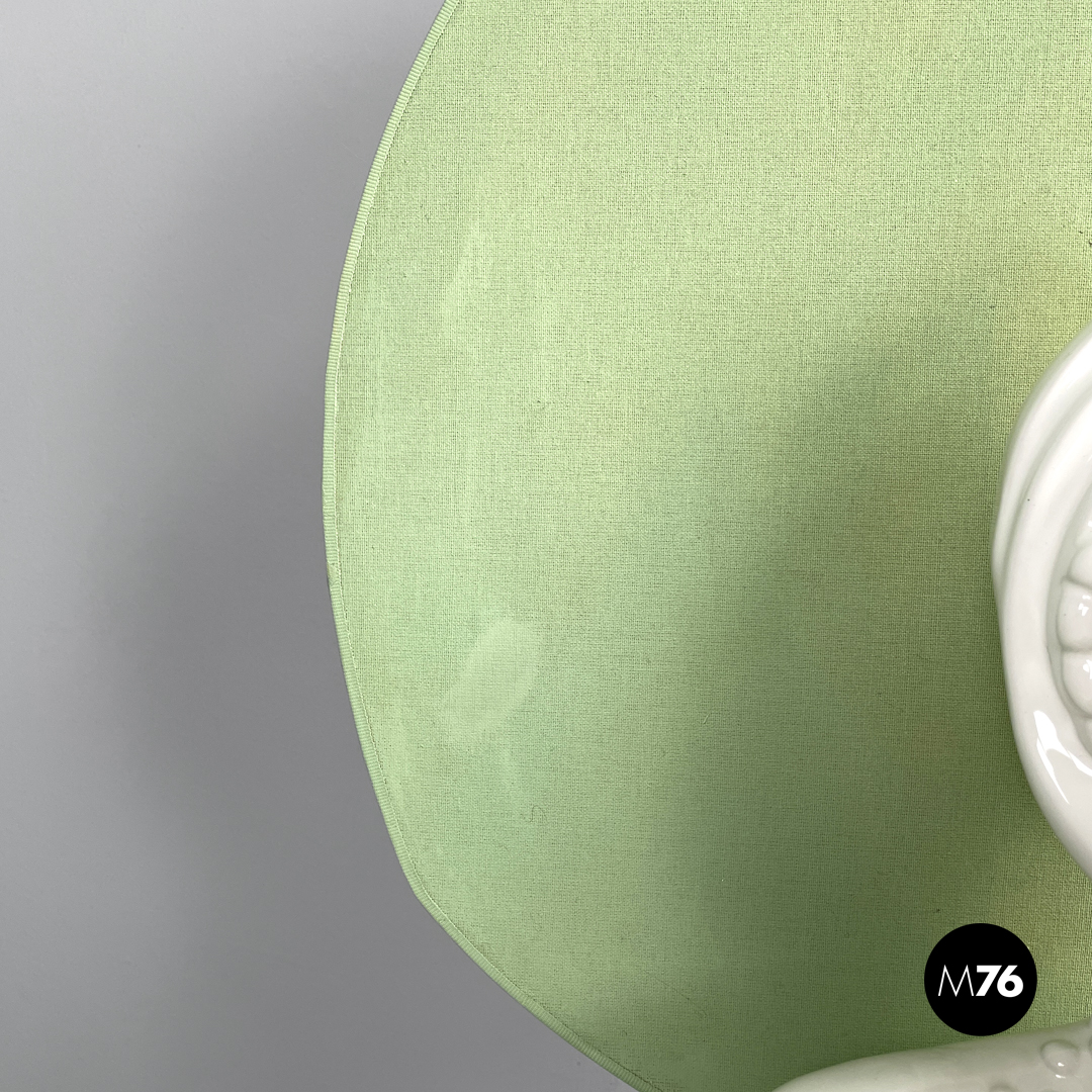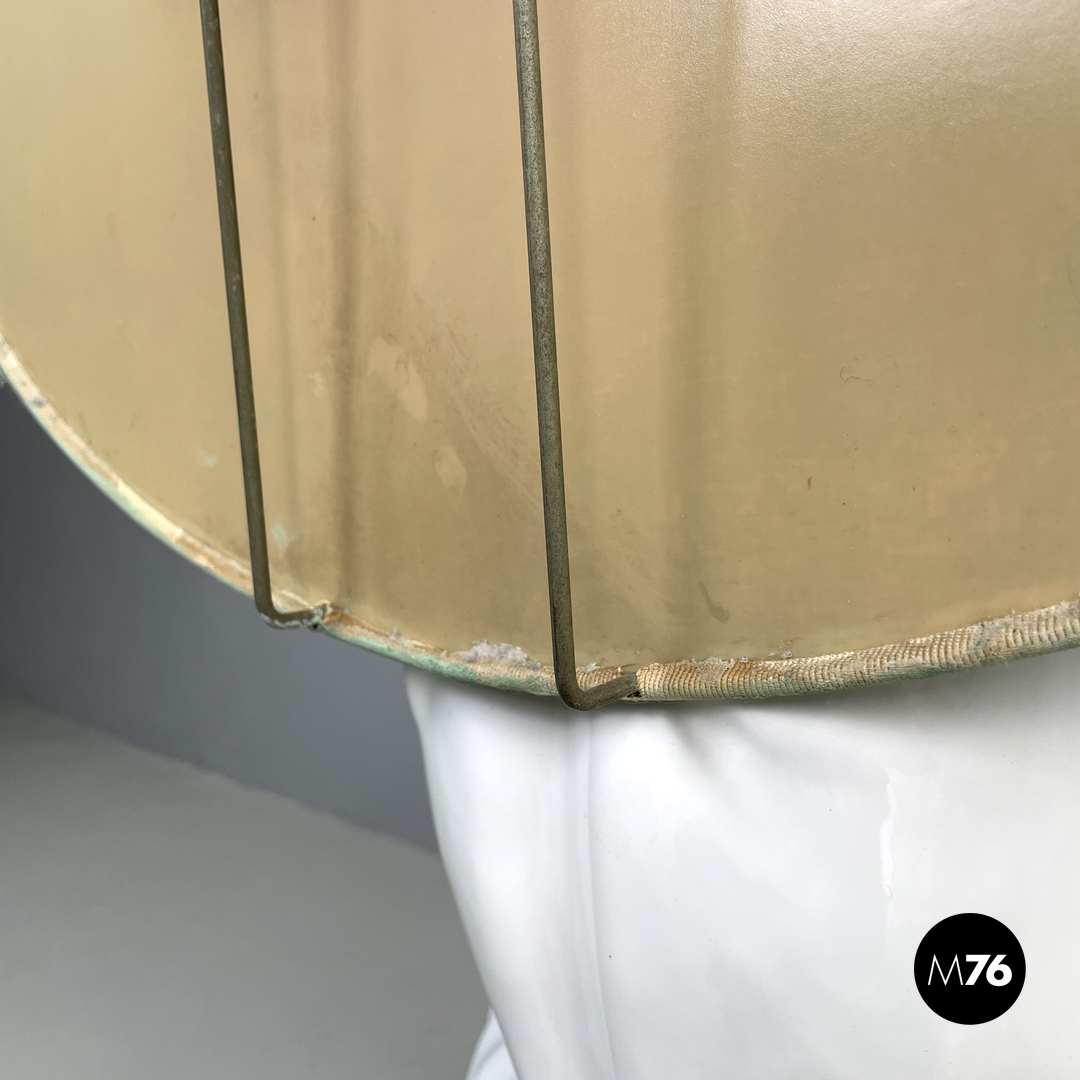 Lampada da terra in ceramica bianca con finitura lucida. La struttura è una scultura di forma umana che ricorda una divinità orientale, seduta a gambe incrociate, decorata con un copricapo e delle collane. Presenta un paralume in tessuto verde a forma di foglia che si erge dietro la testa e le spalle della figura “incorniciandola”. La figura poggia su una base rettangolare.