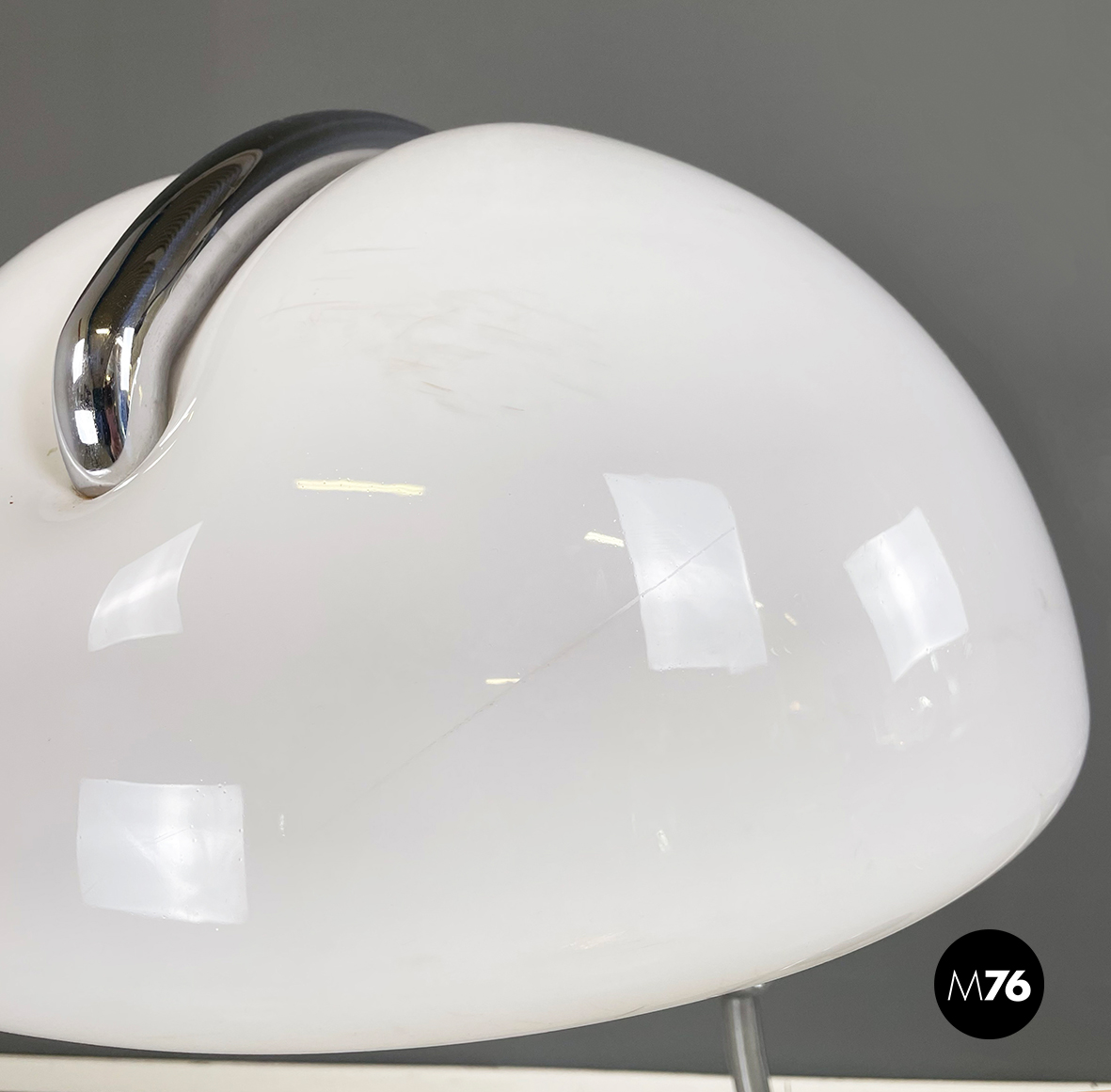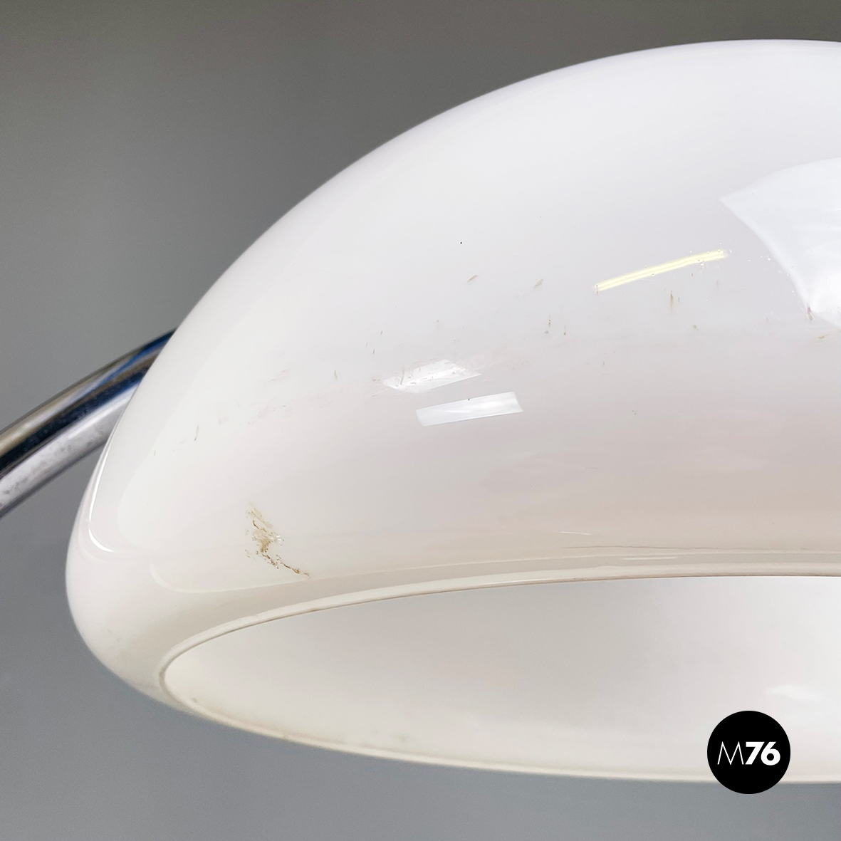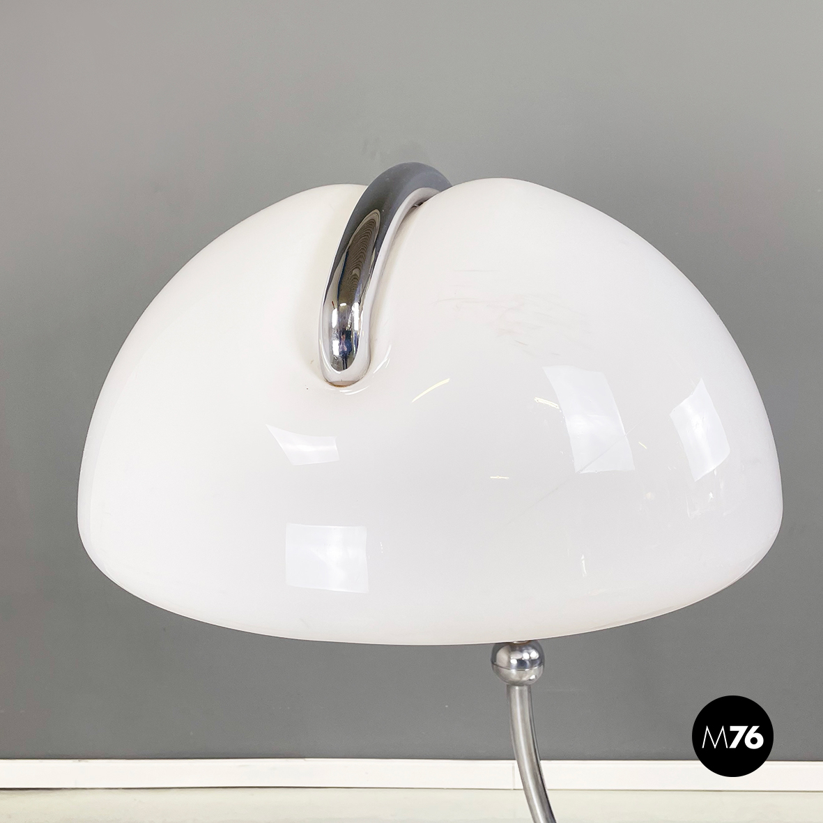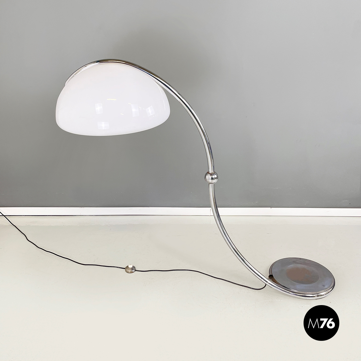 Lampada da terra modello 2131 Serpente con struttura orientabile in tubolare di metallo. Il paralume semi-sferico è in plexiglass opalino. La struttura tondeggiante presenta nel mezzo il perno per poter ruotare il paralume a 360 gradi. La base tonda è in metallo.